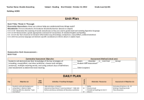 Teacher Name :Rosalie Kesselring Subject : Reading Start Date(s): October 14, 2014 Grade Level (s):4th Building :HEMS Unit Plan Unit Title: Think it Through Essential Questions: How can science help you understand how things work? Standards: PA Core Standards, PA Academic Standards/Anchors (based on subject) C.C.1.2.4.F Determine the meaning of words and phrases as they are used in grade level text including figurative language. C.C.1.4.11F Demonstrate a grade appropriate command of conventions of standard English and Spelling C.C. 1.2.4.E Use Text structure to interpret information (e.g.chronology, comparison, cause/effect, problem/solution) C.C.1.44.E Use precise language and domain specific vocabulary to inform about or explain topic. Summative Unit Assessment : Unit Test Summative Assessment Objective Students will-demonstrate their knowledge of the key strategies of rereading, cause/effect, narrative nonfiction, clauses and complex sentences, multiple meaning words, and using context clues of definitions and restatement to determine text meaning. Assessment Method (check one) ____ Rubric ___ Checklist __X__ Unit Test ____ Group ____ Student Self-Assessment ____ Other (explain) Day 1 Objective (s) Students will-build background using Ideas in Motion Apply listening skills for selection “Look Out Below!” DOK LEVEL 1 1 Activities / Teaching Strategies T202-203 Ideas in Motion Interactive Read Aloud “Look Out Below!” T204-205 Define and discuss attributes of Narrative nonfiction. Grouping DAILY PLAN W W Materials / Resources RWW Practice book Printed out Spelling list Unit 1 Week 4 Assessment of Objective (s) Formative-Practice p. 31, 37 Writing of Spelling words Class discussion 2 3 4 Define and discuss attributes of Narrative nonfiction. Apply characteristics to selections. Define/Ask/Apply vocabulary terms Words in Context T206-207 Read and answer Practice 36 Science in the Soda Bottle Spelling with the Long I T228 2 Students will-review vocabulary Words in Context T207-208. Close read “The Big Race” Sequence story plot. Use reread strategieT210-211 plus Cause and Effect skills T212-213, T216-217 Sort spelling words by long I vowel spelling. 1 Students will-close read and answer comprehension questions to A Firehouse Lesson Prac p 33-35 Correctly add inflectional endings –ing and –ly to long I words to create new words according to the definition of the suffix. Level read George’s Giant Wheel. Identify important effects, complex sentences, and cause and effect.T238-T245 according. to ability. Review the concept of multiple meaning words.T230 Locate multiple meaning words in passages. Put spelling words in alphabetical order. 2 Students will-close read A Crash Course in the Forces of Motion with Max Axiom p. 62-79 Practice grammar using complex sentences and clauses that have a 1 1 1 2 2 1 1 2 Apply characteristics to reading selections by citing text evidence. Define/Ask/Apply Words in Context T207-207, followed by Your Turn p.31: accelerate, advantage, friction, gravity, identity, inquiry, thrilling Have students read Science in the Soda Bottle and complete Prac p. 37 Introduce spelling words from T228 with long I sound. Review vocabulary. Close read “The Big Race” p 64-67 Sequence story plot on graphic organizer use RWW page 72-72 as a guide Apply strategy of context clues to find text evidence T216-217 Practice p 37 Sort spelling words by the spelling of the long I in the words. Expand vocabulary by creating new words with the same long I spellings and generate a list to write and to read. Read A Firehouse Lesson and complete questions Practice pp 33-35 Define suffix endings –ing and –ly. Apply suffixes on long I words to create new words that fit defined meaning. Use words from spelling list. Using leveled readers in small groups read George’s Giant Wheel. Find important effects, complex sentences, and cause and effect in the text. I SummativeI W W W Student Self - Assessment- RRW Practice book Graphic Organizer G Formative-Oral reading and discussion citing text evidence. Plot on graphic organizer. Practice page 37 Spelling sort paper SummativeStudent Self - Assessment- I W G Practice book Teacher created charts George’s Giant Wheel leveled readers Teacher made multiple meaning paper and/or Study Island Formative-Practice book page 35 Creation of chart with suffix endings –ing and –ly Multiple meaning paper Alphabetized spelling list SummativeStudent Self - Assessment- 2 Review multiple meaning wordsT230. Identify words that have multiple meanings in text. Complete multiple meaning paper. The students will alphabetize their long I spelling words. W I Close read A Crash Course in the Forces of Motion with Max Axiom p 62-79 Practice grammar by reviewing subordinating conjunctions and relative adverbs. W I I Anthology Study Island Printed out spelling sentence sheet for book series Formative-Class discussion Study Island subordinating adverbial clauses. Spelling worksheet subordinating conjunction showing relative adverbs that tell where, when, how and why. Connection spelling words to sentences that are missing a word that would have the correct meaning. I Summative- Student Self - Assessment- 5 6 7 Students will-close read Box Zip Project.pp. 80-83 They will apply their strategy skills to read Rita Rockstar and answer the connected questions. Be introduced to the change of words that have a consonant y combination when the endings –es and –ed are added. Review complex sentences with subordinating conjunctions. Students will write sentences of their own. 1 2 Students will-close read in small groups leveled reader “3001: A Space Mystery” Define suffixes –ous and prefix pre- T231 and identify words that contain them and create new words by adding that prefix and suffix to other root words. Show their knowledge of spelling words with different long I spellings. Write analysis of the use of heading in nonfiction writing and its importance. S