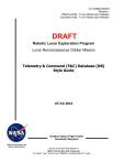 431-HDBK-000076 Revision Effective Date: To be Added Upon Release Expiration Date: To be Added Upon Release DRAFT Robotic Lunar Exploration Program Lunar Reconnaissance Orbiter Mission Telemetry & Command (T&C) Database (DB) Style Guide 07/15/2016 Goddard Space Flight Center Greenbelt, Maryland National Aeronautics and Space Administration CHECK WITH RLEP DATABASE AT: https://lunarngin.gsfc.nasa.gov TO VERIFY THAT THIS IS THE CORRECT VERSION PRIOR TO USE. LRO Mission Operations PlanT&C Database Style Guide 431-HDBK-000076 Revision DRAFT SIGNATURES Prepared by: Mehul Patel Test Conductor Honeywell, Code 444 Date Maxine Saylor Test Conductor Honeywell, Code 444 Date Date Dave Everett Mission Systems Engineer NASA/GSFC, Code 599 Date Reviewed / Approved by: Richard S Saylor, Jr. Ground System Lead Honeywell, Code 444 Arlin Bartels Payload Systems Manager NASA/GSFC, Code 431 Date Joanne Baker I&T Manager NASA/GSFC, Code 568 Date Mike Blau Flight Software Lead NASA/GSFC, Code 582 Approved by: Craig Tooley LRO Project Manager GSFC/NASA, Code 431 Date ii Date LRO Mission Operations PlanT&C Database Style Guide 431-HDBK-000076 Revision DRAFT PREFACE This document is a Lunar Reconnaissance Orbiter (LRO) Project Configuration Management (CM)-controlled document. Changes to this document require prior approval of the applicable Configuration Control Board (CCB) Chairperson or designee. Proposed changes shall be submitted to the LRO CM Office (CMO), along with supportive material justifying the proposed change. Changes to this document will be made by complete revision. Questions or proposed changes concerning this document shall be addressed to: LRO Configuration Management Office Mail Stop 431 Goddard Space Flight Center Greenbelt, Maryland 20771 iii LRO Mission Operations PlanT&C Database Style Guide 431-HDBK-000076 Revision DRAFT LUNAR RECONNAISSANCE ORBITER DOCUMENT CHANGE RECORD Sheet: 1 of 1 REV LEVEL DESCRIPTION OF CHANGE Rev - iv APPROVED BY DATE APPROVED LRO Mission Operations PlanT&C Database Style Guide 431-HDBK-000076 Revision DRAFT LIST OF TBDS/TBRS Sheet: 1 of 1 Item No. Location Summary 1 2 3 4 5 6 v Ind./Org. Due Date LRO Mission Operations PlanT&C Database Style Guide 431-HDBK-000076 Revision DRAFT TABLE OF CONTENTS 1.0 INTRODUCTION ............................................................................................... 1-1 1.1. 1.2. 1.3. Purpose and Scope ................................................................................. 1-1 Document Structure ................................................................................ 1-1 Applicable Documents ............................................................................. 1-1 2.0 MISSION OVERVIEW ....................................................................................... 2-1 3.0 ITOS DATABASE STYLE GUIDELINES .......................................................... 3-3 3.1. 3.2. Mnemonic Naming Convention ............................................................... 3-3 3.1.1. Naming Assignments and Abbreviations ..................................... 3-4 3.1.2. Conversion Definition Naming Convention .................................. 3-8 Single Database (SDB) Files ................................................................... 3-8 3.2.1. SDB File Format .......................................................................... 3-9 3.2.2. Summary ................................................................................... 3-18 A. TELEMETRY DATABASE (SDB) FILE EXAMPLE ......................................... A-1 B. PSEUDO-TELEMETRY DATABASE (SDB) FILE EXAMPLE ......................... B-1 C. COMMAND DATABASE (SDB) FILE EXAMPLE............................................ C-1 D. ACRONYM LIST .................................................................................................. 2 LIST OF TABLES Table 3-1: Prefix Assignments .....................................................................................3-4 Table 3-2: Component Assignments ............................................................................3-5 Table 3-3: Mnemonic Description Abbreviations ..........................................................3-6 Table 3-3: Mnemonic Description Abbreviations Cont..................................................3-7 Table 3-4: Unit Abbreviations .......................................................................................3-8 Table 3-2: Telemetry (M&T) Record Format ...............................................................3-12 Table 3-3: M&T Telemetry Packet Header Records ....................................................3-16 vi LRO Mission Operations PlanT&C Database Style Guide 1.0 431-HDBK-000076 Revision DRAFT INTRODUCTION The Lunar Reconnaissance Orbiter (LRO) is the first robotic mission of the Robotic Lunar Exploration Program (RLEP). The primary objective of the LRO mission is to conduct investigations that support future human exploration of the Moon. The launch readiness date for LRO is October 2008. 1.1. PURPOSE AND SCOPE The LRO Project has multiple teams contributing database inputs in order to generate a fully integrated database for use by the Integrated Test and Operations System (ITOS) ground system. Therefore, it is necessary to define a common format and naming convention to avoid conflicting inputs and to ensure usability. This document contains guidelines for naming command mnemonics, telemetry mnemonics, discrete names, analog conversion definitions, limit definitions, and database filenames as well as the overall format of the files and individual record types. All teams contributing database inputs to the LRO ITOS ground system shall follow these guidelines. 1.2. DOCUMENT STRUCTURE The following describes the document breakdown structure: Section 1: Introduction – This section describes the purpose and scope of the database style document. Section 2: Observatory Overview – This section provides a high-level over