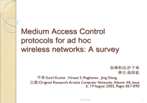 Medium Access Control protocols for ad hoc wireless networks: A survey 指導教授:許子衡 學生:黃群凱 作者:Sunil Kumar ,Vineet S. Raghavan , Jing Deng. 出處:Original Research Article Computer Networks, Volume 48, Issue 6, 19 August 2005, Pages 867-890 2016/7/15 1 QoS-aware MAC protocols Issues affecting QoS ◦ Several issues: the service model routing strategies admission control resource reservation signaling techniques MAC protocols 2016/7/15 2 QoS-aware MAC protocols ◦ Need to be considered in the context of providing QoS in ad hoc wireless networks. ◦ Signaling is used in order to negotiate, reserve, maintain and free up resources, and is one of the most complicated aspects of the network. 2016/7/15 3 QoS-aware MAC protocols It should be performed reliably (including topology changes) with minimum overhead. The MAC protocol should address issues caused by node mobility and unreliable timevarying channel. 2016/7/15 4 QoS-aware MAC protocols Review of selected QoS-aware MAC protocols ◦ MAC is a lower level function and needs to be closely integrated with upper layers such as the network layer for routing. Since centralized control is not available. ◦ it is difficult to maintain information about connections and reservations 2016/7/15 5 QoS-aware MAC protocols ◦ A common, globally synchronous slotted TDM frame is defined among clusters. ◦ The other option is to use asynchronous approaches that do not require global time synchronization 2016/7/15 6 QoS-aware MAC protocols ◦ Real-time MAC (RT-MAC) In IEEE 802.11 protocol, packets that have missed their deadlines are still retransmitted, even though they are not useful any more. This causes bandwidth and resources to be wasted When an rt packet is queued for transmission, a timestamp is recorded locally in the node indicating the time by when the packet should be transmitted. The sending node checks whether a packet has expired at three points 2016/7/15 7 DCF with priority classes ◦ That supports priority based access for different classes of data ◦ The basic idea is to use a combination of shorter IFS or waiting times and shorter backoff time value ◦ While normal nodes wait for the channel to remain idle after DIFS interval before they transmit data, a higher priority node waits for only PIFS. 2016/7/15 8 Enhanced DCF ◦ It has been developed as a part of the hybrid coordination function (HCF) of IEEE 802.11e ◦ proposed a fully distributed Virtual MAC (VMAC) scheme that supports service differentiation, radio monitoring, and admission control for delay-sensitive and besteffort traffic. 2016/7/15 9 Black burst (BB) contention Normal data nodes use a longer interframe spacing than rt nodes. Instead of sending their packets when the channel becomes idle for a predetermined amount of time, rt nodes jam the channel with pulses of energy (which are termed the black bursts) 2016/7/15 10 Elimination by sieving (ES-DCF) and deadline bursting (DB-DCF) that offer guaranteed time bound delivery for rt traffic, by using deterministic collision resolution algorithms. The ES-DCF has three phases of operation— elimination, channel acquisition and collision resolution. In elimination phase, every node is assigned a grade based on the deadlines and priority of its packets 2016/7/15 11 Elimination by sieving (ES-DCF) and deadline bursting (DB-DCF) If it receives a CTS packet in return, the channel is considered acquired successfully. the third phase of collision resolution is initiated by sending out a BB 2016/7/15 12 Elimination by sieving (ES-DCF) and deadline bursting (DB-DCF) In the DB-DCF, the first phase is for BB contention wherein the lengths of the BB packets are proportional to the urgency (i.e., relative deadlines) of the rt packet. This is followed by phases for channel acquisition and collision resolution, which are similar to the corresponding phases in ES-DCF. 2016/7/15 13 Multiple access collision avoidance withpiggyback reservations (MACA/PR) nodes maintain a special reservation table. The first data packet in an rt data stream sets up reservations along the entire path by using the standard RTS–CTS approach. 2016/7/15 14 Multiple access collision avoidance withpiggyback reservations (MACA/PR) Neighboring nodes overhearing the data and ACK packets, become aware of the subsequent packet transmission schedule, and back off accordingly. Since there is no RTS–CTS exchange after the first data packet, collision prevention of rt packets is through the use of the reservation tables.. 2016/7/15 15 Asynchronous QoS enabled multihop MAC In the case of an nrt data transmission, the regular RTS–CTS–DATA–ACK sequence is employed between the sender and the receiver. The scheme requires every node to maintain two reservation tables, Rx RT and Tx RT. 2016/7/15 16 Asynchronous QoS enabled multihop MAC If a node receives an RTS, it performs the same checks before responding with a CTS packet. After a successful RTS–CTS exchange, data is sent out, and an ACK is expected. Both the receiver and transmitter nodes check their own tables, thereby eliminating the overhead of exchanging table information. 2016/7/15 17 Distributed fair scheduling (DFS) The DFS scheme to ensure that different flows sharing a common wireless channel are assigned appropriate bandwidth corresponding to their weights or priorities. A higher priority packet is assigned a smaller finish-tag and shorter backoff periods. 2016/7/15 18 Distributed fair scheduling (DFS) This approach ensures that any flow that has packets of higher priority will consistently have shorter backoff times, thereby achieving a higher throughput. 2016/7/15 19 Summary and future directions A combination of control packets (e.g., RTS/ CTS/ACK) and carrier sensing (i.e., CSMA) has been found to reduce the probability of collisions caused by hidden terminals. As devices shrink in size, their ability to carry larger battery packs will diminish. 2016/7/15 20 Summary and fut