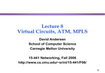 Lecture 8 Virtual Circuits, ATM, MPLS David Andersen School of Computer Science Carnegie Mellon University 15-441 Networking, Fall 2006 http://www.cs.cmu.edu/~srini/15-441/F06/ 1 Outline Exam discussion Layering review (bridges, routers, etc.) » Exam section C. Circuit switching refresher Virtual Circuits - general » Why virtual circuits? » How virtual circuits? -- tag switching! Two modern implementations » ATM - teleco-style virtual circuits » MPLS - IP-style virtual circuits 2 Exam stats Max/avg/min: 90 / 63 / 20 A B C D 19.6 17.9 12.8 11.0 57.6% 74.8% 58.3% 68.6% 3 Common Exam Problems Routing: No one big problem; many small misunderstandings. Please check your scores. Short answer: Many incorrect round-trip times vs. one-way times. DNS » Always sends the full query! (e.g. “ra1.streaming.npr.org”, not just “npr.org”) » Clients don’t recurse; the local recursive DNS server does. Could run on clients, but usually doesn’t. Routing and bridging and addressing… 4 Packet Switching Source sends information as self-contained packets that have an address. » Source may have to break up single message in multiple Each packet travels independently to the destination host. » Routers and switches use the address in the packet to determine how to forward the packets Destination recreates the message. Analogy: a letter in surface mail. 5 Circuit Switching Source first establishes a connection (circuit) to the destination. » Each router or switch along the way may reserve some bandwidth for the data flow Source sends the data over the circuit. » No need to include the destination address with the data since the routers know the path The connection is torn down. Example: telephone network. 6 Circuit Switching Discussion Traditional circuits: on each hop, the circuit has a dedicated wire or slice of bandwidth. » Physical connection - clearly no need to include addresses with the data Advantages, relative to packet switching: » Implies guaranteed bandwidth, predictable performance » Simple switch design: only remembers connection information, no longest-prefix destination address look up Disadvantages: » Inefficient for bursty traffic (wastes bandwidth) » Delay associated with establishing a circuit Can we get the advantages without (all) the disadvantages? 7 Virtual Circuits Each wire carries many “virtual” circuits. » Forwarding based on virtual circuit (VC) identifier – IP header: src, dst, etc. – Virtual circuit header: just “VC” » A path through the network is determined for each VC when the VC is established » Use statistical multiplexing for efficiency Can support wide range of quality of service. » No guarantees: best effort service » Weak guarantees: delay < 300 msec, … » Strong guarantees: e.g. equivalent of physical circuit 8 Packet Switching and Virtual Circuits: Similarities “Store and forward” communication based on an address. » Address is either the destination address or a VC identifier Must have buffer space to temporarily store packets. » E.g. multiple packets for some destination arrive simultaneously Multiplexing on a link is similar to time sharing. » No reservations: multiplexing is statistical, i.e. packets are interleaved without a fixed pattern » Reservations: some flows are guaranteed to get a certain number of “slots” D B C B A A 9 Virtual Circuits Versus Packet Switching Circuit switching: » Uses short connection identifiers to forward packets » Switches know about the connections so they can more easily implement features such as quality of service » Virtual circuits form basis for traffic engineering: VC identifies long-lived stream of data that can be scheduled Packet switching: » Use full destination addresses for forwarding packets » Can send data right away: no need to establish a connection first » Switches are stateless: easier to recover from failures » Adding QoS is hard » Traffic engineering is hard: too many packets! 10 Circuit Switching Switch Input Ports Output Ports Connects (electrons or bits) ports to ports 11 Packet switched vs. VC Payload VCI 1 A 1 3 2 R2 Payload 3 4 1 R1 2 B 4 3 R4 1 R3 2 R1 VC table: VC 1 R2 VC 2 R3 3 2 4 Dst Dst R1 packet forwarding table: Dst R2 4 Different paths to same destination! (useful for traffic engineering!) 12 Virtual Circuit Payload VCI 1 A 1 3 2 R2 Payload 3 4 1 R1 2 4 B R4 1 2 R1 VC table: VC 5 R2 3 R3 3 2 4 4 R2 VC table: VC 5 R4 Dst Challenges: - How to set up path? - How to assign IDs?? 13 Connections and Signaling Permanent vs. switched virtual connections (PVCs, SVCs) » » » Topology » » » static vs. dynamic. PVCs last “a long time” – E.g., connect two bank locations with a PVC that looks like a circuit – SVCs are more like a phone call PVCs administratively configured (but not “manually”) SVCs dynamically set up on a “per-call” basis point to point point to multipoint multipoint to multipoint Challenges: » How to configure these things? – What VCI to use? – Setting up the path 14 Virtual Circuit Switching: Label (“tag”) Swapping 1 A 1 3 2 R2 3 4 1 R1 2 B 4 R4 1 R3 2 3 3 2 Dst 4 4 Global VC ID allocation -- ICK! Solution: Per-link uniqueness. Change VCI each hop. Input Port R1: 1 Input VCI 5 Output Port Output VCI 3 9 R2: 2 9 4 2 R4: 1 2 3 5 15 Label (“tag”) Swapping Result: Signalling protocol must only find per-link unused VCIs. » “Link-local scope” » Connection setup can proceed hop-by-hop. – Good news for our setup protocols! 16 PVC connection setup Manual? » Configure each switch by hand. Ugh. Dedicated signalling protocol » E.g., what ATM uses Piggyback on routing protocols » Used in MPLS. E.g., use BGP to set up 17 SVC Connection Setup calling party network called party SETUP SETUP CONNECT CONNECT CONNECT ACK CONNECT ACK 18 Virtual Circuits In Practice ATM: Teleco approach » Kitchen sink. Based on voice, support file transfer, video, etc., etc. » Intended as IP replacement. That didn’t happen. 
