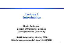 Lecture 1 Introduction David Andersen School of Computer Science Carnegie Mellon University 15-441 Networking, Spring 2008 http://www.cs.cmu.edu/~dga/15-441/S08/ 1 Today’s Lecture Course outline and goals. Whirlwind Tour of Networking ™ 2 Course Staff Instructors » David Andersen – <dga@cs.cmu.edu> , Wean Hall 8206 » Peter Steenkiste – <prs@cs.cmu.edu>, Wean Hall 8202 Teaching assistants: » Xi Liu - xil@cs.cmu.edu » Dan Perkins - cmuwaffles@gmail.com - TBA » Xin Zhang - xzhang1@cs.cmu.edu - 3 Course Goals Become familiar with the principles and practice of data networking. » Routing, transport protocols, naming, ... Learn how to write networked applications: » An IRC server » A peer-to-peer file transfer program Get some understanding about network internals in a hands on way. » You’ll implement a routing protocol for your IRC server » TCP-style congestion control 4 Course Format ~30 lectures » Cover the “principles and practice” » Readings are posted beforehand 4 homework assignments » “Paper”: Do you understand and can you apply the material? » Feedback to students and instructors » “Lab”: Illustrate networking concepts Mid-term and final. 2 programming projects. » How to use and build networks / networked applications » Application layer; include key ideas from kernel » Larger, open-ended group projects. Start early! 5 Recitation Sections Key 441 objective: system programming Different from what you’ve done before! » » » » » » Low level ( C ) Often designed to run indefinitely. Handle all errors! Must be secure Interfaces specified by documented protocols Concurrency involved (inter and intra-machine) Must have good test methods Recitations address this » “A system hackers’ view of software engineering” » Practical techniques designed to save you time & pain! 6 Sounds Great! How Do I Get In? Currently 86 people are enrolled, and no people are on the waiting list. » Cool. » We’ll update more if we end up with a waitlist due to unexpected, sudden popularity because the class is just that cool. But just to be sure: » If you do not plan to take the course, please drop it within a reasonable amount of time » And if you do, please make sure you’re registered! – We’d like a reasonable headcount – Lets us use the online roster to create your logins/etc. for assignments 7 Administrative Stuff Watch the course web page. » Handouts, readings, .. Read courses bboards. » “Announce” for official announcements » “General” for questions/answers Office hours posted on web page. Course secretary » Barbara Grandillo, Wean Hall 8018 Office hours this week by email / appointment » Final office hours posted Thursday Books – have people gone to the bookstore? How many copies? Should be there… 8 Grading Roughly equal weight in projects and testing on course contents. 20% for Project I 25% for Project II 15% for Midterm 25% for Final exam 15% for Homeworks You need to demonstrate competence in both projects and tests to pass the course. Don’t fail any component. 9 Policy on Collaboration Working together is important. » Discuss course material in general terms » Work together on program debugging, .. Parts must be your own work » Homeworks, midterm, final Projects: Teams of two » Collaboration, group project skills » Both students should understand the entire project Web page has details. Things we don’t want to have to say: We run projects through several cheat-checkers against all previously and concurrently handed in versions… 10 Policy on Late Work and Regrading No assignments with a “short fuse”. » Homeworks: ~1 week » Projects: ~5 weeks Late work will receive a 10% penalty/day. » No penalty for a limited number of handins - see web page » No assignment can be more than 2 days late Only exception is documented illness and family emergencies Start on time! » Every year some students discover that a 4 week project cannot be completed in a week Requests for regrading must be submitted in writing with course secretary within 2 weeks. » Regrading will be done by original grader 11 This Week Intro – what’s this all about? Protocol stacks and layering Next week? Applications and Network programming review. » Socket programming (213 review++) » Recitations start next week: Project management (SVN, etc.) Course outline: » Low-level (physical, link, circuits, etc.) » Internet core concepts (addressing, routing, DNS) » Advanced topics On to the good stuff… 12 What Is a Network? Collection of nodes and links that connect them This is vague. Why? Consider different networks: » » » » » Internet Andrew Telephone Your house Others – sensor nets, cell phones, … Focus on Internet, but understand important common issues and challenges 13 Networks Juggle Many Goals Efficiency – resource use; cost The “ilities”: » » » » Evolvability Managability Security (securability, if you must) Ease of: – Creation – Deployment – Management – Creating useful applications » Scalability 14 Challenges for Networks Geographic scope » The Internet vs. Andrew, etc. Scale » The Internet vs. your home network Application types » Email vs. Videoconferencing Trust and Administration » Corporate network – one network “provider” » Internet – 17,000 network providers 15 How to Draw a Network Node Link Node 16 Building block: The Links Node Link Node Electrical questions » Voltage, frequency, … » Wired or wireless? Link-layer issues: How to send data? » When to talk – can everyone talk at once? » What to say – low-level format? » Stay tuned for lecture 5 Okay… what about more nodes? 17 … But what if we want more hosts? One wire Wires for everybody! Scalability?! 18 Multiplexing! Need to share network resources How? Switched network » Party “A” gets resources sometimes » Party “B” gets them sometimes Interior nodes act as “Routers” or “Switches” What mechanisms ca