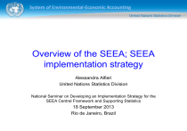 System of Environmental-Economic Accounting Overview of the SEEA; SEEA implementation strategy Alessandra Alfieri United Nations Statistics Division National Seminar on Developing an Implementation Strategy for the SEEA Central Framework and Supporting Statistics 18 September 2013 Rio de Janeiro, Brazil System of Environmental-Economic Accounting Recent advances - SEEA Internationally agreed statistical framework to measure environment and its interactions with economy Adopted as international statistical standard by UN Statistical Commission in 2012 Developed through intergovernmental process Published by UN, EU, FAO, IMF, OECD, WB System of Environmental-Economic Accounting The Suite of SEEAs 1993 2003 2006 Handbook – interim publication Updated SEEA handbook – manual of best practices UNSC decided to elevate SEEA to an international standard 2012 2013 2013 SEEA – The Central Framework (international standard) SEEA – Experimental Ecosystem Accounting SEEA – Applications and Extensions Subsystems: SEEA – Water (adopted in 2007) SEEA – Energy SEEA – Agriculture System of Environmental-Economic Accounting SEEA: A Statistical Standard Countries are “encouraged to implement the standard” International organizations have obligations to assist countries in implementation Implementation strategy adopted by Statistical Commission in March 2013 Data reporting mechanism will be established System of Environmental-Economic Accounting Information is vital …and it needs to be integrated The economy impacts on the environment and the environment impacts on the economy To understand these linkages we need to integrate environmental and economic information This is the explicit purpose of the SEEA System of Environmental-Economic Accounting Integrated statistics Linking policy needs and statistics Understanding the institutional arrangements Integrated statistical production process/chain and services Consistency between basic data, accounts and tables and indicators Indicators Accounts SEEA Basic data Economic Environmental Social Statistics System of Environmental-Economic Accounting Linking environmental and socio-economic data is essential for policymakers Enables analysis of the impact of economic policies on the environment and vice versa Provides a quantitative basis for policy design Identifies the socio-economic drivers, pressures, impacts and responses affecting the environment Supports greater precision for environmental regulations and resource management strategies Provides indicators that express the relationships between the environment and the economy Support relevant perspectives on the dimensions of economic development, environmental sustainability and social equity System of Environmental-Economic Accounting The SEEA Policy Quadrants I. People and the environment II. The economy and the environment Sustainability III. Ecosystems IV. Risks 14 System of Environmental-Economic Accounting I. Improving access to services and resources II. Managing supply and demand and reducing impacts Sustainability III. Improving the state of the ecosystems IV. Mitigating and adapting to extreme events 15 System of Environmental-Economic Accounting Quadrant I: Improving access I. Improving access to services and resources Key information in this (household sector related): quadrant • Costs associated with the provision of services to households • Investments in network infrastructure • Employment and compensation in household production units • Household consumption and disposable income • Poverty and inequality 16 System of Environmental-Economic Accounting Quadrant II: The economy and the environment Key information in this quadrant: II. Managing supply and demand • Efficiency of production • Decoupling • Multifactor productivity • Efficiency of consumption • Embedded emissions • Footprint indicators • Costs of production and payments by users (e.g. fees, taxes, rents, permits, etc.) • Employment and compensation • Financing (who pays for investments and current costs) • Depletion estimates • Solid waste and emissions • Environmental protection and resource management expenditures 17 System of Environmental-Economic Accounting Quadrant III: Ecosystems Key information in this quadrant: III. Improving the state of the ecosystems • Ecosystem extent • Ecosystem conditions • Water cycle • Carbon cycle • Nutrient cycle • Primary productivity • Biodiversity • Regulatory services provided ecosystems by 18 System of Environmental-Economic Accounting Quadrant IV: Extreme Events Key information in this quadrant: IV. Mitigating and adapting to extreme events • Natural disasters • Investments for mitigation • Investments for adaptation 19 System of Environmental-Economic Accounting The SEEA Central Framework Accounts 1. Flow accounts: supply and use tables for products, natural inputs and residuals (e.g. waste, wastewater) generated by economic activities. • physical (e.g. m2 of water) and/or monetary values (e.g. permits to access water, cost of wastewater treatment, etc.) 2. Stock accounts for environmental assets: natural resources and land • physical (e.g. fish stocks and changes in stocks) and/or monetary values (e.g. value of natural capital, depletion) 3. Activity / purpose accounts that explicitly identify environmental transactions already existing in the SNA. • e.g. Environmental Protection Expenditure (EPE) accounts, environmental taxes and subsidies 4. Combined physical and monetary accounts that bring together physical and monetary information for derivation indicators, including depletion adjusted aggregates System of Environmental-Economic Accounting SEEA Conceptual Framework Territory of reference Environment Imports/Exports Outside territory of reference Economic Units -Enterprises -Households -Government -Non-profit institutions Natural inputs Ecosystem services Economy Activities -Production -Consumption -Accumu