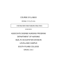 COURSE SYLLABUS RNSG 1513 (5:4:4) FOUNDATION FOR NURSING PRACTICE ********** ASSOCIATE DEGREE NURSING PROGRAM DEPARTMENT OF NURSING HEALTH OCCUPATION DIVISION LEVELLAND CAMPUS SOUTH PLAINS COLLEGE SPRING 2012 SCANS COMPETENCIES RESOURCES: Identifies, organizes, plans and allocates resources. C-1 TIME--Selects goal--relevant activities, ranks them, allocates time, and prepares and follows schedules. C-2 MONEY--Uses or prepares budgets, makes forecasts, keeps records, and makes adjustments to meet objectives C-3 MATERIALS & FACILITIES-Acquires, stores, allocates, and uses materials or space efficiently. C-4 HUMAN RESOURCES--Assesses skills and distributes work accordingly, evaluates performances and provides feedback. INFORMATION--Acquires and Uses Information C-5 Acquires and evaluates information. C-6 Organizes and maintains information. C-7 Interprets and communicates information. C-8 Uses computers to Process information. INTERPERSONAL--Works With Others C-9 Participates as members of a team and contributes to group effort. C-10 Teaches others new skills. C-11 Serves clients/customers--works to satisfy customer's expectations. C-12 Exercises leadership--communicates ideas to justify position, persuades and convinces others, responsibly challenges existing procedures and policies. C-13 Negotiates-Works toward agreements involving exchanges of resources resolves divergent interests. C-14 Works with Diversity-Works well with men and women from diverse backgrounds. SYSTEMS--Understands Complex Interrelationships C-15 Understands Systems--Knows how social, organizational, and technological systems work and operates effectively with them C-16 Monitors and Correct Performance-Distinguishes trends, predicts impacts on system operations, diagnoses systems' performance and corrects malfunctions. C-17 Improves or Designs Systems-Suggests modifications to existing systems and develops new or alternative systems to improve performance. TECHNOLOGY--Works with a variety of technologies C-18 Selects Technology--Chooses procedures, tools, or equipment including computers and related technologies. C-19 Applies Technology to Task-Understands overall intent and proper procedures for setup and operation of equipment. C-20 Maintains and Troubleshoots Equipment-Prevents, identifies, or solves problems with equipment, including computers and other technologies. FOUNDATION SKILLS BASIC SKILLS--Reads, writes, performs arithmetic and mathematical operations, listens and speaks F-1 Reading--locates, understands, and interprets written information in prose and in documents such as manuals, graphs, and schedules. F-2 Writing-Communicates thoughts, ideas, information and messages in writing, and creates documents such as letters, directions, manuals, reports, graphs, and flow charts. F-3 Arithmetic--Performs basic computations; uses basic numerical concepts such as whole numbers, etc. F-4 Mathematics--Approaches practical problems by choosing appropriately from a variety of mathematical techniques. F-5 Listening--Receives, attends to, interprets, and responds to verbal messages and other cues. F-6 Speaking--Organizes ideas and communicates orally. THINKING SKILLS--Thinks creatively, makes decisions, solves problems, visualizes, and knows how to learn and reason F-7 Creative Thinking--Generates new ideas. F-8 Decision-Making--Specifies goals and constraints, generates alternatives, considers risks, and evaluates and chooses best alternative. F-9 Problem Solving--Recognizes problems and devises and implements plan of action. F-10 Seeing Things in the Mind's Eye--Organizes and processes symbols, pictures, graphs, objects, and other information. F-11 Knowing How to Learn--Uses efficient learning techniques to acquire and apply new knowledge and skills. F-12 Reasoning--Discovers a rule or principle underlying the relationship between two or more objects and applies it when solving a problem. PERSONAL QUALITIES--Displays responsibility, self-esteem, sociability, self-management, integrity and honesty F-13 Responsibility--Exerts a high level of effort and preservers towards goal attainment. F-14 Self-Esteem--Believes in own self-worth and maintains a positive view of self. F-15 Sociability--Demonstrates understanding, friendliness, adaptability, empathy, and politeness in group settings. F-16 Self-Management--Assesses self accurately, sets personal goals, monitors progress, and exhibits self-control. F-17 Integrity/Honesty--Chooses ethical courses of action. SOUTH PLAINS COLLEGE ASSOCIATE DEGREE NURSING PROGRAM FOUNDATION FOR NURSING PRACTICE TABLE OF CONTENT Page COURSE SYLLABUS ...................................................................................................................3 Course Description......................................................................................................................4 Course Learning Outcomes.........................................................................................................5 Course Competencies..................................................................................................................6 Academic Integrity......................................................................................................................6 Scans and Foundations Skills......................................................................................................6 Verification of Workforce Competencies ...................................................................................6 SPECIFIC COURSE/INSTRUCTOR REQUIREMENTS .......................................................6 Attendance Policy .......................................................................................................................6 Assignment Policy ......................................................................................................................7 Grading Policy .................................................................