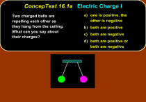 ConcepTest 16.1a Electric Charge I Two charged balls are repelling each other as they hang from the ceiling. What can you say about their charges? a) one is positive, the other is negative b) both are positive c) both are negative d) both are positive or both are negative ConcepTest 16.1a Electric Charge I Two charged balls are repelling each other as they hang from the ceiling. What can you say about their charges? a) one is positive, the other is negative b) both are positive c) both are negative d) both are positive or both are negative The fact that the balls repel each other only can tell you that they have the same charge, but you do not know the sign. So they can be either both positive or both negative. Follow-up: What does the picture look like if the two balls are oppositely charged? What about if both balls are neutral? ConcepTest 16.1b Electric Charge II From the picture, what can you conclude about the charges? a) have opposite charges b) have the same charge c) all have the same charge d) one ball must be neutral (no charge) ConcepTest 16.1b Electric Charge II From the picture, what can you conclude about the charges? a) have opposite charges b) have the same charge c) all have the same charge d) one ball must be neutral (no charge) The GREEN and PINK balls must have the same charge, since they repel each other. The YELLOW ball also repels the GREEN, so it must also have the same charge as the GREEN (and the PINK). ConcepTest 16.2a Conductors I A metal ball hangs from the ceiling a) positive by an insulating thread. The ball is b) negative attracted to a positive-charged rod c) neutral held near the ball. The charge of d) positive or neutral the ball must be: e) negative or neutral ConcepTest 16.2a Conductors I A metal ball hangs from the ceiling a) positive by an insulating thread. The ball is b) negative attracted to a positive-charged rod c) neutral held near the ball. The charge of d) positive or neutral the ball must be: e) negative or neutral Clearly, the ball will be attracted if its charge is negative. However, even if the ball is neutral, the charges in the ball can be separated by induction (polarization), leading to a net attraction. remember the ball is a conductor! Follow-up: What happens if the metal ball is replaced by a plastic ball? ConcepTest 16.2b Conductors II Two neutral conductors are connected a) 0 0 by a wire and a charged rod is brought b) + – c) – + d) + + e) – – near, but does not touch. The wire is taken away, and then the charged rod is removed. What are the charges on the conductors? 0 0 ? ? ConcepTest 16.2b Conductors II Two neutral conductors are connected a) 0 0 by a wire and a charged rod is brought b) + – c) – + d) + + e) – – near, but does not touch. The wire is taken away, and then the charged rod is removed. What are the charges on the conductors? While the conductors are connected, positive 0 0 ? ? charge will flow from the blue to the green ball due to polarization. Once disconnected, the charges will remain on the separate conductors even when the rod is removed. Follow-up: What will happen when the conductors are reconnected with a wire? ConcepTest 16.3a Coulomb’s Law I What is the magnitude a) 1.0 N b) 1.5 N of the force F2? c) 2.0 N F1 = 3N Q Q F2 = ? d) 3.0 N e) 6.0 N ConcepTest 16.3a Coulomb’s Law I What is the magnitude a) 1.0 N b) 1.5 N of the force F2? c) 2.0 N F1 = 3N Q Q F2 = ? d) 3.0 N e) 6.0 N The force F2 must have the same magnitude as F1. This is due to the fact that the form of Coulomb’s Law is totally symmetric with respect to the two charges involved. The force of one on the other of a pair is the same as the reverse. Note that this sounds suspiciously like Newton’s 3rd Law!! ConcepTest 16.3b Coulomb’s Law II F1 = 3N Q Q F2 = ? b) 3.0 N If we increase one charge to 4Q, what is the magnitude of F1? F1 = ? 4Q Q a) 3/4 N F2 = ? c) 12 N d) 16 N e) 48 N ConcepTest 16.3b Coulomb’s Law II F1 = 3N Q Q F2 = ? b) 3.0 N If we increase one charge to 4Q, what is the magnitude of F1? F1 = ? 4Q Q a) 3/4 N F2 = ? c) 12 N d) 16 N e) 48 N Originally we had: F1 = k(Q)(Q)/r2 = 3 N Now we have: F1 = k(4Q)(Q)/r2 which is 4 times bigger than before. Follow-up: Now what is the magnitude of F2? ConcepTest 16.3c Coulomb’s Law III The force between two charges a) 9 F separated by a distance d is F. If b) 3 F the charges are pulled apart to a c) F distance 3d, what is the force on d) 1/3 F each charge? e) 1/9 F F F Q Q d ? ? Q Q 3d ConcepTest 16.3c Coulomb’s Law III The force between two charges a) 9 F separated by a distance d is F. If b) 3 F the charges are pulled apart to a c) F distance 3d, what is the force on d) 1/3 F each charge? e) 1/9 F F Originally we had: F Q Q Fbefore = k(Q)(Q)/d2 = F Now we have: Fafter = k(Q)(Q)/(3d)2 = 1/9 F d ? ? Q Q 3d Follow-up: What is the force if the original distance is halved? ConcepTest 16.4b Electric Force II Two balls with charges +Q and +4Q are separated by 3R. Where should you place another charged ball Q0 on the line between the two charges such that the net force on Q0 will be zero? +4Q +Q a) b) c) d) 2R R 3R e) ConcepTest 16.4b Electric Force II Two balls with charges +Q and +4Q are separated by 3R. Where should you place another charged ball Q0 on the line between the two charges such that the net force on Q0 will be zero? +4Q +Q a) b) c) d) e) 2R R 3R The force on Q0 due to +Q is: F = k(Q0)(Q)/R2 The force on Q0 due to +4Q is: F = k(Q0)(4Q)/(2R)2 Since +4Q is 4 times bigger than +Q, then Q0 needs to be farther from +4Q. In fact, Q0 must be twice as far from +4Q, since the distance is squared in Coulomb’s Law. ConcepTest 16.5a Proton and Electron I A proton and an electron are held apart a distance of 1 m and then released. As they approach each other, what happens to the force between them? p a) it gets bigger b) it gets smaller c) it stays the same e ConcepTest 16.5a Proton and Electron I A proton and an electron are held apart a distance of 1 m and then relea