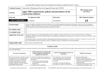 The optional HSC examination is based on this examinable unit of competency as detailed in Section 11.3 of Part A. Training Package Unit title Construction, Plumbing and Services Integrated Framework (CPC08) Apply OHS requirements, policies and procedures in the construction industry Unit code CPCCOHS2001A HSC Requirements and Advice Competency field Unit sector HSC Indicative Hours Common Construction 15 Unit descriptor This unit of competency specifies the outcomes required to carry out OHS requirements through safe work practices at any on or off-site construction workplace. It requires the performance of work in a safe manner through awareness of risks and work requirements, and the planning and performance of safe work practices with concern for personal safety and the safety of others. Prerequisite units Nil Co-requisite units Nil Application of the unit This unit of competency covers fundamental OHS necessary to undertake work tasks within any sector in the construction industry. It includes the identification of hazardous materials, including asbestos, and compliance with legislated work safety practices. It does not cover removal of asbestos, which is a licensed activity. The unit relates directly to the general induction training program specified by the National Code of Practice for Induction Training for Construction Work (ASCC 2006) required to enter a construction work site. Completion of unit CPCCOHS1001A covers this requirement. Employability skills This unit contains employability skills. Evidence Guide The evidence guide provides advice on assessment and must be read in conjunction with the performance criteria, required skills and knowledge, range statement and the Assessment Guidelines for the Training Package. Overview of assessment This unit of competency could be assessed in the workplace or a close simulation of the workplace environment, provided that simulated or project-based assessment techniques fully replicate construction workplace conditions, materials, activities, responsibilities and procedures. Construction Curriculum Framework Critical aspects for assessment and evidence required to demonstrate competency in this unit A person who demonstrates competency in this unit must be able to provide evidence of the ability to: correctly locate, interpret and apply relevant information, standards and specifications comply with a site safety plan, September 2009 (updated Feb 2010) Context of and specific resources for assessment This competency is to be assessed using standard and authorised work practices, safety requirements and environmental constraints. Assessment of essential underpinning knowledge will usually be conducted in an Method of assessment Assessment methods must: satisfy the endorsed Assessment Guidelines of the Construction, Plumbing and Services Integrated Framework Training Package include direct observation of tasks in real or simulated work conditions, with CPCCOHS2001A Apply OHS requirements, policies and procedures in the construction industry 89 The optional HSC examination is based on this examinable unit of competency as detailed in Section 11.3 of Part A. Critical aspects for assessment and evidence required to demonstrate competency in this unit cont/d organisational policies, OHS regulations and state and territory legislation applicable to workplace operations, including quality requirements correctly identify ACM and policies and procedures for reporting this to designated personnel effectively communicate and work safely with others apply general procedures for responding to incidents and reporting hazards and injuries select and use firefighting equipment to extinguish a simulated mechanical fire evacuate a site through simulated response to an emergency, complying with workplace procedures. Context of and specific resources for assessment off-site context. Assessment is to comply with relevant regulatory or Australian standards’ requirements. Resource implications for assessment include: an induction procedure and requirement realistic tasks or simulated tasks covering the mandatory task requirements relevant specifications and work instructions tools and equipment appropriate to activity support materials appropriate to applying safe work practices workplace instructions relating to safe work practices and addressing hazards and emergencies material safety data sheets research resources, including industry related systems information. Reasonable adjustments for people with disabilities must be made to assessment processes where required. This could include access to modified equipment and other physical resources, and the provision of appropriate assessment support. Method of assessment questioning to confirm the ability to consistently identify and correctly interpret the essential underpinning knowledge required for practical application reinforce the integration of employability skills with workplace tasks and job roles confirm that competency is verified and able to be transferred to other circumstances and environments. Validity and sufficiency of evidence requires that: competency will need to be demonstrated over a period of time reflecting the scope of the role and the practical requirements of the workplace where the assessment is part of a structured learning experience the evidence collected must be related to a number of performance assessments at different points in time and separated by further learning and practice, with a decision on competency only taken at the point when the assessor has complete confidence in the person’s demonstrated ability and applied knowledge all assessment that is part of a structured learning experience must include a combination of direct, indirect and supplementary evidence. Assessment processes and techniques should as far as is practical take into account the language, literacy and numeracy capacity of the candidate in relation to the competency being assessed. Supplementary ev