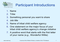 Participant Introductions 1. 2. 3. 4. 5. 6. Name Tribe Something personal you want to share Job title Name of tribal child welfare agency One statement on the major focus of your tribal child welfare agency’s change initiative 7. A positive word that starts with the first letter of your name (e.g., Wonderful Willie) www.ncwwi.org A service of the Children’s Bureau, a member of the T/TA Network 1 A service of the Children’s Bureau, a member of the T/TA Network Leadership Academy for Middle Managers Tribal Coaching City, State Date National Child Welfare Workforce Institute (NCWWI) Purpose To build the capacity of the nation’s child welfare workforce and improve outcomes for children, youth, and families through activities that support the development of skilled child welfare leaders. www.ncwwi.org A service of the Children’s Bureau, a member of the T/TA Network 3 Goal of the Leadership Academy for Middle Managers (LAMM) To develop leadership skills for sustainable systems change to improve outcomes for children, youth, and families www.ncwwi.org A service of the Children’s Bureau, a member of the T/TA Network 4 Goal of LAMM Tribal Coaching To advance tribal leadership of tribal agencies’ change initiatives www.ncwwi.org A service of the Children’s Bureau, a member of the T/TA Network 5 Tribal Coaching Participant Objectives • • • • • • • Apply NCWWI leadership skills in tribal child welfare agencies and settings Implement tribal child welfare agency’s change initiatives through resources and support from small-group and peer coaching Develop partnerships internally and externally for implementing sustainable systems change Identify aspects of Native American history and sphere of influence that contribute to leadership in tribal child welfare Identify strengths and challenges as leaders of change Understand NCWWI Leadership Framework model from an indigenous perspective Develop plan of action for implementing tribal child welfare agency’s change initiative www.ncwwi.org A service of the Children’s Bureau, a member of the T/TA Network 6 Agenda: Day 1 • Welcome and training overview • Personal story of leading a change initiative (part 1) • Break • Personal story of leading a change initiative (part 2) • Review of NCWWI Leadership Model and tribal perspective to create change www.ncwwi.org A service of the Children’s Bureau, a member of the T/TA Network 7 Agenda: Day 1 • • • • • • Lunch World Café discussion Break World Café discussion Personal journals One-word debrief and adjourn www.ncwwi.org A service of the Children’s Bureau, a member of the T/TA Network 8 The Circle is the sacred symbol of life…individual parts within the Circle connect with every other; and what happens to one, or what one part does, affects all within the Circle. —Virginia Driving Hawk Sneeve Sicangu Oyate Lakota www.ncwwi.org A service of the Children’s Bureau, a member of the T/TA Network 9 Working Agreements www.ncwwi.org A service of the Children’s Bureau, a member of the T/TA Network 10 Four Agreements 1. 2. 3. 4. Be Impeccable With Your Word Don’t Take Anything Personally Don’t Make Assumptions Always Do Your Best —Don Miguel Ruiz www.ncwwi.org A service of the Children’s Bureau, a member of the T/TA Network 11 Day 1 Participant Objectives • Review and have working knowledge of NCWWI Leadership Model • Apply key elements from NCWWI Leadership Model quadrants through American Indian/Alaska Native perspective to continue developing tribal child welfare agency’s change initiative • Expand skills through individual, small-group, and peer coaching to help implement tribal child welfare agency’s change initiative www.ncwwi.org A service of the Children’s Bureau, a member of the T/TA Network 12 Personal Story of Leading a Change Initiative • What is the major focus of your tribal child welfare agency’s change initiative? • Why did your tribal child welfare agency choose this change initiative? • Tell your personal story of leading change through this initiative. • Share your personal successes and challenges. • Share your priorities for leading change. www.ncwwi.org A service of the Children’s Bureau, a member of the T/TA Network 13 BREAK www.ncwwi.org A service of the Children’s Bureau, a member of the T/TA Network 14 Personal Story of Leading a Change Initiative (Part 2) • What did your partner’s leadership story mean to you as a leader? • What did you hear that might help you with your tribal child welfare agency’s change initiative? • What can you offer as support or validation of their experience? www.ncwwi.org A service of the Children’s Bureau, a member of the T/TA Network 15 NCWWI Leadership Model www.ncwwi.org A service of the Children’s Bureau, a member of the T/TA Network 16 Leading Change Questions • How have you used the NCWWI Leadership Model to guide your work on your tribal child welfare agency’s change initiative? • What particular NCWWI Leadership Model quadrant has been helpful? Leadership Principle? • What challenges have come up as you’ve tried to implement your tribal child welfare agency’s change initiative? • How have you addressed those challenges (solutions, strategies)? www.ncwwi.org A service of the Children’s Bureau, a member of the T/TA Network 17 LUNCH www.ncwwi.org A service of the Children’s Bureau, a member of the T/TA Network 18 Welcome to the World Café www.ncwwi.org A service of the Children’s Bureau, a member of the T/TA Network 19 www.ncwwi.org A service of the Children’s Bureau, a member of the T/TA Network 20 World Café Guidelines • After introductions, discuss in your small group the questions at the table. Everyone may write answers to the coaching questions on the flip chart. • After 20 minutes, the coaches stay at their tables to be Wisdom Keepers for the next group, summarizing the previous conversation. • After 20 minutes