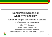 Benchmark Screening: What, Why and How A module for pre-service and in-service professional development MN RTI Center Author: Lisa H. Stewart, PhD Minnesota State University Moorhead www.scred.k12.mn.us click on RTI Center MN RtI Center 1 MN RTI Center Training Modules This module was developed with funding from the MN legislature It is part of a series of modules available from the MN RTI Center for use in preservice and inservice training: Module Title Authors 1. RTI Overview Kim Gibbons & Lisa Stewart 2. Measurement and RTI Overview Lisa Stewart 3. Curriculum Based Measurement and RTI Lisa Stewart 4. Universal Screening (Benchmarking): (Two parts) Lisa Stewart What, Why and How Using Screening Data 5. Progress Monitoring: (Two parts) Lisa Stewart & Adam Christ What, Why and How Using Progress Monitoring Data MN RtI Center 6. Evidence-Based Practices Ann Casey 7. Problem Solving in RTI Kerry Bollman 8. Differentiated Instruction Peggy Ballard 9. Tiered Service Delivery and Instruction Wendy Robinson 10. Leadership and RTI Jane Thompson & Ann Casey 11. Family involvement and RTI Amy Reschly 12. Five Areas of Reading Kerry Bollman 13. Schoolwide Organization Kim Gibbons 2 Overview This module is Part 1 of 2 Module 1: Benchmark Screening: What, Why and How What is screening? Why screen students? Criteria for screeners/what tools? Screening logistics Module 2: Using Benchmark Screening Data MN RtI Center 3 Assessment: One of the Key Components in RTI Curriculum and Instruction Assessment School Wide Organization & Problem Solving Systems (Teams, Process, etc) MN RtI Center 4 Adapted from Logan City School District, 2002 Assessment and Response to Intervention (RTI) A core feature of RTI is identifying a measurement system Screen large numbers of students Identify students in need of additional intervention Monitor students of concern more frequently 1 to 4x per month Typically weekly Diagnostic testing used for instructional planning to help target interventions as needed MN RtI Center 5 Why Do Screening? Activity What does it mean to “screen” students? Why is screening so important in a Response to Intervention system? (e.g., what assumptions of RTI require a good screening system?) What happens if you do NOT have an efficient, systematic screening system in place in the school? MN RtI Center 6 Screening is part of a problem-solving system Helps identify students at-risk in a PROACTIVE way Gives feedback to the system about how students progress throughout the year at a gross (3x per year) level If students are on track in the fall are they still on track in the winter? What is happening with students who started the year below target, are they catching up? Gives feedback to the system about changes from year to year Is our new reading curriculum having the impact we were expecting? MN RtI Center 7 What Screening Looks Like in a Nutshell School decides on brief tests to be given at each grade level and trains staff in the administration, scoring and use of the data Students are given the tests 3x per year (Fall, Winter, Spring) Person or team assigned in each building to organize data collection All students are given the tests for their grade level within a short time frame (e.g., 1-2 weeks or less). Some tests may be group administered, others are individually administered. Benchmark testing: about 5 minutes per student, desk to test (individually administered) Administered by special ed, reading, or general ed teachers or paras Entered into a computer/web based reporting system by clerical staff Reports show the spread of student skills and lists student scores, etc. to use in instructional and resource planning MN RtI Center 8 Example Screening Data: Spring Gr 1 Oral Reading Fluency 10/51 (20%) high risk 22/51 (43%) some risk 19/51 (37%) low risk: on or above target Class lists then identify specific students (and scores) in each category MN RtI Center DRAFT May 27, 2009 9 Screening Data Gives an idea of what the range of student skills is like in your building and how much growth over time students are making MN RtI Center DRAFT May 27, 2009 10 Screening Data can be linked to Progress Monitoring The goal is to have a cohesive system. If possible, use the same measures for both screening and progress monitoring (e.g, CBM). MN RtI Center Screen ALL students 3x per year (F, W, S) Strategic Support and Monitoring Students at Some Risk Intensive Support & Monitoring for Students at Extreme Risk 11 A Smart System Structure School-Wide Systems for Student Success Academic Systems Behavioral Systems Intensive, Individual Interventions •Individual Students •Assessment-based •High Intensity •Of longer duration 5-10% 10-15% Targeted Group Interventions •Some students (at-risk) •High efficiency •Rapid response Universal Interventions •All students •Preventive, proactive 75-85% Intensive, Individual Interventions •Individual Students •Assessment-based •Intense, durable procedures 5-10% 10-15% Targeted Group Interventions •Some students (at-risk) •High efficiency •Rapid response 75-85% Universal Interventions •All settings, all students •Preventive, proactive MN RtI Center 12 Terminology Check Screening Universal Screening Collecting data on all or a targeted group of students in a grade level or in the school Same as above but implies that all students are screened Benchmarking Often used synonymously with the terms above, but typically implies universal screening done 3x per year and data are interpreted using criterion target or “benchmark” scores MN RtI Center 13 “Benchmark” Screening Schools typically use cut off or criterion scores to decide if a student is at-risk or not. Those scores or targets are also referred to as “benchmarks”, thus the term “benchmarking” Some states or published curriculum also use the term benchmarking but in a different way (e.g., to refer to the documentation of achieving a specific state standard) that has not
