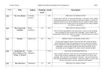 Forsyth County Grade 3-8 4-6 4-8 Title The Vine Basket The Fourteenth Goldfish Wonder Middle School Recommended Summer Reading List Author Reading Lexile Level LaValley, Josanne 740 2016 Description GBA 2015-16; Realistic Fiction Life has been hard for 14-year-old Mehrigul, a member of the Uyghur tribal group scorned by the Chinese communist regime, so when an American offers to buy all the baskets she can make in three weeks, Mehrigul strives for a better future for herself and her family despite her father's opposition. Holm, Jennifer L. 4.4 Palacio, R.J. 4.8 550 GBA 2015-16; Science Fiction Ellie's scientist grandfather has discovered a way to reverse aging, and consequently has turned into a teenager--which makes for complicated relationships when he moves in with Ellie and her mother, his daughter. 790 Realistic Fiction; Christopher Award, 2013 10-year-old Auggie Pullman, who was born with extreme facial abnormalities and was not expected to survive, goes from being home-schooled to entering fifth grade at a private middle school in Manhattan, which entails enduring the taunts and fear of his classmates as he struggles to be seen as just another student. 4-8 5-6 Engle, Enchanted Air: Two Cultures, Two Margarita Wings: A Memoir The Girl from Thompson, 1120 Non-fiction Autobiography/Memoir When hostility between Cuba and the United States erupts into the Bay of Pigs invasion, Margarita's worlds collide in the worst way possible. How can the two countries she loves – the one where she lives and the birthplace of her family - hate each other so much? And will she ever get to visit her beautiful island again? 5.3 970 GBA 2015-16; Mystery Fiction Forsyth County Felony Bay 5-7 5-7 5-7 5-7 Loot: How to Steal a Fortune Nickel Bay Nick Middle School Recommended Summer Reading List 4.2 560 GBA 2015-16; Action/Adventure When Alfie McQuinn, the notorious jewel thief, is killed on a job, his last words to his son, March, are to "find jewels" and this instruction leads him to Jules, the twin sister he never knew he had--and the perfect partner to carry on the family business. Pitchford, Dean A Snicker of Magic Lloyd, Natalie This Journal Belongs to Ratchet When Abbey's father falls into a coma and is accused of a crime he didn't commit, Abbey sets out to prove his innocence--and repay a century-old debt. Mild swearing, bullying, depiction of smoking. J.E. Watson, Jude 2016 Cavanaugh, Nancy J. 5.3 830 GBA 2015-16; Realistic Fiction When 11-year-old Sam gets into trouble and is forced to work for his reclusive neighbor Mr. Wells, he soon finds out that his mysterious new acquaintance hides many secrets of his own--including one that will change Sam's life forever. Depiction of drinking, name-calling and mild swearing. 4.0 680 GBA 2015-16 Winner; Fantasy Fiction The Pickles are new to Midnight Gulch, Tennessee, a town which legend says was once magic--but Felicity is convinced the magic is still there, and with the help of her new friend Jonah the Beedle she hopes to bring the magic back. 5.3 830 GBA 2015-16; Realistic Fiction Homeschooled by her mechanic-environmentalist father, 11-year-old Rachel "Ratchet" Vance records her efforts to make friends, save a park, remember her mother, and find her own definition of "normal." Depictions of name-calling. Forsyth County 5-7 5-8 5-8 5-8 5-8 Middle School Recommended Summer Reading List How to Outrun a Crocodile When Your Shoes are Untied Keating, Jess Prairie Evers: A Novel Airgood, Ellen 5.2 The Saturday Boy: A Novel Fleming, David 4.9 Pinkney, Andrea Davis 5.3 Porter, Tracey 5.4 The Red Pencil Billy Creekmore 5.1 750 2016 GBA 2015-16; Realistic Fiction When 12-year-old Ana's zoologist parents move the whole family into the zoo, the Sneerers--the clan of carnivorous female predators in her class--have even more ammunition to make her life miserable, although she tries to act like a chameleon and fade into the background. Name-calling, discussion of “sex ed” class, mild swearing. 790 GBA 2015-16; Realistic Fiction 10-year-old Prairie is happy being home-schooled and raising her flock of chickens, so transferring to regular school is a big change, but fortunately she meets a wonderful friend. 710 GBA 2015-16; Realistic Fiction Every school day seems to bring more trouble to 11-year-old Derek, whose former best friend bullies him, while at home he deals with the long absence of his father, a Blackhawk helicopter pilot, and his mother's sudden moodiness. Mild swearing, rude hand gestures. 620 GBA 2016-17; Realistic Fiction After her tribal village is attacked by militants, Amira, a young Sudanese girl, must flee to safety at a refugee camp, where she finds hope and the chance to pursue an education in the form of a single red pencil and the friendship and encouragement of a wise elder. 930 Historical Fiction (Depression Era) One day a stranger comes to claim Billy Creekmore from the Guardian Angels Home for Boys; and he embarks on a cross-country journey in search of his past, his future, and his own true self. Forsyth County 6 6 6 6 6 Freedom Walkers: The Story of the Montgomery Bus Boycott Middle School Recommended Summer Reading List Freedman, Russell 7.7 Non-fiction; History; Civil Rights Covers the events surrounding and including the Montgomery Bus Boycott, the end of segregation on buses. A Night to Remember Lord, Walter Boy: Tales of Childhood Dahl, Roald Flora and Ulysses DiCamillo, Kate 4.3 Alexander, Kwame 4.3 The Crossover 1110 2016 7 950 Non-fiction The story of the "unsinkable" steamship Titanic which went down with 1,503 men, women and children aboard in the North Atlantic Ocean on April 15, 1912. 6.0 1090 Autobiography/Memoir Presents humorous anecdotes from the author's childhood, including his summer vacations in Norway and life at an English boarding school. 520 Graphic (Comic book) Novel; Fantasy Fiction; 2014 Newbery Medal A girl named Flora and a squirrel named Ulysses, whose life was saved by Flora after he was involved in an inc