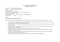 SJSU Annual Program Assessment Form Academic Year 2013-2014 Department: Child & Adolescent Development Program: Child & Adolescent Development College: Education Website: http://www.sjsu.edu/chad/ _ Check here if your website addresses the University Learning Goals. Program Accreditation (if any): NA Contact Person and Email: Toni Campbell -- toni.campbell@sjsu.edu Date of Report: 5/15/14 Part A 1. List of Program Learning Outcomes (PLOs) ChAD refers to the PLOs as student learning objectives (SLOs). These SLOs are the same for both the BA and the MA programs. They are: 1. 2. 3. 4. 5. 6. 7. Demonstrate basic knowledge of child and adolescent development in four major domains (cognitive, emotional, social, and physical) and understand the interrelationships among these domains; Understand the role of context in the growth and development of children and adolescents and their socialization by family, community, society, and culture; Apply research, theory, and problem-solving skills to questions about social policy, education, intervention, and practical situations pertaining to children and adolescents; Examine and evaluate information about children and adolescents from a variety of sources; Demonstrate inquisitiveness about the development of children and adolescents by articulating reasoned questions and methods for seeking answers to those questions; Demonstrate communication and interpersonal skills for facilitating the development of children and adolescents and meeting the challenges of working with other professionals; and Understand ethical and advocacy responsibilities in working with and on behalf of children and adolescents. 2.Map of PLOs to University Learning Goals (ULGs) ChAD SLOs University PLOs 1 2 3 4 5 1 2 3 4 5 6 7 X X X X X X X X X X X X X X X X PLO 1 PLO 2 PLO 3 PLO 4 PLO 5 X X X X X X X X X X X X X X X X X X X X X X X X X X X X X X X X X X X X X X X X X X X X X 3. Alignment – Matrix of PLOs to Courses ChAD Courses 159/160 162/164 163/173 169 170 195 100W 101 149 150 151 161 168 X X X X X X X X 4. Planning – Assessment Schedule ChAD SLOs 1 2 3 4 5 6 7 101 159/160 162/164 163/173 169 195 Exit survey Sp even Each sem. Each sem. Each sem. Each sem. Each sem. Each sem. Each sem. Sp odd F even Sp even F odd Sp odd F even 5. Student Experience All syllbi, ChAD department website, Undergraduate Studies web pages Part B 6. Graduation Rates for Total, Non URM and URM students (per program and degree) Academic Programs Child/Adolescent Dev First-time Freshmen: 6 Year Graduation Rates New UG Transfers: 3 Year Graduation Rates Grads : 3 Year Graduation Rates Fall 2007 Cohort Fall 2010 Cohort Fall 2010 Cohort Entering % Grad Entering % Grad Entering % Grad Total 37 43.2% 87 71.3% 8 75.0% URM 12 41.7% 18 77.8% 1 0.0% Non-URM 23 47.8% 53 67.9% 5 80.0% Other 2 0.0% 16 75.0% 2 100.0% 7. Headcounts of program majors and new students (per program and degree) Fall 2013 New Students Child and Adolescent Development Cont. Students Total 1st Fr. UG Transf New Creds 1st Grads UGs Creds Grads UGs Creds Grads Total 39 115 0 7 454 0 10 608 0 17 BA 39 115 0 0 454 0 0 608 0 0 MA 0 0 0 7 0 0 10 0 0 17 Degree 8. SFR and average section size (per program) Fall 2013 Student to Faculty Ratio (SFR) 25.8 Average Headcount per Section Lower Division 35.9 61.7 Upper Division 24.0 29.8 Graduate Division 10.6 11.0 Course Prefix Course Level CHAD - Child/Adolescent Dev Total 33.7 9. Percentage of tenured/tenure-track instructional faculty (per department) Fall 2013 Child & Adolescent Development % Tenured/Prob 34.2% Temp Lecturer 12.982 Probationary 2.801 Part C 10. Closing the Loop/Recommended Actions We have just completed our program review external reviewer visit. We expect that the reviewer’s recommendations will map onto those made by the department: Our highest priority for the immediate future is hiring additional faculty and an additional permanent clerical person to support our department administrative assistant. Our dean is well aware of the importance of both of these priorities. The resources to move on this agenda are almost entirely dependent on the university administration. As a consequence of preparing our program review document, it has become clear that we need to have a formal schedule and a specific work plan for conducting further assessments of our SLOs. As shown in 3.d above, we have created that structure and believe that we will have little difficulty in adhering to the schedule. For some time, we have been discussing possible approaches to assessing our SLOs multiple times across different courses (currently each SLO is formally assessed once in the curriculum). We recognize that aspects of all seven SLOs are part of the student experience in each of our required courses, and we know that review of more data points provides a stronger foundation for making changes to the curriculum. While we will continue to try to find ways to expand the complexity of our assessment, we know we will be limited in what is possible to achieve in making large changes due to the many competing demands made on faculty time. Currently, in addition to teaching, research, and service, tenure/tenure-track faculty coordinate two-five courses some of which have as many as nine sections. Except for the substantial effort involved in rolling out our new pathway in the major (see 2a.2 above) beginning in fall 2014, a process that will take several years to fully implement, we do not anticipate making any additional significant curricular changes over the next five years. We will, as has been our practice for more than a decade, regularly make adjustments to courses based on our review of our assessment data and based on the intensive faculty reviews that we conduct approximately every four years in all of our courses. 11. Assessment Data Approximately every four years, the ChAD faculty methodically reviews the entire ChAD curriculum. The faculty, as a group, discusses each syllabus in detail, and as ne