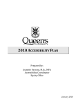 2010 ACCESSIBILITY PLAN Prepared by: Jeanette Parsons, M.Sc., MPA Accessibility Coordinator Equity Office January 2010 Page |2 CONTENTS Introduction........................................................................................................................................................................................................ 3 Accessibility Priorities - 2010 ..................................................................................................................................................................... 4 Accessibility Highlights – 2009................................................................................................................................................................... 5 Enable Project .......................................................................................................................................................................................... 5 Accessible Customer Service.............................................................................................................................................................. 5 Accessible Information & Communication................................................................................................................................... 5 Queen’s Centre ......................................................................................................................................................................................... 6 Mental Health First Aid ........................................................................................................................................................................ 6 Queen’s Students Care About Accessibility ........................................................................................................................................... 7 Accessibility Plan: 2010................................................................................................................................................................................ 8 Customer Service .................................................................................................................................................................................... 8 Built Environment ................................................................................................................................................................................13 Employment............................................................................................................................................................................................16 Information & Communication .......................................................................................................................................................17 Transporation ........................................................................................................................................................................................19 Appendices ........................................................................................................................................................................................................20 Queen’s Accessibility Committee .............................................................................................................................................................20 Queen’s Accessibility Committee Membership ..................................................................................................................................21 Policy on the Presence of Service Animals .................................................................................................................................23 Page |3 INTRODUCTION This year, much of our effort in advancing accessibility has focused on bringing the University into compliance with requirements in the accessible customer service standard, a regulation under the Accessibility for Ontarians with Disabilities Act, 2005. This has involved developing and delivering training in accessible customer service, creating a process for receiving and responding to accessibility-related feedback and developing required policies pertaining to service animals, support persons and the use of personal assistive devices. Members of the Queen’s community have responded in a positive and supportive way to our efforts, as evidenced by the high level of participation and engagement in the accessible customer service training. The Principal, Vice Principals and their direct reports, all of the Deans and over 200 Directors, Department and Unit Heads and Managers personally attended sessions. Department and Unit Heads and Managers further illustrated their support by encouraging their staff and faculty to participate, requesting special sessions for their units or by facilitating team meetings about applying information gleaned from training within their area. The leadership shown by the Vice Principals Human Resources and Academic in assuming responsibility for communicating with faculty and staff has gone a long ways towards conveying the University’s commitment to advancing accessibility for persons with disabilities. Queen’s University is a leader among Ontario universities in its commitment to not only achieving compliance with the province’s accessibility legislation but to realize real improvements in the experience of persons with disabilities as they participate in the life and work of our University. In addition to directing the development of an online training program in accessible customer service for use by all Ontario universities, Queen’s leads in terms of expertise and experience of meeting many of the requirements anticipated with enactment of the remaining accessibility standards, especially information and communication. The following pages detail much of th