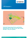 Extended Temperature Device and Testing Advancements for COMs and SFF SBCs Enable Reliable, Long Life Systems If it’s embedded, it ’s Kontron. Whitepaper Extended Temperature Device and Testing Advancements for COMs and SFF SBCs Enable Reliable, Long Life Systems Continued technology advancements have fostered high expectations that embedded systems will continue their evolutionary path to become smaller and smaller with lower and lower power consumption all while delivering ever higher performance. Furthermore, there is a steady increase in the need to design the extreme internal system applications – not only for applications in obvious harsh environments such as what outdoor POS/POI systems and those installed in military type vehicles are subjected to, but also to support rugged environments that result from space-constraints and mission critical or 24/7 design requirements. Contents Summary . . . . . . . . . . . . . . . . . . . . . . . . . . . . . . . . . . . . . . . . . . . . . . . 2 Contents . . . . . . . . . . . . . . . . . . . . . . . . . . . . . . . . . . . . . . . . . . . . . . . . 2 Applications in Extreme Environments . . . . . . . . . . . . . . . . . . . . . . . . . . . 3 Achieving Extended Temperature. . . . . . . . . . . . . . . . . . . . . . . . . . . . . . . 3 Methodologies that Support Extended Temperature . . . . . . . . . . . . . . . . . . .4 Value of Proven Assembly Testing . . . . . . . . . . . . . . . . . . . . . . . . . . . . . . 4 Extended Temperature Testing Procedure . . . . . . . . . . . . . . . . . . . . . . . . . 5 Success for Mobile Embedded Extended Temperature Application. . . . . . . . .5 Kontron Extended Temperature Solutions . . . . . . . . . . . . . . . . . . . . . . . . . 5 Extended Temperature "By Design" . . . . . . . . . . . . . . . . . . . . . . . . . . . . . 6 About Kontron . . . . . . . . . . . . . . . . . . . . . . . . . . . . . . . . . . . . . . . . . . . . 7 2 www.kontron.com Whitepaper As smaller, rugged and reliable designs based on embedded small form factor modules and single board computers (SBCs) have proliferated, so too has the need to provide extended temperature-based systems. When individual components and the overall system design have been tested to withstand a broader range of temperature conditions, OEMs are given greater levels of assurance that the chosen base technology will function as desired for long-term, rugged deployment with maximum uptime while decreasing operational and maintenance costs. And when designers pack even more performance into smaller form factors, this too has spawned the need for components rated for more extreme temperature ranges. Today’s smaller embedded applications add challenges to PCB design layout making it more critical than ever to pre-configure and test systems to ensure they operate in a given application’s extended temperature range. As a result, choosing a technology partner that can ensure desired functionality and longterm system performance with pre-configured extended temperature devices can mean the difference of achieving time to market goals or missing the window. Temperature ranges for industrial applications are typically -40 °C to +85 °C. Some application call out a subset of the industrial temperature range (-25 °C to +75 °C). The least strenuous temperature range is the commercial temperature range (0 °C to +60 °C). An additional and even more extreme temperature range is defined under the official Mil Spec (-55°C to +125 °C). For example, the trends for smarter and lower power systems on trains to increase safety and reduce its carbon footprint has lead to growing demand in the transportation market for extended temperature devices. With its long history in developing embedded computing platforms and extensive applications and manufacturing expertise, Kontron enables its customers to quickly get to market with pre-configured, tested, standards-based assemblies of extended temperature boards and modules. Achieving Extended Temperature Applications in Extreme Environments Mission-critical applications in the military, aerospace, transportation, energy and industrial automation markets offer the biggest challenges for extended temperature designs. Systems used in these applications are constantly exposed to extreme external and internal conditions such as wide temperature variances, system start-up in low/high temperature, severe, humidity, dust and other environmental circumstances that play havoc on system performance. The result of system field failures in these applications can mean costly repairs and downtime making it imperative that it is very reliable under a wide variety of operating conditions with the highest level of failure tolerance. Therefore, it is important to have all components and board and module assemblies tested for extended temperature tolerance to ensure the system's proven functionality for extreme operating environments. For embedded systems, the four main categories of temperature ranges described above are still used to define devices for embedded systems today. Commercial temperature devices are designed in what would be considered a normal operating temperature range of between zero degrees Celsius and 60 degrees Celsius. Commercial temperature devices are not considered suitable for extended temperature applications. Devices that operate in the E1 Extended Temperature range and those specified for either Industrial Temperature or the MilSpec temperature range are the only ones chosen for very extended temperature-based systems. Customers have two recommended ways to ensure that Computer-on-Modules (COM) and SBC solutions perform within extended temperature environments – by design (solutions built with all industrial grade components) Achieving Extended Temperature Temperature Description Commercial Temperature 0°C to +60°C E1 Extended Temperature (a Kontron-defined subset of Industrial Temperature) -25°C to +75°C Industr