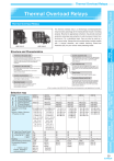 Thermal Overload Relays Thermal Overload Relays The thermal overload relay is a thermal-type overload-protection relay that takes advantage of the heating-bimetal-results-in-bending property. Mounted on appropriate contactors, they provide overload protection and phase-loss protection in order to prevent motors from burning out. On a standalone basis, they can also be used as a over-current relay. Kasuga thermal overload relays includes models with 3 thermal elements, and models featuring Phase-Loss HRD 010 D Protection (2E), for your various motor-protecting needs. HRD 018 D Structure and Characteristics Terminal on the power side Current adjustment dial ・Overload protection can be ensured by just adjusting this to the rated current of the motor. It is possible to adjust it within plus or minus 20%, and it is set in the middle before shipment. Trip indication lever ・This lever falls right and disappears when tripped. Or if you push down this lever down to the right with a small screw driver, you can intentionally break and check the circuit. Terminal on the load side ・The HRE75 type and with lower numbers are terminals with a wire-press. It is possible to just insert the wire for connection without a crimp contact. Reset button ・This will reset and make ready for operation again. Control circuit terminal ・This contact sets apart the electromagnetic contactors when tripped, or gives warnings. Automatic/Manual switch tab ・The automatic reset and manual reset can be selected with this tab. When it is set to the automatic restoration mode, the bimetal will cool off after tripped and bend back, and automatically reset. It is in the manual reset position before shipment. Mounting bracket ・We have special brackets available in case the electromagnetic switch is assembled with electromagnetic contactors. *This is a photo of the HRE 35 DG. The structure and characteristics vary depending on the model. Selection map Standalone Type Mount Type Standard Type 2Thermal Elements 3Thermal Elements Phase-Loss Protection (2E) Featured 2Thermal Elements 3Thermal Elements Phase-Loss Protection (2E) Featured HRD010 HRD010B − − HRD010D − − HRD018 HRD018B HRD018BF − HRD018D HRD018DF − 2A 0.5A 0.5A 0.3A Manual 1.2VA MUD5 MUF7 MUF10-4 MUF10-5 HMUF10 MUK12 Auxiliary Contact Open-Circuit Thermal Current Rated Operational 110V Current (AC-15) 220V 440V Resetting Power Consumption (per thermal element) Corresponding Contactors to Mount [ ]Models in square brackets : Applicable in combination with CT 4A 3A 2A 1A Manual 1.2VA MUF18 HMU18 MUF20 [MUF300] [MUF400] 7 to 10 to 12 to 18 to 24 to 9 12 15 22 30 to 11* to 14* to 18* to 26 to 36 4A 3A 2A 1A Automatic-Manual 3.2VA MUF25 MUF35 HRE150 − − − HRE150DG HRE150DF HRE150DE HRE180 − − − HRE180DG HRE180DF HRE180DE 12 to 15 to 18* 18 to 22 to 26* 24 to 30 to 36* 34 to 42 to 50 45 to 56 to 67 54 to 67 to 80 34 to 42 to 50* 45 to 56 to 67* 54 to 67 to 80* 65 to 80 to 95 90 to 110 to 130 65 to 80 to 95* 90 to 110 to 130* 105 to 130 to 155 125 to 155 to 185 4A 3A 2A 1A Automatic-Manual 4.2VA MUF50 MUF65 MUE80 4A 3A 2A 1A Automatic-Manual 4.8VA MUE100 MUE125 4A 3A 2A 1A Automatic-Manual 5.5VA MUE150 MUE180 Auxiliary Contact Units・ Applications Safety Covers 0.24 to 0.32 to 0.4* 0.24 to 0.32 to 0.4* 0.5 to 0.6 to 0.7 0.5 to 0.6 to 0.7 1.0 to 1.2 to 1.4 1 to 1.2 to 1.4 1.4 to 1.7 to 2* 1.4 to 1.7 to 2* 1.7 to 2.2 to 2.7 1.7 to 2.2 to 2.7 2.4 to 3 to 3.6* 2.4 to 3 to 3.6* 2.9 to 3.6 to 4.3 2.9 to 3.6 to 4.3 4 to 5 to 6 4 to 5 to 6 5.4 to 6.7 to 8 5.4 to 6.7 to 8 7 to 9 to 11 7 to 9 to 11 10 to 12 to 14 10 to 12 to 14 12 to 15 to 18 16 to 20 to 24* HRE75 − − − HRE75DG HRE75DF HRE75DE Industrial Relays Adjustable Current Range (Rated) Minimum−Median−Maximum *Production on Order HRE35 − − − HRE35DG HRE35DF HRE35DE Star Delta Automatic Starters Frame Reversible Electromagnetic Switches/ Contactors・ Electromagnetic Switches with ON-OFF Push-buttons・ Electromagnetic Swithes with Special Enclosures ・The mount type has a terminal plate that can be directly installed onto electromagnetic contactors. The standalone type has the dedicated connection band that makes for easy connection to the electromagnetic contactors. Line-up Electromagnetic Electromagnetic Thermal Overload Switches Contactors Relays Thermal Overload Relays 30 Thermal Overload Relays Line-up Electromagnetic Electromagnetic Thermal Overload Switches Contactors Relays Thermal Overload Relays (2 elements) Mounting Direct mount type Rated current center value(A) Reversible Electromagnetic Switches/ Contactors・ Electromagnetic Switches with ON-OFF Push-buttons・ Electromagnetic Swithes with Special Enclosures 0.6 1.2 1.7 2.2 3 3.6 5 6.7 9 12 1.2 1.7 2.2 3 3.6 5 6.7 9 12 15 Type name HRD HRD HRD HRD HRD HRD HRD HRD HRD HRD HRD HRD HRD HRD HRD HRD HRD HRD HRD HRD 010 010 010 010 010 010 010 010 010 010 018 018 018 018 018 018 018 018 018 018 B B B B B B B B B B B B B B B B B B B B 0006 0012 0017 0022 0030 0036 0050 0067 0090 0120 0012 0017 0022 0030 0036 0050 0067 0090 0120 0150 General mass (kg) 0.07 0.11 Independent type Rated current center value(A) 0.6 - 12 1.2 - 15 9 12 15 22 30 15 22 30 42 56 67 42 56 67 80 110 80 110 130 155 Type name HRD 010 HRD 018 HRE 35 HRE 35 HRE 35 HRE 35 HRE 35 HRE 75 HRE 75 HRE 75 HRE 75 HRE 75 HRE 75 HRE 150 HRE 150 HRE 150 HRE 150 HRE 150 HRE 180 HRE 180 HRE 180 HRE 180 D D DG DG DG DG DG DG DG DG DG DG DG DG DG DG DG DG DG DG DG DG □ □ 0090 0120 0150 0220 0300 0150 0220 0300 0420 0560 0670 0420 0560 0670 0800 1100 0800 1100 1300 1550 General mass (kg) 0.12 0.18 0.17 0.33 0.55 0.76 Remarks : 1. Put the rated capacity symbol in the square of the type name column. 2. Output contacts are 1c for HRD and HRE series and 1NO+1NC for HRG series. Star Delta Automatic Starters HRD 010 B HRE 35 DG HRE 150 DG Thermal Overload Relays (3 elements with open phase protector (2E)) 3 elements Industrial Relays Auxiliary Contact Units・ Applicati