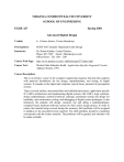 VIRGINIA COMMONWEALTH UNIVERSITY SCHOOL OF ENGINEERING EGRE 427 Spring 2001 Advanced Digital Design Credits: 4 (3 hours lecture, 3 hours laboratory) Prerequisites: EGRE 426 Computer Organization and Design Instructor: Dr. Robert Klenke, Course Director Phone: 827-7007 Email: rhklenke@vcu.edu Office Hours: T,R 1:00 – 2:00 Course Web Page: http://www.people.vcu.edu/~rhklenke/egre427/index.html Course Text: Michael John Sebastian Smith : Application-Specific Integrated Circuits; Addison-Wesley, 1997. Course Description: This is an elective course in the computer engineering sequence that provides students with practical foundations for the design, implementation, and testing of digital systems. It expands on the digital and computer system theory presented in prerequisite courses. Topics covered include, microcontrollers and embedded processors, application specific IC (ASIC) architectures and implementing digital systems with ASICs, logic synthesis, design methodologies, hardware/software codesign, production testing and design for testability, and construction, testing, and debugging of digital system prototypes. In the laboratory, the students will design, construct, test and debug a multidisciplinary, computer-based, hardware/software system for their senior design project. In order to master the material being covered during the semester, drill problems will be assigned in addition to the presented lecture material. The drill problems should be completed concurrently with the lecture material. The problems will be graded, and solutions will be made available. Course Objectives Upon successful completion of this course, the student will be able to: 1. 2. 3. 4. 5. 6. Understand the typical features of an embedded microcontroller and how they are applied in controling real-time systems. Write synthesizable behavioral VHDL descriptions of combinational and sequential logic and map them to a gate-level implementation using automatic synthesis tools Understand the types of Application Specific Integrated Circuit (ASIC) devices available, including PLDs and FPGAs, what their internal architecture is, and how that influences their use in implementing digital systems Understand the goals of production testing of digital devices and some of the tools and techniques used to perform it. Understand what hardware/software partitioning and codesign is and some of the tools and techniques used to perform it. Design, construct, test and debug a computer-based hardware/software system. The course laboratory exercises involve becoming familiar with the use of Mentor Graphics and Actel commercial EDA tools used for designing and implementing a digital system in an FPGA, the use of the Microchip tools for developing software for a PIC microcontroller, and other tools such as the Tektronix TLA 714 logic analyzer used to actually build and test a digital system. Much of the laboratory time will be devoted to working on the student’s capstone design project in the computer engineering area. A course syllabus detailing the course plan, topical contents, and assignments is attached. Laboratory Exercises As stated above, the lab exercises are designed to help you learn the tools that will be used to design and implement you senior design project. Attendance at the laboratory periods is mandatory and a class/lab participation grade will be give that will be partially based on attendance. Successful completion of all lab exercises is required to pass this course. Each formal lab exercise will be documented by the student with a lab write-up. The lab write-up should include the following items: 1) a brief description of lab objective and process, 2) a printout of all schematics and plots of the lab results, 3) a brief analysis of the results of the lab, 4) a description of any problems encountered, recommendations for changes, or improvements to the lab exercise. All lab exercises must be typeset and submitted in hardcopy. Course Grading Policy Final course grades will be determined as follows: Midterm Homework/Laboratory Class Participation Design Project Final exam 15% 20% 5% 45% 15% There is a 10%/day “penalty” on the grade for late assignments. Class participation grade will be determined from lecture and lab attendance and the student’s participation in the in-class discussions. Engineering Portfolios As part of the ABET accreditation process, each student is required to maintain a portfolio of major assignments in each of their classes. For this course, the portfolio must contain, at a minimum, one of the lab write-ups and the final design project writeup. University Policy on Cheating and Plagiarism It is imperative that all graded assignments that you turn in during the course reflect your own understanding of the material. Copying answers from another person impedes the learning process and compromises your integrity. Students are encouraged to discuss homework problems and laboratory assignments with others, but submitted solutions must involve only an individual’s effort. Any student who copies from another student’s homework, quiz, exam, report, etc., or any student who knowingly allows another student to copy his or her work, or any student who submits someone else’s work as his or her own, will be deemed guilty of cheating. Cheating is an extremely serious offense. Each student is expected to have read and understood the VCU Honor System Policy, as set forth in the 1998-99 VCU Resource Guide published by the Division of Student Affairs. For this course, the following standards for each assignment will be used: 1. Quizzes and the Final Exam will be in-class and completely pledged as your own work. 2. Homework must be completely pledged as your own work. Any assistance on the homework must be obtained from the instructor only. 3. Laboratory write-ups must be your own work and all references must be correctly cited. All schematics and simulations must be your own work and stored in your d