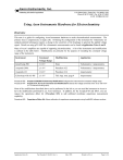 Axon Instruments, Inc. 1101 Chess Drive, Foster City, CA 94404, USA Phone (415) 571-9400 Fax (415) 571-9500 e-mail: tech@axonet.com Marketing & Scientific Applications Using Axon Instruments Hardware for Electrochemistry Overview This note is a guide for configuring Axon Instruments hardware to make electrochemical measurements. The primary focus is amperometry at single cells. Switching the configuration of the instrument for voltammetry (or stepped potential techniques) requires a change in the sensitivity of the headstage to generate the applied voltage signal. Details on using pCLAMP for voltammetric measurements can be found inApplication Notes 4 and 5. Many of Axon’s amplifiers are capable of supporting electrochemistry. A list of the instruments and modifications is outlined in the table below. Modifications are primarily for the purpose of extending the command voltage range of the instrument. Instrument Command Voltage Range Modifications Application GeneClamp 500 ± 2.0 V None Voltammetry / Amperometry Axopatch 200A ± 1.0 V Procedure #22 Voltammetry / Amperometry Axopatch-1D ± 0.6 V Procedure #14 Amperometry CyberAmp with AI 403 ± 1.0 V This App. note, page 4 Amperometry Procedure #22 - Axopatch 200/200A Voltammetry Modification - Configures the instrument for increased voltage range. Procedure #14 - Axopatch-1A,1B,1C,1D Command Gain Modification - Increases the voltage command of the 1D to 100 mV/V (± 6 V maximum analog input). Most of the modifications described above can be performed in the lab or you can send the instrument to Axon to have the modification performed by an Axon technician. In addition, for the Axopatch-1D and 200A, you can request the capacitance dither kit ( Procedure #23) to add calibrated membrane capacitance measurement capability. Procedure #23 - Capacitance Dither Kit- Allows calibration of capacitance measurements using AxoBASIC software routines. Application Note #6 Part Number 9110-001 Rev A May 1995 Printed in U.S.A. Page 1 of 4 GeneClamp 500 The GeneClamp 500 can be used almost immediately for electrochemistry measurements. Use the following chart to select headstages for your particular application. In particular, select the smallest current range which will fit your needs. This will ensure the best amplifier noise performance for your measurements (please refer to Axon’s Product Catalog for noise specifications). GeneClamp 500 Headstages for Electrochemistry Headstage Current Range Example Applications CV-5-100MU ± 100 nA Fast scan cyclic voltammetry CV-5-1GU ± 10 nA Vesicular measurements at chromaffin cells CV-5-100GU ± 0.1 nA Electrochemistry at neurons Instrument Configuration The headstage should be connected to the electrode through a stable drift-free interface such as the HL-U electrode holder. In addition, a stable reference potential is required and is obtained by connecting a reference electrode through the ground of the headstage. The reference electrode can be placed directly into the bath of the preparation or can be isolated from the solution. This is done by placing the reference electrode into a buffered filled micropipette whose tip has been partially blocked with glass wool or Agar (prepared with buffer ions). This, in effect, helps prevent silver ions from the reference electrode from contaminating the solution. Reference electrodes can be obtained from Axon Instruments ( HLA− −003). All connections should be made as short as possible to reduce noise pickup. Care should be taken to avoid bubbles in agar electrodes, since these also increase noise. The CV-5 headstage is connected to the HEADSTAGE #3 (PATCH) input of the instrument. To set the electrode voltage, select the V3 button to display the voltage on the DC METER panel and dial in the DC COMMAND POTENTIAL desired (you must select the polarity). If you are using the scaled output, select the I3 button to monitor the electrode current and select a filter frequency and gain. If you will be using pCLAMP’s Fetchex or AxoTape to record the current measurements, you will want to set up telegraphing to record the instrument options selected. The configuration described is suitable for making amperometric measurements at single cells. For voltammetry, you will have to provide an input command voltage through the External Patch Clamp Command input on the rear panel. If you will be making voltammetric measurements, you should refer to Application Notes 4 and 5. Application Note #6 Part Number 9110-001 Rev A May 1995 Printed in U.S.A. Page 2 of 4 Axopatch 200A The Axopatch 200A is an ideal instrument for the electrochemical measurement of quantal release. The Axopatch 200A is a good instrument for voltammetry (in whole cell mode), but the strength of the instrument is in its lownoise patch amplifier circuitry. The Axopatch 200A contributes only 0.02 pA rms (0.1-1 kHz) to the overall noise while providing a large dynamic range. The best electrochemical sensors used for these studies have an associated capacitance of 2-10 pF which yields about 1 pA p-p of noise 0.03-1 kHz. Unlike many amplifiers (based on resistive feedback technology), the 200A will allow you to maximize the advantage of using low-noise electrodes. Modifications If your electrochemical measurements require a voltage range > 200 mV, you must perform the modifications described in Procedure #22 or have a suitable source for overdriving the voltage command input. Do not overdrive an Axopatch 200; this will damage the instrument. There are several ways to obtain the ±1 V range: change the holding potential to 100 mV/turn, or change the external command sensitivity (front or rear switched) to 100 mV/V. The field kit for the modification contains the required resistors, labels and instructions and is provided by Axon free of charge. If you choose not to modify your instrument, command voltages >200 mV can be obtained by driving the command voltage input to voltages greater than 10 V (overdriving). For ex