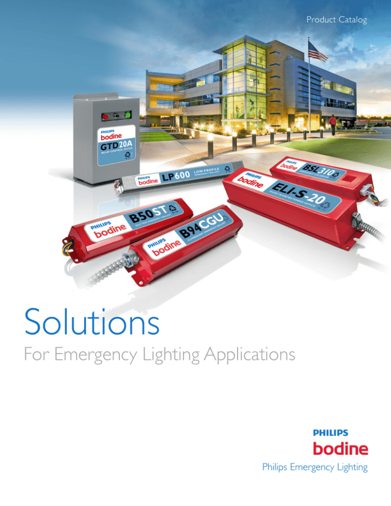 Product Catalog Solutions For Emergency Lighting Applications Philips Emergency Lighting Contents 4 What is Emergency Lighting? 6 Emergency Lighting System Design 8 Emergency Code 10 Code-Required Testing 12 Linear 14 LP Series 16 Compact 18 Emergency LED Drivers 20 Product Summary 22 REDiTEST 24 RCT Series 26 Cold-Pak 28 Generator 30 ARC Keeper 32 ELI Series Mini Inverter 34 ELI Series Micro Inverter 36 Special Applications 38 Factory Installation Only What is Emergency Lighting? Emergency lighting is a vital part of every facility’s life safety program. Local, state and national building codes, such as the NFPA® Life Safety Code® and National Electrical Code®, require reliable and sufficient emergency illumination for commercial, industrial and institutional buildings in the United States. When normal power fails for any reason, emergency lighting provides critical illumination. It guides building occupants along the path of egress to the nearest exit and helps to deter injuries en route. Emergency illumination shall be provided for a minimum of 1½ hours in the event of failure of normal lighting. (7.9.2.1, NFPA® Life Safety Code® 2012) Philips Bodine Emergency Lighting Provides Instant Backup Philips Bodine emergency lighting products provide instant backup lighting whenever normal power fails. Philips Bodine fluorescent emergency ballasts, emergency LED drivers and emergency lighting mini and micro inverters deliver 90 minutes of battery-supplied power. Complements Original Designs Philips Bodine emergency lighting products complement original lighting designs. Because they can be installed inconspicuously inside, on top of, near or remote from the fixture – depending on factors such as fixture, emergency lighting product and product model – they do not detract from fixture or interior design. Philips Bodine emergency lighting is emergency lighting you’ll never see until you need it. Looks Like Normal Lighting Philips Bodine emergency lighting products use the same light source for normal and emergency lighting. As a result, emergency lighting appears similar to lighting under normal conditions. No drastic change in lighting or unwanted glare occurs. 4 What is Emergency Lighting? Application Philips Emergency Lighting provides Philips Bodine emergency lighting products for a wide variety of applications, including fluorescent, LED, HID and incandescent. Products are available for indoor, damp and hazardous locations, as well for longer runtimes and for special voltages and line frequencies. Operation When normal power fails, Philips Bodine emergency lighting products sense the loss and immediately switch into emergency mode. Reduces the Risk of Tampering Philips Bodine emergency lighting products may be installed inside, on top of, near or remote from the fixture – depending on factors such as fixture, emergency lighting product and product model. This inconspicuous positioning reduces the risk of tampering and vandalism. Saves Time and Reduces Labor Costs Philips Bodine emergency lighting products are factory or field installed.* In field applications, a qualified electrician can typically install our products in less than 30 minutes. * Some Philips Bodine emergency lighting products, including our emergency LED drivers, are suitable for factory installation only. When normal power fails, Philips Bodine emergency lighting products sense the loss and immediately switch into emergency mode. For many of our product lines, including Philips Bodine fluorescent emergency ballasts, emergency LED drivers and mini and micro inverters, this means the emergency lighting unit immediately begins supplying supplemental power to support emergency lighting operation for a minimum of 90 minutes. When normal power is restored, the Philips Bodine emergency lighting unit returns to the charging mode. UL Testing Philips Bodine emergency lighting products are tested by Underwriters’ Laboratories (UL) in accordance with standards set forth in UL 924, “Emergency Lighting and Power Equipment.” Products are UL Listed for factory or field installation or Component Recognized for factory installation only. Philips Emergency Lighting also offers Philips Bodine emergency lighting products that are CSA Certified for Canada and NOM Certified for Mexico. Solutions catalog 5 Emergency Lighting System Design Codes and regulations establish guidelines for emergency lighting equipment. However, there may be circumstances that call for more than minimum standards. Incorporating the right combination of elements into emergency lighting design provides a higher degree of safety and allows people to exit a building quickly and safely in the event of an emergency. The best emergency lighting system is carefully planned for a specific building and its occupants. As a part of this planning process, it is important to consider a variety of factors. As a part of the planning process, it is important to consider a variety of factors. Proximity, Shape and Size of Exits The configuration of walls adjoining the exit way, the amount of space devoted to exit passages and travel distance to exits should be considered when determining the number and placement of emergency lighting units. For example, it is important to place emergency lighting at an intersection of a corridor or hallway. If it is a large area, additional units may be needed to provide adequate light to see any objects blocking the exit path. Emergency lighting should be evenly spaced. Number of Persons Expected to Occupy a Building The number of people expected to occupy a building and their knowledge of its interior also influence the level of emergency illumination needed. Large numbers of people unfamiliar with exit paths require more emergency lighting than smaller numbers of people who know the surroundings. Consequently, auditoriums, convention halls and sports arenas often need higher levels of emergency illumination than factories, office 