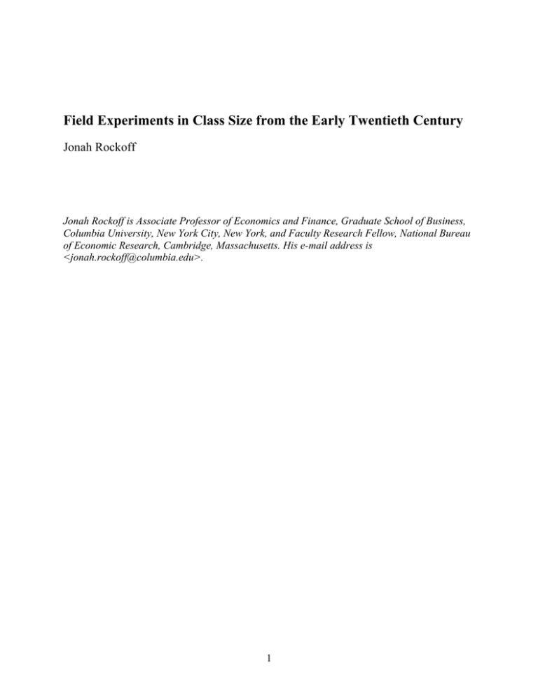 Field Experiments in Class Size from the Early Twentieth Century Jonah Rockoff Jonah Rockoff is Associate Professor of Economics and Finance, Graduate School of Business, Columbia University, New York City, New York, and Faculty Research Fellow, National Bureau of Economic Research, Cambridge, Massachusetts. His e-mail address is <jonah.rockoff@columbia.edu>. 1 A vast majority of adults believe that class size reductions are a good way to improve the quality of public schools. For example, the Gallup Poll of the Public’s Attitudes Toward the Public Schools (an annual survey representative of the non-institutionalized U.S. population age 18 and over) asked respondents in 1999 what they would do to improve public schools if they could change one thing; reducing class size was the most prevalent choice among parents of public school children and the second most prevalent choice (after increased discipline) among individuals without children. Reviews of the research literature, on the other hand, have provided mixed messages on the degree to which class size matters for student achievement (for example, Glass and Smith 1978; Hanushek, 1986; Hedges, Laine, and Greenwald, 1994; and Krueger, 2003). The literature since World War II has followed two main tracks. A wave of research on class size from the 1950s into the 1990s typically used modern statistical methods to analyze large datasets containing information on a variety of educational inputs and outcomes. However, in the last decade or two, economists have focused on the difficulty of using observational data on class size to draw inferences about causal relationships. After all, class size is likely to be correlated with a number of factors not observable to the researcher, like the willingness of parents and the local community to support education in many ways, and so the specific effect of class size may be hard to identify. Thus, researchers turned to studying experimental and quasiexperimental variation in class size (for example, Angrist and Lavy, 1999; Krueger, 1999; Hoxby, 2000). Tennessee’s Student Teacher Achievement Ratio Project—“Project STAR,” as it is known—is the most prominent example. The largest class size experiment ever conducted, it involved the participation of 79 schools, 328 classes, and roughly 6500 students when it began in 1985. Students and teachers were randomly assigned to small or large classes (averaging 15 or 23 students, respectively) from kindergarten through third grade, and students have been followed over time. The numerous studies sparked by Project STAR present persuasive evidence that major class size reductions at early ages can have significant short- and long-term benefits (for example, Bain and Achilles, 1986; Word et al., 1990; Krueger, 1999; and Krueger and 2 Whitmore, 2001). It is difficult to overstate the impact of this research on the class size debate and support for class size reduction policies. Far less well known is a substantial body of experimental work on class size that developed prior to World War II. These field experiments did not have the benefit of modern econometrics and only a few were done on a reasonably large scale. However, they often used careful empirical designs, and the collective magnitude of this body of work is considerable. Moreover, this research produced little evidence to suggest that students learn more in smaller classes, which stands in contrast to some, though not all, of the most recent work by economists. In this essay, I provide an overview of the scope and breadth of the field experiments in class size conducted prior to World War II, the motivations behind them, and how their experimental designs were crafted to deal with perceived sources of bias. I conclude with a discussion of how one might interpret the findings of these early experimental results alongside more recent research, and how research on class size has shifted towards using instrumental variables rather than field experiments to address the class size issue empirically. A Wave of Class Size Research Larger classes make for fewer teachers and lower building costs. Increasing the size of classes, then, offers an obvious and tempting means to immediate educational economy. Earl Hudelson (1928), University of Minnesota Forty-five studies of the impact of class size on student achievement were published prior to 1940 (see Figure 1).1 While only a handful of such studies surfaced before 1920, publications surged over the next decade, peaked in 1929, and trailed off in the mid-1930s. Thirteen of these studies (including all of those published before 1920) were correlational analyses of observational data, and eight used observational data but employed matching methods to control for student characteristics (that is, each student in a smaller class was paired with a similar student in a larger class, and outcomes for the paired students were analyzed). The remaining 24 1 These 45 studies include only the analyses of primary data that focused on the effect of class size, and exclude reports of summary statistics, literature reviews, opinion pieces, and criticism of other research. Full citations are provided in an online appendix to this paper available at <http://www.e-jep.org>. 3 studies were field experiments, with research designs that involved active assignment of pupils and teachers to classrooms of different sizes. To give a better sense of the scope of this work, I have taken the 24 field experiments and broken them down along a number of dimensions, presented in Table 1. Studies were conducted in 13 states and involved the participation of roughly 80 schools, 650 classrooms, and 17,000 students in a wide range of educational settings. Seventeen studies examined class size at the high school level, including roughly 13,000 students. Fewer but still significant numbers of investigations were made in grades K–3 (two studies, 1,000 students), grades 4–8 (five studies, 1,80