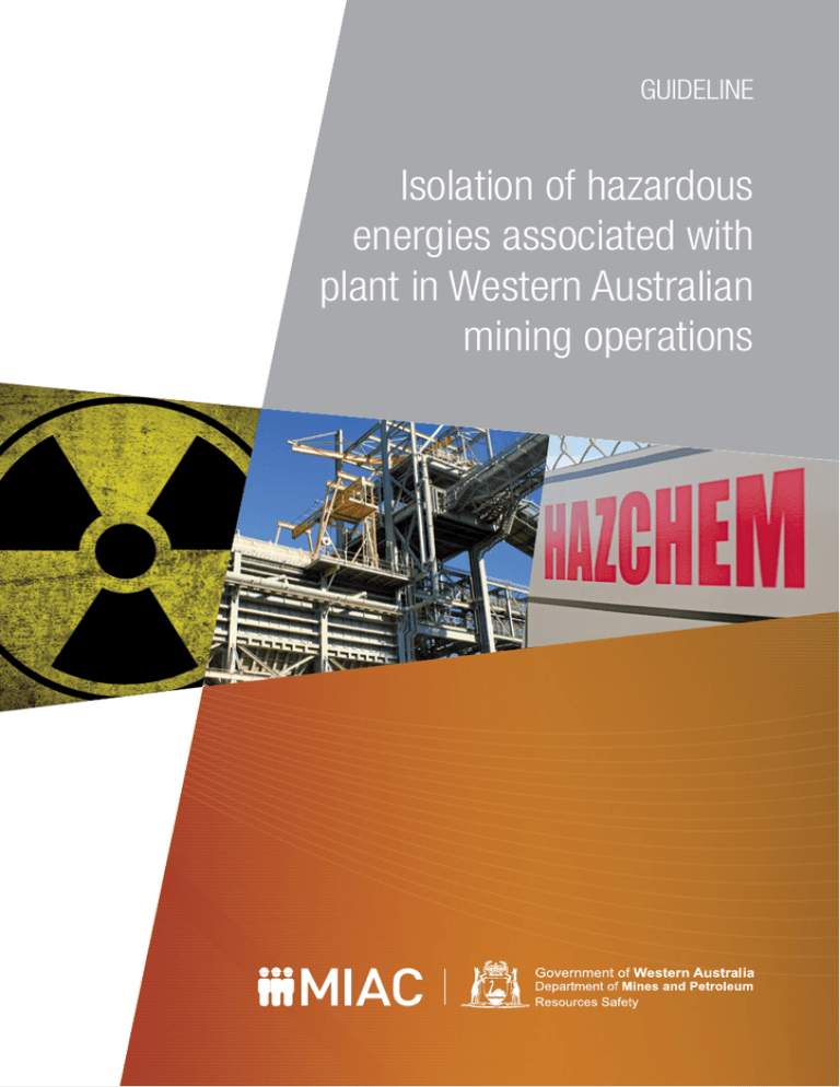 GUIDELINE Isolation of hazardous energies associated with plant in Western Australian mining operations GUIDELINE Isolation of hazardous energies associated with plant in Western Australian mining operations Disclaimer Reference The information contained in this publication is provided in good faith and believed to be reliable and accurate at the time of publication. However, the information is provided on the basis that the reader will be solely responsible for assessing the information and its veracity and usefulness. The recommended reference for this publication is: Department of Mines and Petroleum, 2015, Isolation of hazardous energies associated with plant in Western Australian mining operations — guideline: Resources Safety, Department of Mines and Petroleum, Western Australia, 42 pp. The State shall in no way be liable, in negligence or howsoever, for any loss sustained or incurred by anyone relying on the information, even if such information is or turns out to be wrong, incomplete, out-of-date or misleading. Except where the Copyright Act otherwise allows, reproduction in whole or part of this publication will be permitted only with the prior written permission of the Department of Mines and Petroleum. Applications for permission should be addressed to the Manager Safety Communications, Resources Safety. In this disclaimer: This publication is available on request in other formats for people with special needs. State means the State of Western Australia and includes every Minister, agent, agency, department, statutory body corporate and instrumentality thereof and each employee or agent of any of them. Information includes information, data, representations, advice, statements and opinions, expressly or implied set out in this publication. Loss includes loss, damage, liability, cost, expense, illness and injury (including death). ISBN 978 1 92 1149 39 8 © Department of Mines and Petroleum 2015. This publication is also available in digital format (PDF) online at www.dmp.wa.gov.au/ ResourcesSafety Further details of publications produced by Resources Safety can be obtained by contacting: Resources Safety — Safety Communications Department of Mines and Petroleum 100 Plain Street EAST PERTH WA 6004 Telephone +61 8 9358 8002 (general queries) +61 8 9358 8154 (publication orders) NRS 13 36 77 Facsimile +61 8 9358 8000 EmailResourcesSafety@dmp.wa.gov.au (general queries) RSDcomms@dmp.wa.gov.au (publication orders) ii Isolation of hazardous energies in plant in Western Australian mining operations – guideline Contents Foreword .................................................................................. iv 1 Introduction.............................................................................1 2 Risk management process......................................................3 3 Management of isolations........................................................8 4 Isolation of hazardous energies in fixed plant.........................14 5 Isolation of hazardous energies in mobile plant......................19 6 Locking and tagging..............................................................22 7 Training and competency.......................................................27 8 Document control and record keeping...................................29 Appendix 1 Legislative provisions................................................31 Appendix 2 Selected Australian and international standards and codes........................................................................33 Appendix 3 Glossary....................................................................40 Appendix 4 Further guidance.......................................................42 Isolation of hazardous energies in plant in Western Australian mining operations – guideline iii Guidelines A guideline is an explanatory document that provides more information on the requirements of legislation, details good practice, and may explain means of compliance with standards prescribed in the legislation. The government, unions or employer groups may issue guidance material. Compliance with guidelines is not mandatory but they could have legal standing if it were demonstrated that the guideline is the industry norm. Who should use this guideline? This guideline should be used by anyone who has responsibilities to develop, authorise, provide, implement, use and maintain workplace safety and health systems in a mining operation where there is the potential for exposure to hazardous energies. iv Foreword This guideline is issued by Resources Safety under the Mines Safety and Inspection Act 1994, and has been endorsed by the Mining Industry Advisory Committee. The Act The Mines Safety and Inspection Act 1994 (the Act) sets objectives to promote and improve occupational safety and health standards within the minerals industry. The Act sets out broad duties, and is supported by regulations, together with codes of practice and guidelines. Regulations The Mines Safety and Inspection Regulations 1995 (the regulations) provide more specific requirements for a range of activities. Like the Act, regulations are enforceable and breaches may result in prosecution, fines, or directions to cease operations and undertake remedial action. Acknowledgement Standards This guideline was developed through consultation with industry during the 2014 Mines Safety Roadshow. Early drafts were based on Isolation of plant – guidance note, published by the WorkSafe WA in 2010, Isolation procedures – guidance note 02, published by the Queensland Government in 2008, and Managing risks of plant in the workplace – code of practice, published by the Queensland Government in 2013. Although specific versions of Australian and other standards may apply under the regulations, references to standards in this guideline are undated and it is good practice to consult the latest versions where applicable. Application The provisions of this guideline apply to al