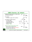 CMOS Inverter: DC Analysis • Analyze DC Characteristics of CMOS Gates by studying an Inverter • DC Analysis – DC value of a signal in static conditions • DC Analysis of CMOS Inverter – – – – – Vin, input voltage Vout, output voltage single power supply, VDD Ground reference find Vout = f(Vin) • Voltage Transfer Characteristic (VTC) – plot of Vout as a function of Vin – vary Vin from 0 to VDD (and in reverse!) – find Vout at each value of Vin ECE 410, Prof. F. Salem/Prof. A. Mason notes update Lecture Notes 7.1 1 Inverter Voltage Transfer Characteristics • Output High Voltage, VOH – maximum output voltage • occurs when input is low (Vin = 0V) • pMOS is ON, nMOS is OFF • pMOS pulls Vout to VDD – VOH = VDD • Output Low Voltage, VOL – minimum output voltage • occurs when input is high (Vin = VDD) • pMOS is OFF, nMOS is ON • nMOS pulls Vout to Ground – VOL = 0 V • Logic Swing – Max swing of output signal • VL = VOH - VOL • VL = VDD ECE 410, Prof. F. Salem/Prof. A. Mason notes update Lecture Notes 7.2 2 Inverter Voltage Transfer Characteristics • Gate Voltage, f(Vin) –VDSn=Vout, VSDp=VDD-Vout + VSGp Transition Region (between VOH and VOL) – Vin low • Vin < Vtn + – Mn in Cutoff, OFF VGSn – Mp in Triode, Vout pulled to VDD – VGSn=Vin, VSGp=VDD-Vin • •Drain Voltage, f(Vout) • Vin > Vtn < ~Vout – Mn in Saturation, strong current – Mp in Triode, VSG & current reducing – Vout decreases via current through Mn – Vin = Vout (mid point) ≈ ½ VDD – Mn and Mp both in Saturation – maximum current at Vin = Vout – Vin high Vin < VIL input logic LOW • Vin > ~Vout, Vin < VDD - |Vtp| – Mn in Triode, Mp in Saturation • Vin > VDD - |Vtp| – Mn in Triode, Mp in Cutoff Vin > VIH input logic HIGH ECE 410, Prof. F. Salem/Prof. A. Mason notes update Lecture Notes 7.3 3 Noise Margin • Input Low Voltage, VIL – Vin such that Vin < VIL = logic 0 – point ‘a’ on the plot • where slope, ∂Vin = −1 ∂Vout • Input High Voltage, VIH – Vin such that Vin > VIH = logic 1 – point ‘b’ on the plot • where slope =-1 • Voltage Noise Margins – measure of how stable inputs are with respect to signal interference – VNMH = VOH - VIH – VNML = VIL - VOL = VDD - VIH = VIL – desire large VNMH and VNML for best noise immunity ECE 410, Prof. F. Salem/Prof. A. Mason notes update Lecture Notes 7.4 4 Switching Threshold • Switching threshold = point on VTC where Vout = Vin – also called midpoint voltage, VM – here, Vin = Vout = VM • Calculating VM – at VM, both nMOS and pMOS in Saturation – in an inverter, IDn = IDp, always! – solve equation for VM I Dn = βn 2 μ nCOX W 2 L (VGSn − Vtn ) 2 = βn 2 (VGSn − Vtn ) 2 = – express in terms of VM (VM − Vtn ) 2 = βp 2 (VDD − VM − Vtp ) 2 – solve for VM VM = 1+ 2 (VSGp − Vtp ) 2 = I Dp βn (V − Vtn ) = VDD − VM − Vtp βp M ⇒ VDD − Vtp + Vtn βp βn βp βn βp ECE 410, Prof. F. Salem/Prof. A. Mason notes update Lecture Notes 7.5 5 Effect of Transistor Size on VTC • Recall β n = k 'n W L βn = βp ⎛W ⎞ k 'n ⎜ ⎟ ⎝ L ⎠n ⎛W ⎞ k'p ⎜ ⎟ ⎝ L ⎠p VDD − Vtp + Vtn VM = 1+ • If nMOS and pMOS are same size – (W/L)n = (W/L)p – Coxn = Coxp (always) • If ⎛W ⎞ ⎜ ⎟ μn ⎝ L ⎠ p β = , then n = 1 μp ⎛W ⎞ βp ⎜ ⎟ L ⎝ ⎠n βn = βp βn βp βn βp ⎛W ⎞ ⎟ ⎝ L ⎠ n = μ n ≅ 2or 3 μp ⎛W ⎞ μ pCoxp ⎜ ⎟ ⎝ L ⎠p μ nCoxn ⎜ since L normally min. size for all tx, can get betas equal by making Wp larger than Wn • Effect on switching threshold – if βn ≈ βp and Vtn = |Vtp|, VM = VDD/2, exactly in the middle • Effect on noise margin – if βn ≈ βp, VIH and VIL both close to VM and noise margin is good ECE 410, Prof. F. Salem/Prof. A. Mason notes update Lecture Notes 7.6 6 Example • Given – k’n = 140uA/V2, Vtn = 0.7V, VDD = 3V – k’p = 60uA/V2, Vtp = -0.7V • Find – a) tx size ratio so that VM= 1.5V – b) VM if tx are same size transition pushed lower as beta ratio increases ECE 410, Prof. F. Salem/Prof. A. Mason notes update Lecture Notes 7.7 7 CMOS Inverter: Transient Analysis • Analyze Transient Characteristics of CMOS Gates by studying an Inverter • Transient Analysis – signal value as a function of time • Transient Analysis of CMOS Inverter – – – – Vin(t), input voltage, function of time Vout(t), output voltage, function of time VDD and Ground, DC (not function of time) find Vout(t) = f(Vin(t)) • Transient Parameters – output signal rise and fall time – propagation delay ECE 410, Prof. F. Salem/Prof. A. Mason notes update Lecture Notes 7.8 8 Transient Response • Response to step change in input – delays in output due to parasitic R & C • Inverter RC Model – Resistances – Rn = 1/[βn(VDD-Vtn)] – Rp = 1/[βn(VDD-|Vtp|)] + Vout CL - – Output Cap. (only output is important) • CDn (nMOS drain capacitance) – CDn = ½ Cox Wn L + Cj ADnbot + Cjsw PDnsw – CDp = ½ Cox Wp L + Cj ADpbot + Cjsw PDpsw • CDp (pMOS drain capacitance) • Load capacitance, due to gates attached at the output – CL = 3 Cin = 3 (CGn + CGp), 3 is a “typical” load • Total Output Capacitance – Cout = CDn + CDp + CL term “fan-out” describes # gates attached at output ECE 410, Prof. F. Salem/Prof. A. Mason notes update Lecture Notes 7.9 9 Fall Time • Fall Time, tf – time for output to fall from ‘1’ to ‘0’ – derivation: ∂V V i = −Cout out = out ∂t Rn • initial condition, Vout(0) = VDD time constant • solution t Vout (t ) = VDD e − τn τn = RnCout ⎛V ⎞ t = τ n ln⎜ DD ⎟ ⎝ Vout ⎠ – definition • tf is time to fall from 90% value [V1,tx] to 10% value [V0,ty] ⎡ ⎛ V ⎞ ⎛ V ⎞⎤ t = τ n ⎢ln⎜⎜ DD ⎟⎟ − ln⎜⎜ DD ⎟⎟⎥ ⎝ 0.9VDD ⎠⎦ ⎣ ⎝ 0.1VDD ⎠ • tf = 2.2 τn ECE 410, Prof. F. Salem/Prof. A. Mason notes update Lecture Notes 7.10 10 Rise Time • Rise Time, tr 