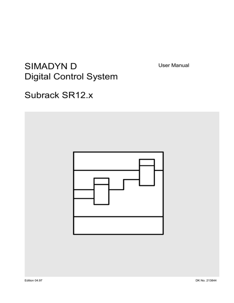 SIMADYN D Digital Control System User Manual Subrack SR12.x Edition 04.97 DK No. 213844 User Manual, Subrack SR12.x Edition Status 1 Subrack SR12.x 05.95 2 Subrack SR12.x 04.97 Copying of this document and giving it to others and the use or communication of the contents thereof is forbidden without express authority. Offenders are liable to the payment of damages. All rights are reserved in the event of the grant of a patent or the registration of a utility model or design. We have checked the contents of this Manual to ensure that they coincide with the described hardware and software. However, deviations cannot be completely ruled-out, so we cannot guarantee complete conformance. However, the information in this document is regularly checked and the necessary corrections included in subsequent editions. We are thankful for any recommendations or suggestions. Contents Contents Warning information................................ ................................ ................................ ........................ 1 1. Ordering information and supplementary components................................ ................................ . 3 2. Function description................................ ................................ ................................ .................... 3 2.1. Overview ................................ ................................ ................................ ..................... 3 2.2. Bus system................................ ................................ ................................ .................. 4 2.3. Bus arbitration................................ ................................ ................................ .............. 4 2.4. Bus termination................................ ................................ ................................ ............ 4 3. Power supply................................ ................................ ................................ ............................... 5 3.1. Front panel ................................ ................................ ................................ .................. 5 3.2. Input voltage................................ ................................ ................................ ................ 5 3.2.1. 24 V DC voltage for SR12.1 and SR12.2................................ ....................... 5 3.2.2. 115/ 230 V AC for SR12.3 and SR12.4................................ .......................... 6 3.3. Fan assembly in the SR12.1 and SR12.3 subracks................................ ...................... 6 3.4. Battery ................................ ................................ ................................ ......................... 6 3.5. Line filter................................ ................................ ................................ ...................... 7 3.6. Ground connections within the subrack................................ ................................ ........ 7 3.6.1. Subracks SR12.1 and SR12.2 (SP22, SP23)................................ ................. 7 3.6.2. Subracks SR12.3 and SR12.4 (SP22.5, SP23.5)................................ ........... 8 4. Installation guidelines................................ ................................ ................................ .................. 8 4.1. Noise immunity ................................ ................................ ................................ ............ 8 5. Technical data................................ ................................ ................................ ............................. 9 5.1. General data................................ ................................ ................................ ................ 9 5.2. Electrical data SR12.1 (SP22) and SR12.2 (SP23)................................ ...................... 10 5.3. Electrical data, SR12.3 (SP22.5) and SR12.4 (SP23.5)................................ ................ 10 6. STRUC L mask in the master program................................ ................................ ........................ 11 7. Connector assignment................................ ................................ ................................ ................. 12 7.1. Signal assignment, backplane bus................................ ................................ ............... 12 8. Others................................ ................................ ................................ ................................ ......... 12 8.1. Attachments................................ ................................ ................................ ................. 12 8.2. Terminology/ abbreviations................................ ................................ .......................... 12 9. ESD instructions................................ ................................ ................................ .......................... 13 Siemens AG Dk No. 213844 SIMADYN D Hardware User Manual Edition 04.97 Warning information Edition 04.97 Siemens AG Dk No. 213844 SIMADYN D Hardware User Manual Warning information N O T E! The information in this Manual does not purport to cover all details or variations in equipment, nor to provide for every possible contingency to be met in connection with installation, operation or maintenance. Should further information be desired or should particular problems arise which are not covered sufficiently for the purchaser’s purposes, please contact your local Siemens office. Further, the contents of this Manual shall not become a part of or modify any prior or existing agreement, committment or relationship. The sales contract contains the entire obligation of Siemens. The warranty contained in the contract between the parties is the sole warranty of Siemens. Any statements contained herein do not create new warranties nor modify the existing warranty. Warning information WARNING! Electrical equipment has components which are at dangerous voltage levels. If th
