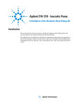 Agilent 210/218 - Isocratic Pump Installation of the Stainless Steel Tubing Kit Introduction This technical note shows you how to install the Stainless Steel Tubing Kit for the isocratic pump of the Agilent 218 Solvent Delivery Module. The tubing is pre-cut and bent to fit between components when placed on the mast in the correct location. Follow the directions in this note carefully when assembling and installing the mast kit, injection valve, prime/purge valve and 3-way pump head prime valves. Agilent Technologies Delivery Checklist Delivery Checklist Make sure all parts and materials have been delivered with the installation kit. Please report missing or damaged parts to your local Agilent Technologies sales and service office. The follow items are supplied with the Isocratic Pump Stainless Steel Tubing Kit, 1/16 in x 0.02 in i.d. (p/n 9910138000): p/n Description 1610141800 Nut, stainless steel, 10 – 32 x 1 /16 in, pack of 2. Use part number AL206085 when ordering replacements. 1610143200 Ferrule, stainless steel, 1 /16 in, pack of 2. Use part number AL286075 when ordering replacements. 3710064300 Tubing, pump head to pressure module, 1/16 in x 0.02 in i.d. 3710064700 Tubing, purge valve to manual injection valve, 1/16 in x 0.02 in i.d. 3710065000 Tubing, pressure module to purge valve, 1/16 in x 0.02 in i.d. Installing the Mast Kit The mast kit includes installation of the: • Mast • Manual injection valve • Prime/purge valve • 3-way pump head primve valve (If included with the pumphead that was purchased.) 2 Installing the Mast Kit Assembling the Manual Injection Valve and Bracket Assembling the Manual Injection Valve and Bracket Tools required Description Hex key, 2 mm 1 Unpack the injection valve and attached black cable. 2 Remove the red dust cover and gently pull out the needle port from the valve. HZaZXi^dckVakZ 9jhi8dkZg l^i]cZZYaZ edgi^ch^YZ HZaZXi^dckVakZ \gjWhXgZl 3 Remove the selection handle from the valve by loosening the two grub screws securing it to the injection valve body using the provided 2 mm hex key. 4 Remove the two screws and injection valve bracket from the accessories bag that came with the injection valve. 5 Attach the bracket to the injection valve with the two screws. ;aVih^YZd[ bZiVaedhi 3 Installing the Mast Kit Assembling the Manual Injection Valve and Bracket 6 Replace the selection handle and tighten the two grub screws securing the handle using the 2 mm hex key. The grub screws should be flush with the flat side of the metal post. CZZYaZ edgi 4 7 Replace the needle port in the valve. Installing the Mast Kit Assembling the Prime/Purge Valve and Bracket Assembling the Prime/Purge Valve and Bracket Tools required Description Hex key, 2 mm 1 Unpack the stainless steel purge valve and purge valve bracket. 2 Remove the knob and nut from the purge valve. The knob is held in place with a grub screw which is loosened using a 2 mm hex key. <gjWhXgZl Cji @cdW 3 Secure the valve to the valve bracket using the nut. 4 Replace the knob on the valve and tighten the grub screw using the provided 2 mm hex key. 5 Installing the Mast Kit Assembling the 3-way Pump Head Prime Valve Assembling the 3-way Pump Head Prime Valve Tools required Description Hex key, 2 mm CAUTION Overtighting the fittings may cause damage to the fittings. ➔ Do not over-tighten the fittings. ➔ Finger-tighten the nut only and use only the provided hex key to tighten the selection knob. 1 Unpack the stainless steel 3-way valve and bracket. 2 Using the 2 mm hex key, loosen the grub screw and slide off the selection knob. G^Y\ZYlVh]Zg Cji HZaZXi^dc`cdW <gjWhXgZl ;aVilVh]Zg KVakZWdYn 6 Installing the Mast Kit Assembling the 3-way Pump Head Prime Valve 3 Unscrew the nut and then remove the two washers from the 3-way valve. 4 Attach the bracket so that the three holes on the 3-way valve face away from the thumbscrew. ;aVih^YZd[ bZiVaedhi =daZh^c("lVn kVakZWdYn 5 Place the flat washer and then ridged washer on the 3-way 7 Slide the selection knob onto the 3-way valve. valve. Screw the nut on to secure the two washers. 6 Using the clear tubing supplied in the pump head kit, install the shorter piece. NOTE The engraved lines on the top of the selection knob should point to the holes in the black body of the 3-way valve. The grub screw should be flush with the flat side of the metal post on the 3-way valve. 8 Secure the selection knob to the 3-way valve using only the provided 2 mm hex key. Do not over-tighten. 7 Installing the Mast Kit Installing the Mast Installing the Mast Make sure the manual injection valve, prime/purge valve and 3-way pump head prime valve have a bracket attached before installing them onto the mast. See the corresponding procedures in this note for more information about the installation of the brackets for each valve. NOTE Perform the procedure only if a mast kit is not already installed. 1 Remove the mast, brackets and two pan-head screws from the Mast Kit Assembly. 2 Attach a mast clamp to the fittings at the front corner of the 210/218 pump or one at the lower front corner of the pump and one at the top front corner of the Agilent detector, if fitted, see Figure 1 on page 8. BVhiXaVbe Figure 1 Mast clamp installation 3 Secure the stainless-steel mast within the clamps so the lower end of the mast is level with the bench. 8 Installing the Mast Kit Installing the Mast 4 Attach each valve to the mast in the heights described in Table 1 on page 9 and shown Figure 2 on page 9. Table 1 NOTE Valve heights Valve Height Injection Valve 285 mm Prime/purge Valve 185 mm 3-way Valve 100 mm Valve heights are measured from the top of the bench to the bottom of the valve brackets. Tubing length and bends may vary slightly. Use the heights listed as a starting point and move the valves up or down to accommodate the tubing, if required. Avoid bending the tubing when installing it. >c_ZXi^dckVakZ]Z^\]i dcbVhi!'-*bb Eg^bZ$ejg\ZkVkaZ]Z^\]i dcbVhi!&-*bb AdlegZhhjgZ hdakZcikVakZ]Z^\]i dcb