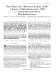 1414 IEEE TRANSACTIONS ON INDUSTRY APPLICATIONS, VOL. 39, NO. 5, SEPTEMBER/OCTOBER 2003 Three-Phase Active Harmonic Rectifier (AHR) to Improve Utility Input Current THD in Telecommunication Power Distribution System Sangsun Kim, Member, IEEE, Maja Harfman Todorovic, Student Member, IEEE, and Prasad N. Enjeti, Fellow, IEEE Abstract—Modern telecommunication power supply systems have several parallel-connected switch-mode rectifiers to provide 48 Vdc. A typical switch-mode rectifier configuration includes a three-phase diode rectifier followed by a dc–dc converter. Such a system draws significant harmonic currents for the utility, resulting in poor input power factor and high total harmonic distortion. In this paper, a three-phase active harmonic rectifier (AHR) scheme is proposed. In the AHR scheme, a diode rectifier module is replaced by a six-insulated-gate-bipolar-transistor pulsewidth-modulation rectifier to supply load harmonics as well as its own active power. Each dc–dc converter module is connected to a shared 48-V dc link. The AHR module together with parallel-connected switch-mode rectifiers is controlled to achieve clean input power characteristics. The VA ratings of the AHR scheme is compared with an active power filter approach. The control design is based on the synchronous reference frame approach. Analysis, simulation, and experimental results show that the AHR offers several advantages such as lower VA rating, better current control response, efficient use of the AHR dc link, small size, and stable dc-link voltage control. Index Terms—Active harmonic rectifier (AHR), active power filter (APF), telecom rectifier, total harmonic distortion (THD). I. INTRODUCTION M ODERN telecommunication power systems require several three-phase rectifiers in parallel to obtain higher dc power with 48 Vdc. Such a rectifier normally employs diodes or silicon-controlled rectifiers (SCR) to interface with the electric utility due to economic reasons. The rectifier-type utility interface causes significant harmonic currents, resulting in poor input power factor and high total harmonic distortion (THD), which contributes to an inefficient use of electric energy. The above-mentioned rectifier is referred to as a nonlinear load. The Paper IPCSD 03–069, presented at the 2003 IEEE Applied Power Electronics Conference and Exposition, Miami Beach, FL, February 9–13, and approved for publication in the IEEE TRANSACTIONS ON INDUSTRY APPLICATIONS by the Industrial Power Converter Committee of the IEEE Industry Applications Society. Manuscript submitted for review December 1, 2002 and released for publication May 16, 2003. S. Kim was with the Power Electronics and Power Quality Laboratory, Department of Electrical Engineering, Texas A&M University, College Station, TX 77843-3128 USA. He is now with the Power Conversion Division, Lite-On, Inc., Houston, TX 77070 USA (e-mail: sskim@ieee.org). M. Harfman Todorovic and P. N. Enjeti are with the Power Electronics and Power Quality Laboratory, Department of Electrical Engineering, Texas A&M University, College Station, TX 77843-3128 USA (e-mail: p.enjeti@ieee.org). Digital Object Identifier 10.1109/TIA.2003.816530 proliferation of rectifier loads deteriorates the quality of voltage and current waveforms. Further, harmonic currents can lead to equipment overheating, malfunction of solid-state equipment, and interference with communication systems [1]–[3]. IEEE 519 and IEC EN 61000-3 standards specify regulations governing harmonic compliance [4], [5]. The passive filter has been a viable approach because of low cost and high efficiency [6], [7]. However, the performance of the passive scheme has a limitation since the addition of the passive filter interfaces with the system impedance and causes resonance with other networks. Numerous active solutions which are becoming a more effective means to meet the harmonic standards by overcoming the drawback of the passive filter have been proposed [8]–[11]. Active power filters (APFs) employing a pulsewidth-modulation (PWM) voltage-source inverter seem to be the most preferred scheme for canceling load harmonics. However, the general voltage-source inverter topology employs a relatively large dc-link capacitor to serve as a constant dc voltage source. Therefore, this scheme suffers from a bulky electrolytic capacitor, higher switching losses, and its associated dc-link voltage control issues due to reduced damping. In this paper, a three-phase active harmonic rectifier (AHR) scheme based on space-vector PWM (SVPWM) is proposed. The AHR module together with parallel-connected switch-mode rectifiers [Fig. 2(a)] is controlled to achieve clean input power characteristics. The AHR is compared with the APF based on the analysis of VA power rating. The control reference frame system is designed on the synchronous where a low-pass filter to cancel harmonics offers better performance than the stationary reference frame. The converter fulfills harmonic cancellation as well as powering active power to its own load by PWM rectification [12], [13]. Therefore, the converter carries a fundamental current for active power and harmonics for the nonlinear loads. The proposed scheme provides the following advantages: • reduced dc-link capacitor banks; • VA rating of the AHR is lower than that of the APF with rectifier current THD greater than 35%; times • harmonic rms current of the AHR is smaller than that of APF, where is the number of dc–dc converter modules. • better current control response; • stable control system due to damping provided by the load; 0093-9994/03$17.00 © 2003 IEEE KIM et al.: THREE-PHASE AHR TO IMPROVE UTILITY INPUT CURRENT THD 1415 (a) (a) (b) Fig. 1. Telecom rectifier power system. (a) Telecom distributed rectifiers. (b) Basic telecom rectifier topology. • no additional boost stage; • efficient use of PWM rectifier. II. TELECOM POWER SYSTEM Modern telecommunication systems require a