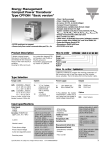 Energy Management Compact Power Transducer Type CPT-DIN “Basic version” • RS232 serial port on request • Alarms (only from serial communication port) VLN, An • Class 2 (active energy) • Class 3 (reactive energy) • Accuracy ±0.5 F.S. (current/voltage) • Compact Power transducer • Instantaneous variables data format: 4 digit • Energies data format: 8+1 digit • System variables and phase measurements: W, Wdmd, Wdmd max, var, VA, VAdmd, PF, V, A, An, Admd, Amax, Admd max, Hz • Energy measurements: kWh and kvarh • Hour counter (5+2 DGT) • TRMS meas. of distorted sine waves (voltages/currents) • Power supply: 90 to 260VAC/DC and 18 to 60VAC/DC • Protection degree (front): IP20 • Dimensions: 45x83.5x98.5mm • RS422/485 serial port Product Description How to order 3-phase compact power transducer. Particularly recommended for the measurements of the main electrical variables. Housing for DIN-rail mount- Model Range code System Power supply Outputs Option ing, protection degree IP20 as standard, and RS485 or RS232 serial port. Parameters programmable by means of CptBSoft. How to order CptBSoft-kit CptBSoft: software to program the working parameters of the transducer and to read the energy and the instantaneous variables. The kit includes the communication cable. Type Selection Range codes System Power supply AV5: 3: L: H: 400/(690)VL-L/5(6)AAC VL-N: 185 V to 460 V VL-L: 320 V to 800 V AV6: 120/(208)VL-L/5(6)AAC VL-N: 45 V to 145 V VL-L: 78 V to 250 V Phase current: 0.03A to 6A Neutral current: 0.09 to 6A CPT-DIN AV5 3 H S1 BX 1: 1, 2 or 3-phase, unbalanced and balanced load, with or without neutral 1-3-phase, balanced load (*) 18 to 60VAC/DC 90 to 260VAC/DC (*) Pay attention: the 3-phase measurement is carried out as one current and one phase to neutral voltage measurement. Outputs S1: S2: RS485 port RS232 port Options BX: Basic features Input specifications Rated inputs Current Voltage Accuracy (RS485/RS232) (@25°C ±5°C, R.H. ≤60%) Current Neutral current Phase-phase voltage Phase-neutral voltage Active and Apparent power, Reactive power 3 (current transformers) 4 with CT=1 and VT=1 AV5: 1150W-VA-var, FS:230VLN, 400VLL; AV6: 285W-VA-var, FS: 57VLN, 100VLL 0.25 to 6A: ±(0.5% FS +1DGT) 0.03A to 0.25A: ±(0.5% FS +7DGT) 0.25 to 6A: ±(1.5% FS +1DGT) 0.09A to 0.25A: ±(1.5% FS+7DGT) ±(1.5% FS + 1DGT) ±(0.5% FS + 0.1DGT) 0.25 to 6A: ±(1%FS +1DGT); 0.03A to 0.25A: ±(1%FS+5DGT) 0.25 to 6A: ±(2% FS +1DGT); Specifications are subject to change without notice Active energy Reactive energy Frequency Additional errors Humidity Temperature drift Sampling rate Measurement refresh time Measurement format Instantaneous variables Energies Hour counter CPT-DINBDS080610 0.03A to 0.25A: ±(2% FS +5DGT) Class 2 (I start up: 30mA) Class 3 (I start up: 30mA) ±0.1Hz (48 to 62Hz) ≤0.3% FS, 60% to 90% RH ≤ 200ppm/°C 1400 samples/s @ 50Hz 1700 samples/s @ 60Hz 700ms 4 DGT (Max indication: 9999) 9 DGT (Max indication: 999 999 99.9) 7 DGT (Max. indication: 9 999 9.99) 1 CPT-DIN Input specifications (cont.) Measurements Type Coupling type Crest factor Input impedance 400/690VL-L (AV5) 120/208VL-L (AV6) Current Frequency Overload protection Continuos voltage/current Current, voltage, power, power factor, frequency, energy, hour counter TRMS measurement of distorted waves. Direct < 3, max 10A peak For 500ms: voltge/current 1 MΩ ±5% 453 KΩ ±5% ≤ 0.02Ω 48 to 62 Hz (max values) AV5: 460VLN, 800VLL/6A AV6: 145VLN, 250VLL/6A AV5: 800VLN, 1380VLL/36A AV6: 240VLN, 416VLL/36A Serial Port Specifications RS422/RS485 Type Connections Addresses Protocol Data (bidirectional) Dynamic (reading only) Static (writing only) Data format Halfduplex communication Multidrop bidirectional (static and dynamic variables) 2 or 4 wires, max. distance 1200m, termination directly on the instrument 1 to 255 selectable via software MODBUS/JBUS (RTU) System, phase variables and energies All configuration parameters 1 start bit, 8 data bit, Baud-rate Insulation RS232 Type Connections Address Protocol Baud-rate no parity, 1 stop bit 9600 bit/s By means of optocuplers, 2kVRMS output to measuring input. 4kVRMS output to power supply Halfduplex communication Point to point connection 3-wire, max. distance 15m 1 to 255 selectable via software MODBUS/JBUS (RTU) 9600bits/s other characteristics like R422/RS485 port RS232 Configuration Bus Connections Baud-rate Data format RJ12 (3-wire) for special cable 4800 bits/s 1 start bit, 8 data bit, no parity, 1 stop bit Insulation By means of optocuplers, 2kVRMS output to measuring input. 4kVRMS output to power supply CptBSoft: parameter programming and reading data software CptBSoft Multi language software to program the working parameters of the transducer and to read the energies and the instantaneous variables. The program runs under Windows 95/98/98SE/2000/ NT/XP. Working mode Data access Two different working modes can be selected: - management of a local RS485 network; - management of communication from a single instrument to PC (RS232); By means of RS232 serial port, RS485 serial port or RS232 configuration port. Software functions System selection Transformer ratio CT VT/PT Filter Operating range Filtering coefficient 2 Filter action 3-ph. with or without N, unbal. 3-phase balanced “1CT + 1VT” 3-phase ARON, unbalanced 2-phase Alarms Single phase 1 to 999 1.0 to 99,9 Reset 0 to 99.9% of the input electrical scale 1 to 16 Measurements, alarms, serial out. (fundamental var: V, A, W and their derived ones). Programmable, for the VLN∑ and An (neutral current). Note: the alarm is only a status transmitted via communication port. Independent alarm (VLN∑, An) max: A dmd, W dmd all energies (Wh, varh) hour counter Specifications are subject to change without notice CPT-DINBDS080610 CPT-DIN Power Supply Specifications Auxiliary power supply 90 to 260VAC/DC 16 to 60VAC/DC Power consumption AC: 4.5 VA DC: 4W General Specifications Front LED’s Power on Diagno