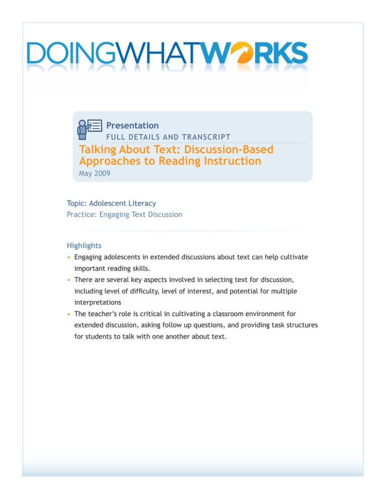 Presentation FULL DETAILS AND TRANSCRIPT Talking About Text: Discussion-Based Approaches to Reading Instruction May 2009 Topic: Adolescent Literacy Practice: Engaging Text Discussion Highlights • Engaging adolescents in extended discussions about text can help cultivate important reading skills. • There are several key aspects involved in selecting text for discussion, including level of difficulty, level of interest, and potential for multiple interpretations • The teacher’s role is critical in cultivating a classroom environment for extended discussion, asking follow up questions, and providing task structures for students to talk with one another about text. Talking About Text: Discussion-Based Approaches to Reading Instruction Full Transcript Slide 1: Welcome Welcome to the overview on Talking About Text: Discussion-Based Approaches to Reading Instruction. Slide 2: Ms. Trindle Ms. Trindle really wants to engage her U.S. History students in thoughtful discussion around the reading she assigned for homework. She knows that she can count on two or three students to talk, but most students won’t participate. Even when she poses what she thinks are intriguing questions, she can’t seem to get answers that are more than a few words long. She really wants her students to get more involved with the text, but she’s having trouble engaging them. Slide 3: Goal Giving students opportunities to dig deeper into texts through pair work, whole-class, or small-group discussions engages students more in the learning process and helps them make new connections with what they are reading. Talking about text is something all students can do. Slide 4: Proficiency Reading instruction with adolescents should provide them with strategies that will allow them to go beyond literal understandings and become proficient readers and thinkers. The National Assessment of Educational Progress defines eighth-grade reading proficiency as being able to “summarize major ideas, provide evidence in support of an argument, analyze and interpret implicit causal relations, analyze character motivation, make inferences, and identify similarities across texts.” By engaging in regular, extended discussions about what they are reading, students are provided practice in all of these important skill areas. In fact, studies show that classrooms that frequently incorporate extended discussions show greater literacy gains than classes that have little or no opportunity for discussion. Slide 5: Extended class discussions Text discussion in the classroom can range from partner work where students discuss a section of text to an extended whole-class discussion. Starting with pair work can give students valuable practice in talking about what they are reading. In extended class discussions, there should be sustained exchanges among students and with their teacher. Students should have the opportunity to: question and summarize what they’ve Talking About Text: Discussion-Based Approaches to Reading Instruction read, reference relevant parts of the text, use background knowledge to make connections, and listen to the points of view of others participating in the discussion. Through discussion, students are exposed to the ways effective readers think about what they read, and they will begin to apply these strategies as they read independently. Slide 6: Text selection Well-selected texts are crucial to increasing student engagement. Choosing topics that students are interested in will increase their motivation to engage with the content. Students can even choose their own texts, such as in the context of a book club. Texts should be open to multiple interpretations or may be supplemented by other materials that prompt reasoned arguments and debate. Challenging texts and materials that contain ambiguity can be extremely useful for pushing student thinking and highlighting various viewpoints. Slide 7: Using questions However, not even the best-selected texts will ensure a useful discussion unless the instructor has prepared questions that encourage and facilitate conversation. Effective questions don’t generate quick and pat answers. Instead, they mirror the questions active readers are likely to ask themselves and lead students back to the text in order to defend their arguments and positions. Another important aspect of the teacher’s role, especially when engaging in whole-class discussions, is to ask follow-up questions to further the exchange. For example, a teacher might ask students to provide different interpretations, explain their reasoning, or look for evidence in the text. Slide 8: Learning environment Creating an encouraging and supportive environment is key to successfully involving students in text discussions. Teachers should be clear about expectations and guidelines for student behavior, such as accepting divergent viewpoints, avoiding negative comments, and active listening. They can set goals with students for improving discussions and give feedback on their progress as they practice. Teachers should be careful to monitor their own behavior as well. When teachers limit themselves to actions like providing summaries, asking follow-up questions, and reminding students of agreed-upon norms, students are encouraged to carry the weight of the discussion rather than participating in a question-answer Talking About Text: Discussion-Based Approaches to Reading Instruction session with the teacher. Slide 9: Small groups Breaking the class up into smaller discussion groups is another way to motivate students to engage in discussion. Shy students are more likely to contribute, and all students have a greater opportunity to actively delve into the text in small groups. Assigning roles to students in groups can give them direction and focus. One student may lead the discussion, while another identifies confusing words and passages or generates summaries. These tasks can be regularly rotated, keeping students focuse