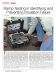 FEATURE • Megger Ramp Testing in Identifying and Preventing Insulation Failure By Jeff Jowett T HE TESTING OF ELECTRICAL INSULATION has seen the development of numerous specific procedures with the intent of examining and stressing insulation quality in different ways in order to call attention to different possible issues and problems. Insulation resistance is, of course, designed to be of a high value in order to keep circuitry isolated from other circuitry and from ground. Over time, just the wear and tear of normal usage will cause insulating material to degrade and reduce its insulating quality. Added to this process are localized and sometimes catastrophic events such as voltage spikes and surges, water ingress and the incursion of contaminants that will both speed and heighten the process of degradation. Consequently, insulation resistance is tested both as a maintenance procedure, to keep equipment within desired operational parameters, and as a troubleshooting function, in response to known or suspected problems. 6 Electrical Products & Solutions • June 2012 Simply taking a spot resistance reading with a megohmmeter is often all that is required of a given situation. But at other times, more exhaustive testing is in order to identify the problem. These are typically the bedeviling “intermittent faults”, where equipment successively runs and trips. An added goal of preventive electrical maintenance is to anticipate such contingencies before they develop and take measures to head them off. Accordingly, numerous procedures have been developed that make use of the insulation tester to give information well beyond the mere resistance number at a given time. By way of quick review, insulation resistance testing is accomplished by the application of a comparatively high voltage (typically on the order of system-rated to twice system-rated) across a body of insulating material and measuring the amount of current, called “leakage”, that gets through the material; in essence, going where it’s not supposed to go if Continued on page 8 FEATURE • Megger Continued from page 6 equipment were operating well. The amount of current is miniscule; micro- or even nano-amps. By the time the natural degradation process has permitted leakage current to reach levels as “high” as milli-amps, the insulation is breaking down and soon will no longer be doing its job. On a 120V circuit, the human body normally begins to fell a “tingle” at about half a milli-amp. One of the fundamental test procedures developed early in the use of megohmmeters (circa 1950) is the familiar and popular Step Voltage Test. Put simply, this is an examination of the response of the insulating material, in terms of resistance, to increasing voltage stress. Within broad parameters, “good” insulation should be able to stand up to increases in voltage. But if the material is deteriorated, each voltage increase will exploit additional leakage paths by pulling current through more and more cracks, burn tracks, water trees and the like. As voltage increases, current increases, and resistance drops accordingly. As the testers themselves have developed over the years, the implementation of this test has become simpler. As long as more than one test voltage is available, a simple Step Voltage Test can be performed manually. But modern testers have multi-voltage selection that reads directly, without having to adjust the reading to the voltage as was necessary with older models. Such units can easily perform the test manually, by turning the selector switch, noting the time and marking down measurements. Even more advanced megohmmeters do the whole thing automatically. Typically, only the voltage ceiling need be selected and the Step Voltage mode engaged, and such models will run the test automatically, displaying all relevant data at the conclusion. Accordingly, an industry-standard procedure has evolved where five successive voltages are applied for one minute each. If a 5 kV ceiling is selected, the test will run at 1, 2, 3, 4, and 5 kV for one minute each, a total of a five-minute test. As always with insulation resistance testing, comparison to previous results is the best evaluation, but for sake of perspective, a general rule is that more than a 25% change indicates an excess of contaminants (Fig. 1). One of the principle values of this test is that it can With insulation reveal problems that may have been overlooked in resistance testing, the results of other tests. An example is the single a general rule is point of localized damage that more than in otherwise good insulation. A voltage spike may a 25% change have caused a pinhole. With air (a good insulator) indicates an now filling the space preexcess of viously occupied by insulating material, a spark gap contaminants. exists that may go unnoticed by a simple resistance measurement. This can also be the source of an aggravating intermittent failure problem. But the Step Voltage Test may well arc the spark gap and expose the flaw. Similarly, aged insulation, by virtue of drying out, may yield a deceptively high value against a single resistance test. But such material often has cracks and similar flaws that make the equipment poised on the verge of breakdown. A Step Voltage Test will pull more current through more of these 8 Electrical Products & Solutions • June 2012 Figure 1 flaws with each increase, and readily reveal an impending failure. The increasing sophistication of modern megohmmeters has led to a refinement of the Step Voltage concept to a whole other level, the Ramp Test. Rather than increasing test voltage in discrete jumps (industry standard are 500 V and 1 kV increments), the ramp test applies voltage in a continuous increase at a constant rate, up to the selected maximum. The response of the insulating material to voltage can be assessed in a much subtler and more detailed manner, without the jarring effects of quantum leaps. Small defe