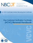 ® For VCVC Certificate Holders Renewing their Certificate Visa Credential Verification Certificate (VCVC) Renewal Handbook NBCOT® Certification Programs are accredited by: This publication is intended solely for the use of Visa Credential Verification Certificate (VCVC) Renewal applicants only. Please refer to the NBCOT website at www.nbcot.org to view the current VCVC Renewal Handbook. All general correspondence including requests for information concerning the VCVC renewal process, should be directed to: National Board for Certification in Occupational Therapy (NBCOT®), Inc. International Affairs Attn: VCVC 12 South Summit Avenue, Suite 100 Gaithersburg, MD 20877 Telephone: 301-990-7979 E-mail: international@nbcot.org Website: www.nbcot.org NBCOT does not discriminate against any individual because of race, ethnicity, gender, age, creed, disability, religion, marital status, sexual orientation, or national origin. NBCOT reserves the right to amend the procedures outlined in this handbook. All documentation submitted to NBCOT, for any reason, becomes the property of the organization. This includes but is not limited to: certification eligibility, initial certification, certification renewal, reinstatement, disciplinary action, international regulatory affairs or other NBCOT matters. For the most up-to-date information/announcements concerning NBCOT certification, please visit www.nbcot.org, or contact us via phone at: 301-990-7979. AOTCB/NBCOT 2016 Publications ID 25 revised 12/02/2015 All rights reserved. No part of this publication may be reproduced, stored in a retrieval system or transmitted in any form or by any means (electronic, mechanical, photocopying, recording or otherwise) without prior written permission of the copyright owners. ©2016 National Board for Certification in Occupational Therapy, Inc. ‘NBCOT®’ is a service and trademark of the National Board for Certification in Occupational Therapy, Inc. ‘OTR®’ is a service and trademark of the National Board for Certification in Occupational Therapy, Inc. ‘COTA®’ is a service and trademark of the National Board for Certification in Occupational Therapy, Inc. All marks are registered in the United States of America. TABLE OF CONTENTS Introduction ....................................................................................................................................2 U.S. Homeland Security Visa Requirements ........................................................................2 What is the VCVC renewal process? ..................................................................................2 Overview of the NBCOT Visa Credential Verification Renewal Certificate (VCVC Renewal Process)...................................................................... 3 Visa Credential Verification Certificate (VCVC) Renewal .............................................. 3 VCVC Renewal Requirements............................................................................................... 3 English-Language Proficiency Exam Requirements........................................................ 3 The VCVC Renewal Process ..................................................................................................... 4 After the VCVC Renewal Application: What to Expect .....................................................5 NBCOT Review Process .........................................................................................................5 Processing Time Required ....................................................................................................5 Correspondence Between NBCOT and VCVC Renewal Applicant ...........................5 Notification of the Decision ...................................................................................................6 Appealing the Decision ..........................................................................................................6 VCVC Closure, Revocation, Replacement and Renewal ..................................................6 Closure ........................................................................................................................................6 Revocation of VCVC ................................................................................................................6 Replacement VCVC ................................................................................................................. 7 VCVC Renewal ......................................................................................................................... 7 Appendix VCVC Verification of OT License, Registration, Certification or Other Form of Official Government Recognition Request (for submission to State Regulatory Board) ............................................ Appendix A 2016 VCVC Renewal Application ..................................................................... Appendix B INTRODUCTION The National Board for Certification in Occupational Therapy, Inc. (NBCOT®) is the national certification body for occupational therapy professionals in the United States. The mission of NBCOT is to serve the public interest by advancing client care and professional practice through evidence-based certification standards and the validation of knowledge essential for effective practice in occupational therapy. NBCOT’s vision is certified occupational therapy professionals providing effective evidence-based services across all areas of practice worldwide. Currently 50 states, Guam, Puerto Rico and the District of Columbia require NBCOT initial certification for occupational therapy state regulation, (e.g., licensing). NBCOT certification programs have received and maintained accreditation by the American National Standards Institute (ANSI) and the National Commission for Certifying Agencies (NCCA). NBCOT is a proud member of the Institute for Credentialing Excellence (ICE). This handbook has been developed to provid