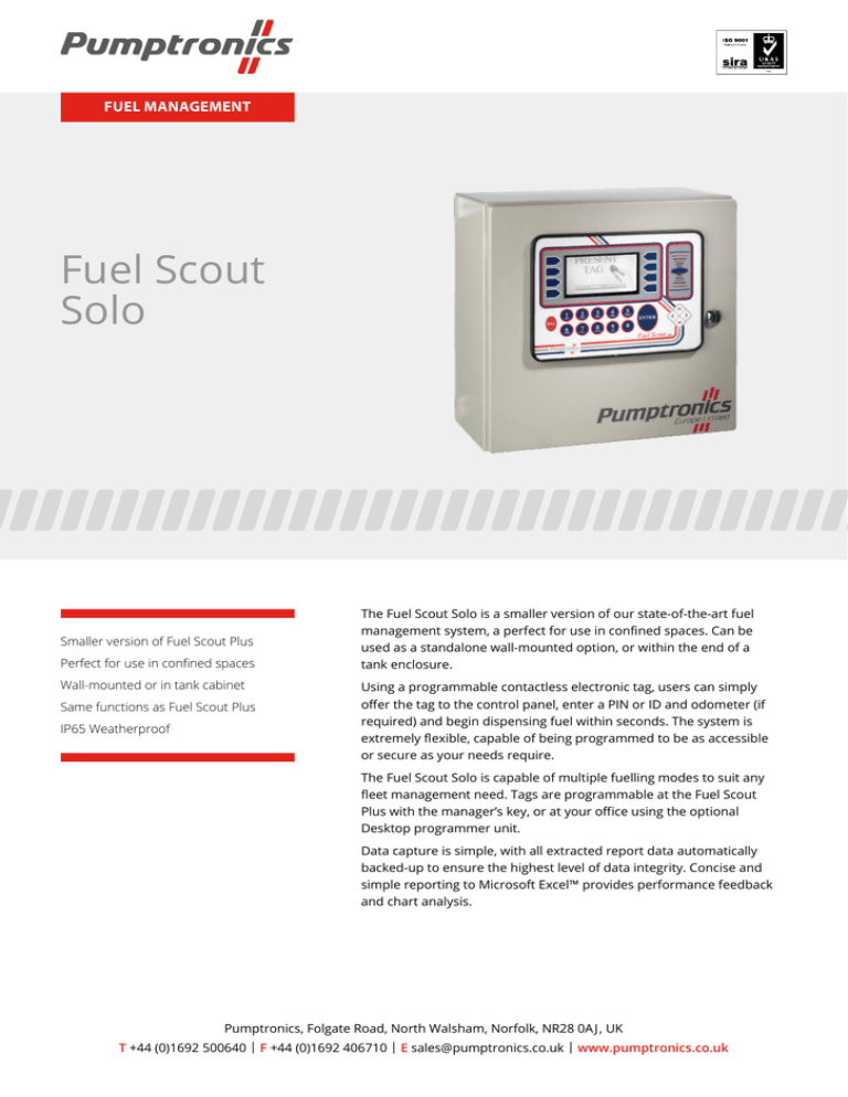FUEL MANAGEMENT Fuel Scout Solo Smaller version of Fuel Scout Plus Perfect for use in confined spaces Wall-mounted or in tank cabinet Same functions as Fuel Scout Plus IP65 Weatherproof The Fuel Scout Solo is a smaller version of our state-of-the-art fuel management system, a perfect for use in confined spaces. Can be used as a standalone wall-mounted option, or within the end of a tank enclosure. Using a programmable contactless electronic tag, users can simply offer the tag to the control panel, enter a PIN or ID and odometer (if required) and begin dispensing fuel within seconds. The system is extremely flexible, capable of being programmed to be as accessible or secure as your needs require. The Fuel Scout Solo is capable of multiple fuelling modes to suit any fleet management need. Tags are programmable at the Fuel Scout Plus with the manager’s key, or at your office using the optional Desktop programmer unit. Data capture is simple, with all extracted report data automatically backed-up to ensure the highest level of data integrity. Concise and simple reporting to Microsoft Excel™ provides performance feedback and chart analysis. Pumptronics, Folgate Road, North Walsham, Norfolk, NR28 0A J , UK T +44 (0)1692 500640 | F +44 (0)1692 406710 | E sales@pumptronics.co.uk | www.pumptronics.co.uk FUEL MANAGEMENT Fuel Scout Solo Specification Options Large graphic LCD display providing clear operating instructions PC cable link Robust contactless RF TAG fuelling operation GSM modem kit Alphanumeric entry via front panel to enable flexible data capture Programmed data tags Modem kit via landline Stainless steel cabinet Multiple data transfer and retrieval options: USB, LAN, RS485, modem & GSM Data key panel option Microsoft Windows compatible Desk Top Data Tag or Data Key Programmer Wall mounted cabinet Software for Tank Gauging interface Uniquely coded door access key – access to pump override PC software (windows 98 to windows 8) Rugged membrane front panel with scratchproof display window Weather resistant to IP65 standard Pulse input interfaces 100PPL or 10PPL Pulser: Closed contact, less than 600 ohms Programmed data key Pump mount plate Connection to ATG (tank gauges) Dimensions 400mm (H) x 400mm (W) x 200mm (D) Active pulser: Open collector output Active pulser voltage: 5v @ 1amp 230v AC @ 50Hz – less than 30 watts (110v available on request) Voltage tolerance of +/- 30 volts 6amp fuse/breaker (standalone) Maximum number of tags: 65,000 Max number of pumps: 4 per Fuel Scout Transaction capacity: 200,000 Non-volatile memory: 32MB USB download as standard Pumptronics, Folgate Road, North Walsham, Norfolk, NR28 0A J , UK T +44 (0)1692 500640 | F +44 (0)1692 406710 | E sales@pumptronics.co.uk | www.pumptronics.co.uk FUEL MANAGEMENT Fuel Scout Solo Product codes Part no Description PFSP-SOLO-USB Fuel Scout Solo USB in Wall Cabinet PFSP-SOLO-MO Fuel Scout Solo with Modem Kit via landline PFSP-SOLO-GSM Fuel Scout Solo with GSM Modem Kit in Wall Cabinet PFSP-SOLO-LAN Fuel Scout Solo with LAN Modem Kit in Wall Cabinet PFSP-SOLO-CABLE Fuel Scout Solo Cable Link to PC USB in Wall Cabinet Accessories ZFSTAG Programmed Data Tags – each ZFSKEYMKB Data Key panel option ZFSDATAKEY Programmed Data Key – each ZFSTAGPROGR FS Desk Top Tag Programmer Unit including Software ZFSKEYPROGR FS Desk Top Key Programmer Unit including Software ZFSSOFTWARE 6 Software for Tank Gauging interface Pumptronics, Folgate Road, North Walsham, Norfolk, NR28 0A J , UK T +44 (0)1692 500640 | F +44 (0)1692 406710 | E sales@pumptronics.co.uk | www.pumptronics.co.uk