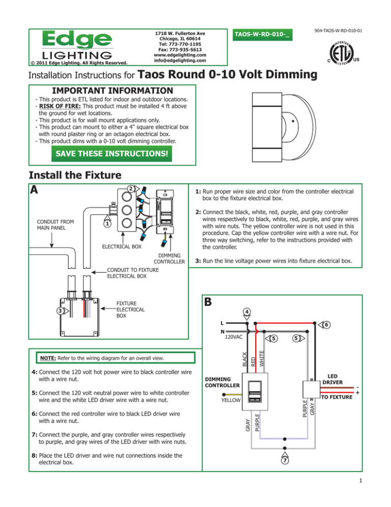 1718 W. Fullerton Ave Chicago, IL 60614 Tel: 773-770-1195 Fax: 773-935-5613 www.edgelighting.com info@edgelighting.com © 2011 Edge Lighting. All Rights Reserved. Installation Instructions for 904-TAOS-W-RD-010-01 TAOS-W-RD-010-_ Taos Round 0-10 Volt Dimming IMPORTANT INFORMATION - This product is ETL listed for indoor and outdoor locations. - RISK OF FIRE: This product must be installed 4 ft above the ground for wet locations. - This product is for wall mount applications only. - This product can mount to either a 4" square electrical box with round plaster ring or an octagon electrical box. - This product dims with a 0-10 volt dimming controller. SAVE THESE INSTRUCTIONS! Install the Fixture A 2 CONDUIT FROM MAIN PANEL 1: Run proper wire size and color from the controller electrical box to the fixture electrical box. 2: Connect the black, white, red, purple, and gray controller wires respectively to black, white, red, purple, and gray wires with wire nuts. The yellow controller wire is not used in this procedure. Cap the yellow controller wire with a wire nut. For three way switching, refer to the instructions provided with the controller. 1 ELECTRICAL BOX DIMMING CONTROLLER 3: Run the line voltage power wires into fixture electrical box. CONDUIT TO FIXTURE ELECTRICAL BOX 3 FIXTURE ELECTRICAL BOX B 4 L 6 N 120VAC WHITE PURPLE GRAY 6: Connect the red controller wire to black LED driver wire with a wire nut. YELLOW PURPLE 5: Connect the 120 volt neutral power wire to white controller wire and the white LED driver wire with a wire nut. LED DRIVER DIMMING CONTROLLER GRAY 4: Connect the 120 volt hot power wire to black controller wire with a wire nut. RED BLACK NOTE: Refer to the wiring diagram for an overall view. 5 5 TO FIXTURE + 7: Connect the purple, and gray controller wires respectively to purple, and gray wires of the LED driver with wire nuts. 8: Place the LED driver and wire nut connections inside the electrical box. 7 1 C ELECTRICAL BOX HOLE 10 9 9: Feed the brown and red LED driver wires through the crossbar assembly center hole. 10: Mount the crossbar assembly to the electrical box holes with the provided #8-32 screws. 11 #8-32 SCREW 10 CROSSBAR ASSEMBLY CENTER HOLE 11: Make sure the crossbar assembly is grounded in accordance with local electrical codes. D FIXTURE BODY 2MM ALLEN WRENCH 12 12 12: Loosen the two M4 set screws on the fixture body (Do Not Remove) with the provided 2mm Allen wrench and carefully pull the canopy off of the fixture body. E CANOPY M4 SET SCREW 13: Feed the LED brown and red driver wires through the canopy center hole, washer, and nut provided. LED DRIVER WIRE 14: Slide the canopy back onto the crossbar assembly nipple (make sure the gasket is in place) and secure the canopy to the crossbar assembly by tightening the nut. 13 CANOPY CENTER HOLE NUT 14 WASHER 2 F 15: Connect the red fixture wire to the red LED driver wire (+) with a wire nut. 15 16 16: Connect the black fixture wire to the brown LED driver wire (-) with a wire nut. G 18 FIXTURE BODY 17 17: Place all wires and wire nut connections inside the fixture body. Slide the fixture body completely onto the canopy and tighten the two M4 set screws with the 2mm Allen wrench. 18: For installation in wet location, caulk around the fixture canopy with waterproof construction sealant. NOTE: The fixture contains two 3 watt integrated LED lamps. These lamps are rated for 40,000 hours. 17 2MM ALLEN WRENCH CANOPY M4 SET SCREW 3