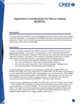 Application Considerations for SiC MOSFETs Application Considerations for Silicon Carbide MOSFETs Application Considerations for Silicon Carbide MOSFETs Author: Bob Callanan, Cree, Inc. Introduction Introduction: The silicon carbide (SiC) MOSFET has unique capabilities that make it a superior switch when compared to its silicon counterparts. The advantages of SiC MOSFETs have been documented extensively in the literature [1]. However, there are some unique operating characteristics that need to be understood so that the device can be used to its full potential. Discussion Discussion: VCPWR-AN08, RE SFETs rations for SiC MO ide ns Co n tio ca pli Ap The key to successfully applying the SiC MOSFET requires an understanding of the device’s unique operating characteristics. In this section, the characteristics of Cree’s 1200V 80mΩ SiC MOSFET (CMF20120D) will be discussed. Comparisons will be made with other similar silicon devices along with application implications. The intention of this comparison is to illustrate the differences in operating characteristics, not to pick the best device. The comparison silicon devices are as follows: • 900V, 0.12 Si super junction MOSFET (SJMOSFET) Infineon IPW90R120C3 [2] • 1.2 kV, 20 A trench/field stop (TFS) Si IGBT Fairchild FGA20N120FGD [3] • 1.2 kV, 20 A non-punch though (NPT) Si IGBT International Rectifier IRGP20B120U [4] • 1.2 kV, 0.30 Si MOSFET (Si MOS8) Microsemi APT34M120J [5] The devices selected for comparison are representative of commercially available Si IGBTs and MOSFETs with voltage and current ratings similar to the CMF20120D. The TFS IGBT is representative of a low on-voltage device and the NPT IGBT is representative of a low turn-off loss device. The Si MOS8 is representative of a commercially available 1.2kV Si MOSFET. Lastly, although not a 1.2kV device, the 900V SJMOSFET data was included for comparison purposes. All comparisons were made with measured data except in the case of the SJMOSFET. Data sheet values were used. Consider the output characteristics of a typical Cree CMF20120D and the Si TFS IGBT shown in Figure 1. For the CMF20120D, the transition from triode (ohmic) to saturation (constant current) regions is not as clearly defined as it is for the Si TFS IGBT. This is a result of the modest transconductance of the device. The modest amount of transconductance causes the transition from triode to saturation to be spread over a wider range of drain current. The result is that the CMF20120D behaves more like a voltage controlled resistance than a voltage controlled current source. Subject to change without notice. www.cree.com 1 Application Considerations for SiC MOSFETs Si NPT IGBT SiC MOSFET Figure 1:: O Output characteristics comparison (TJ = 150 °C) The modest transconductance ance and short short-channel channel effects are important to consider when applying the device. The CMF20120D needs to be driven with a higher gate voltage swing than what is customary with SJMOSFETS or IGBTs. Presently, a +20V and -2V to -5V negative bias gate drive is recommended for the CMF20120D. Care needs to be taken not to exceed -5V 5V in the negative direction. direction The rate of rise of gate voltage will have a greater effect on the rate of rise of the drain current due to the lower transconductance. Therefore, the gate drive needs to supply a fast rise and fall time gate pulse to maximize switching speed. The CMF20120D also has a threshold voltage similar to the Si SJMOSFET (2V nominal). Like the Si SJMOSFET, consideration considerations s need to be made for the lower threshold voltage, especially at high temperatures. The rather large triode region can have an impact on certain types of fault detection schemes, chiefly the active de-saturation saturation circuits. Some of these designs assume tthat hat the switching device enters a fairly high impedance constant current and/or tran transconductance saturation region during over-current current faults. For the CMF20120D , the output impedance is lower and the device does not go into a clean constant current region during this type of over-current current fault fault, especially under moderate over-currents.. Therefore, the drain to source voltage will not increase as much much.. These characteristics of the SiC MOSFET need to be carefully considered in fault protection schemes. The forward conduction characteristics of the CMF20120D along with the Si SJMOSFET, TFS, and NPT IGBTs are presented in Figure 2. T The Si SJMOSFET’s relatively high positive temperature coefficient of RDS(on) has a considerable effect on its conduction losses. At 25 °C, the Si SJMOSFET and CMF20120D were somewhat similar. At 150 °C, the RDS(on) of the CMF20120D increases by only about 20% from 25 °C to 150 °C, whereas both the Si SJMOSFET and Si MOS8 devices increase ase by 250%. This has a significant effect on system thermal design. The obvious advantage is that a smaller device can be used at higher operating temperatures. 2 CPWR-AN08, REV Application Considerations for SiC MOSFETs - This document is provided for informational purposes only and is not a warranty or a specification. For product specifications, please see the data sheets available at www.cree.com/power. For warranty information, please contact Cree Sales at PowerSales@cree.com. 2 Application Considerations for SiC MOSFETs TJ = 25 °C TJ = 150 °C Figure 2:: Forward conduction characteristics comparison (VGS = 20V, VGE = 15V) One of the key advantages to SiC is the high temperature capability afforded by the wide bandgap. This is clearly reflected in the leakage current comparison at elevated temperature shown in Figure 3. The CMF20120D has about 20x lower leakage current at 150 °C. At 200 °C, the Si comparison parts leakage current increases dramatically, to the point where the device fails due to excess power dissipation. The CMF20120D leakage current is still acceptable at this temperature and is over 100x lower than