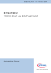 Datasheet, Rev. 1.1, February 2008 BTS3160D 10mOhm Smart Low Side Power Switch Automotive Power Smart Low Side Power Switch HITFET - BTS3160D Table of Contents Table of Contents Table of Contents . . . . . . . . . . . . . . . . . . . . . . . . . . . . . . . . . . . . . . . . . . . . . . . . . . . . . . . . . . . . . . . . 2 1 Overview . . . . . . . . . . . . . . . . . . . . . . . . . . . . . . . . . . . . . . . . . . . . . . . . . . . . . . . . . . . . . . . . . . . . . . . 3 2 2.1 Block Diagram . . . . . . . . . . . . . . . . . . . . . . . . . . . . . . . . . . . . . . . . . . . . . . . . . . . . . . . . . . . . . . . . . . . 5 Voltage and current naming definition . . . . . . . . . . . . . . . . . . . . . . . . . . . . . . . . . . . . . . . . . . . . . . . . . 6 3 3.1 3.2 Pin Configuration . . . . . . . . . . . . . . . . . . . . . . . . . . . . . . . . . . . . . . . . . . . . . . . . . . . . . . . . . . . . . . . . 7 Pin Assignment BTS3160D . . . . . . . . . . . . . . . . . . . . . . . . . . . . . . . . . . . . . . . . . . . . . . . . . . . . . . . . . 7 Pin Definitions and Functions . . . . . . . . . . . . . . . . . . . . . . . . . . . . . . . . . . . . . . . . . . . . . . . . . . . . . . . . 7 4 4.1 4.2 4.3 General Product Characteristics . . . . . . . . . . . . . . . . . . . . . . . . . . . . . . . . . . . . . . . . . . . . . . . . . . . . Absolute Maximum Ratings . . . . . . . . . . . . . . . . . . . . . . . . . . . . . . . . . . . . . . . . . . . . . . . . . . . . . . . . . Functional Range . . . . . . . . . . . . . . . . . . . . . . . . . . . . . . . . . . . . . . . . . . . . . . . . . . . . . . . . . . . . . . . . . Thermal Resistance . . . . . . . . . . . . . . . . . . . . . . . . . . . . . . . . . . . . . . . . . . . . . . . . . . . . . . . . . . . . . . . 5 5.1 5.1.1 5.2 5.2.1 5.3 Supply and Input Stage . . . . . . . . . . . . . . . . . . . . . . . . . . . . . . . . . . . . . . . . . . . . . . . . . . . . . . . . . . Supply Circuit . . . . . . . . . . . . . . . . . . . . . . . . . . . . . . . . . . . . . . . . . . . . . . . . . . . . . . . . . . . . . . . . . . . Under Voltage Lock Out / Power On Reset . . . . . . . . . . . . . . . . . . . . . . . . . . . . . . . . . . . . . . . . . . . Input Circuit . . . . . . . . . . . . . . . . . . . . . . . . . . . . . . . . . . . . . . . . . . . . . . . . . . . . . . . . . . . . . . . . . . . . . Readout of Fault Information . . . . . . . . . . . . . . . . . . . . . . . . . . . . . . . . . . . . . . . . . . . . . . . . . . . . . . Electrical Characteristics Supply and Input Stages . . . . . . . . . . . . . . . . . . . . . . . . . . . . . . . . . . . . . . 11 11 11 12 12 13 6 6.1 6.2 6.3 6.4 Power Stage . . . . . . . . . . . . . . . . . . . . . . . . . . . . . . . . . . . . . . . . . . . . . . . . . . . . . . . . . . . . . . . . . . . Output On-state Resistance . . . . . . . . . . . . . . . . . . . . . . . . . . . . . . . . . . . . . . . . . . . . . . . . . . . . . . . . Output Timing and Slopes . . . . . . . . . . . . . . . . . . . . . . . . . . . . . . . . . . . . . . . . . . . . . . . . . . . . . . . . . Inductive Output Clamp . . . . . . . . . . . . . . . . . . . . . . . . . . . . . . . . . . . . . . . . . . . . . . . . . . . . . . . . . . . Electrical Characteristics Power Stage . . . . . . . . . . . . . . . . . . . . . . . . . . . . . . . . . . . . . . . . . . . . . . . . 14 14 17 18 20 7 7.1 7.2 7.3 7.4 Protection Functions . . . . . . . . . . . . . . . . . . . . . . . . . . . . . . . . . . . . . . . . . . . . . . . . . . . . . . . . . . . . Thermal Protection . . . . . . . . . . . . . . . . . . . . . . . . . . . . . . . . . . . . . . . . . . . . . . . . . . . . . . . . . . . . . . . Over Voltage Protection . . . . . . . . . . . . . . . . . . . . . . . . . . . . . . . . . . . . . . . . . . . . . . . . . . . . . . . . . . . Short Circuit Protection . . . . . . . . . . . . . . . . . . . . . . . . . . . . . . . . . . . . . . . . . . . . . . . . . . . . . . . . . . . . Electrical Characteristics Protection . . . . . . . . . . . . . . . . . . . . . . . . . . . . . . . . . . . . . . . . . . . . . . . . . . 22 22 22 22 25 8 8.1 8.2 Application Information . . . . . . . . . . . . . . . . . . . . . . . . . . . . . . . . . . . . . . . . . . . . . . . . . . . . . . . . . . 26 Dimensioning of serial Resistor at IN pin . . . . . . . . . . . . . . . . . . . . . . . . . . . . . . . . . . . . . . . . . . . . . . 26 Further Application Information . . . . . . . . . . . . . . . . . . . . . . . . . . . . . . . . . . . . . . . . . . . . . . . . . . . . . . 27 9 Package Outlines . . . . . . . . . . . . . . . . . . . . . . . . . . . . . . . . . . . . . . . . . . . . . . . . . . . . . . . . . . . . . . . 28 10 Revision History . . . . . . . . . . . . . . . . . . . . . . . . . . . . . . . . . . . . . . . . . . . . . . . . . . . . . . . . . . . . . . . . 29 Datasheet 2 8 8 9 9 Rev. 1.1, 2008-02-28 BTS3160D Smart Low Side Power Switch HITFET - BTS3160D 1 Overview The BTS3160D is a one channel low-side power switch in PG-TO-252-5-13 package providing embedded protective functions. The power transistor is realized by a N-channel vertical power MOSFET. The device is controlled by a chip in Smart Power Technology. PG-TO-252-5-13 Features • • • • • • • Logic level input compatible to 3.3 V or 5V micro controllers Supply by Vbb line, down to 6 V Very low over all leakage current Providing digital fault information Electrostatic discharge protection (ESD) Green Product (RoHS compliant) AEC Qualified Table 1 Basic Electrical Data Drain voltage VD 40 V Supply voltage VS 6.0 … 45 V On-State resistance at 25°C RDS(ON,max) 10 mΩ Nominal load current IDnom 7.8 A Maximum inrush current IDSC 70 A Leakage current MOSFET at Vbb = 13.5 V, TJ = 85 °C IDSS 2 µA Supply current in off mode at Vbb = 13.5 V, TJ = 85 °C ISSS 4 µA Clamping Energy EAS 0.3 J Type Package BTS3160D PG-TO-252-5-13 Datasheet 3 Rev. 1.1, 2008-02-28 Smart Low Side Power Switch HITFET 