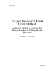 ECN-C–95-074 Fatigue Equivalent Load Cycle Method A General Method to Compare the Fatigue Loading of Different Load Spectrums H.B. Hendriks B.H. Bulder October 1995 Fatigue Equivalent Load Cycle Method Abstract A method is presented with which the fatigue loading of two or more load spectrums may be compared on a quantitative basis taking into account both the range and the mean of the load cycles. Keywords fatigue, wind, turbine , wind energy ii ECN-C–95-074 CONTENTS 1 Introduction 1 2 Fatigue equivalent load range 3 3 Fatigue equivalent load cycle 5 4 Example 7 4.1 Measured time series . . . . . . . . . . . . . . . . . . . . . . . . . . . . . . . 7 4.2 Simulated time series . . . . . . . . . . . . . . . . . . . . . . . . . . . . . . . 9 5 Conclusions 11 References 13 ECN-C–95-074 iii iv ECN-C–95-074 1 INTRODUCTION Fatigue is the main design driver for the calculation of the structural integrity of wind turbine components. In the JOULE II project "Load and Power Measurement Programme on Wind Turbines Operating in Complex Mountaineous Regions" and in several other research projects there is a need to compare different fatigue load spectrums on a quantitative basis. A common way to compare two or more fatigue load spectrums is the use of an equivalent load range, see [2]. The calculation of the equivalent load range is easy to perform. The fatigue behaviour of the material is formulated with a straight S-N curve on log-log scale. Different material behaviour may be characterised with different slopes of the S-N curve. A disadvantage of the above method is the neglection of the mean level of a load cycle. In case of glass-polyester, glass-epoxy, cast steel, carbon epoxy, or wood laminates the mean level of the cycle effects the fatigue life. This could be avoided by calculating the fatigue stress reserve factor. This factor is defined as the factor by which the prevailing fatigue stress has to be multiplied in order that the calculated fatigue lifetime equals the design lifetime ([1]). The disadvantages of the fatigue stress reserve method are the need of detailed cross sectional data, the need of the specific fatigue formulae of the materials, the iterative calculation of the factor, and the fact that the results are not easy to generalise for other materials than considered. In this document an extension to the equivalent load range method is defined. With the extension the mean level of the load cycles is taken into account. The method is easy to apply and fully consistent with the equivalent load range method. In chapter 2 the formulae for calculating the equivalent load range are given. In chapter 3 the formulae for the equivalent load cycle method are given. An example is presented in chapter 4. Some conclusions are given in chapter 5. ECN-C–95-074 1 2 ECN-C–95-074 2 FATIGUE EQUIVALENT LOAD RANGE The allowable number of cycles N for a straight S-N line on log-log scale is given by: = k · Sr−m N (1) (2) In which Sr is the range of a load cycle and -1/m is the slope of the S-N line on log-log scale. The damage caused by a load spectrum of n cycles with ranges Sr,i : D = n X i=1 1 −m k · Sr,i (3) The damage caused by Neq (constant amplitude) cycles with range Sr,eq has to equal the damage of the above load spectrum: Neq −m k · Sr,eq = Sr,eq = n X i=1 1 −m k · Sr,i n m X Sr,i i=1 Neq (4) !1/m (5) From equation 2.5 it can be shown that the ratio of two equivalent load ranges of two spectra is independent of the chosen Neq . ECN-C–95-074 3 4 ECN-C–95-074 3 FATIGUE EQUIVALENT LOAD CYCLE To take into account both the mean level and the range of a cycle different S-N curves have to min be used for different R values (R = SSmax ). The fatigue behaviour of the several materials used in wind turbine design is very complex. It is proposed to use a simplified fatigue formulation. A symmetric Goodman diagram with straight constant life lines: N = k·( Sr )−m Su − |Sm | (6) In which Su is the ultimate load. The damage caused by a load spectrum of n (constant amplitude) cycles with ranges Sr,i and means Sm,i : D = n X i=1 = 1 k· n X 1 i=1 k · (7) −m Sr,i Su −|Sm,i | Su − |Sm,i | Sr,i !−m (8) The damage caused by Neq cycles with range Sr,eq and mean Sm,eq has to equal the damage of the above load spectrum: Neq · k Su − |Sm,eq | Sr,eq !−m = n X 1 i=1 k · Su − |Sm,i | Sr,i !−m (9) or Sr,eq n Sr,i · X = i=1 Su −|Sm,eq | m 1/m Su −|Sm,i | Neq (10) From equation 3.5 it can be shown that the ratio of two equivalent load ranges of two spectra is independent of the chosen Neq and independent of the chosen Sm,eq . So similar to the choice of Neq an arbitrary choice for Sm,eq may be given. It is proposed to evaluate the equivalent load cycle range with Sm,eq = 0. Note that equation 3.5 equals equation 2.5 for the limit Su → ∞ or for Sm,eq = Sm,i = 0, ∀i=1,n Similar to evaluating the equivalent load range with different slopes m of the S-N curves the equivalent load cycle may be evaluated with different slopes m and different ultimate strength values Su . Both the parameters m and Su represent the material behaviour. The parameters Su is however not dimensionless but has the dimension of the load under consideration. It is preferable to relate the property to the level of the load spectrum and to use a dimensionless parameter. The ratio of the maximum occurring load Smax over Su can be used to determine some valid choices for Su . In every design this ratio will be smaller than 1 and larger than 0 (note that a ratio 0 stands for Su → ∞). It is proposed to evaluate 4 different Su over Smax rates: 0.2, 0.4, 0.6, and 0.8. In case for reason of comparison more than one spectrum is analysed, all spectrums should be analysed with the same value for Su . ECN-C–95-074 5 6 ECN-C–95-074 4 4.1 EXAMPLE Measured time series With the proposed equivalent load cycle method the influence of different material behaviour with respect to the mean level may be ev