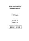 Trade of Electrician Standards Based Apprenticeship Bell Circuit Phase 2 Module No. 2.2 Unit Nos. 2.2.4 COURSE NOTES Created by Chris Ludlow - Dundalk TC Revision 1 April 2000 By Chris Ludlow - Dundalk TC Eugene Trindles - Cork TC Revision 2 Nov 2002 By Chris Ludlow - Dundalk TC Charlie Walsh - Athlone TC Revision 3 May 2006 By Chris Ludlow - Dundalk TC Revision 4. Feb 2008 By Chris Ludlow - Dundalk TC Revision 5 July 2009 By Chris Ludlow - Dundalk TC Revision 6 October 2009 By Chris Ludlow - Dundalk TC Revision 7, November 2013 SOLAS Compiled by Liam Carroll – Certification & Standards Published by 27-33 Upper Baggot Street Dublin 4 Ireland © SOLAS - 2013 All rights reserved. No part of this publication may be reproduced, stored in a retrieval system or transmitted in any form or by any means, electronic, mechanical, photocopying, recording or otherwise, without the prior permission of the copyright owner. SOLAS Electrical Course Notes - Unit 2.2.4 Table of Contents INTRODUCTION ......................................................................................................................................... 4 GRAPHICAL SYMBOLS ............................................................................................................................ 5 THE BELL CIRCUIT ................................................................................................................................... 7 THE TRANSFORMER................................................................................................................................. 7 BELLS, BUZZERS AND CHIMES ............................................................................................................. 9 THE BELL PUSH........................................................................................................................................ 12 BELL INSTALLATION TECHNIQUES.................................................................................................. 14 UNIT RELATED ETCI RULES ................................................................................................................ 14 3 Revision 7, November 2013 SOLAS Electrical Course Notes - Unit 2.2.4 Introduction Welcome to this section of your course, which is designed to enable you, the learner, understand the operation of basic electric bells, buzzers, chimes, bell pushes and bell transformers and how they are interconnected. Objectives By the end of this unit you will be able to: Recognise and use important electrical symbols Understand the information supplied with a bell transformer Read circuit diagrams showing simple bell circuits Understand the operation of a basic trembler bell Understand the operation of a basic buzzer Understand the operation of a basic chime unit Install a transformer powered bell circuit Reasons Understanding this information will allow you install correctly a transformer powered bell / buzzer circuit. 4 Revision 7, November 2013 SOLAS Electrical Course Notes - Unit 2.2.4 Graphical Symbols Architectural Symbols Bell Buzzer Pushbutton Illuminated Pushbutton Transformer 5 Revision 7, November 2013 SOLAS Electrical Course Notes - Unit 2.2.4 Circuit Symbols Bell Buzzer Normally Open Contact ( N/O ) Normally Closed Contact ( N/C ) Actuator Pushbutton Illuminated Pushbutton Transformer 6 Revision 7, November 2013 SOLAS Electrical Course Notes - Unit 2.2.4 The Bell Circuit Bell circuits in domestic premises are operated on extra low voltage. The advantages of using extra low voltage are as follows: Much safer than mains voltage ( low voltage ). Accessories are much cheaper. Lower grade cable may be used. Battery supply can be used to power bell circuit. The Transformer A transformer is normally used to provide the extra low voltage supply. The construction and operation of transformers is covered in detail in Unit 2.1.10 of Phase 2. and at this stage we will take a very simplistic view. A transformer is a device which operates on AC only. It may provide an output voltage which can be less than, equal to, or greater than the supply voltage. A transformer which provides a voltage less than its supply voltage is referred to as a step down transformer. This is the type of transformer used for domestic bell circuits. The transformer consists of two separate windings. These windings are electrically isolated from each other and therefore provide a safe output voltage which is totally isolated from the mains supply. The following is a list of the standard voltage outputs available from the bell transformers in common use: 3 V, 4 V, 5 V, 8 V and 12 V. The transformer chosen should match the load requirements of the bell. The input winding is called the primary winding and the output winding is called the secondary winding. Figure 1 represents a transformer which is supplied on the primary side at 230 Volts AC while the secondary is arranged to provide 8 Volts AC. Figure 1 7 Revision 7, November 2013 SOLAS Electrical Course Notes - Unit 2.2.4 The primary winding of a bell transformer consists of a large number of turns of wire, having a CSA in the region of 0.12 mm2. Consequently this winding will have a relatively high resistance, typically 300 - 900 Ohms. The secondary winding consists of a small number of turns of wire, having a CSA in the region of 0.43 mm2. Consequently it will have a much lower resistance, typically 0.1 - 3 Ohms. It is extremely important that the mains supply is connected to the primary winding and not to the secondary winding. Figure 2 represents a transformer which is arranged to provide three output voltages of 4 V, 8 V and 12 V. Figure 2 The secondary winding is merely tapped at a point which will provide either 4 V or 8 V from the total output voltage of 12 V. Activity: Using an ohmmeter:Apprentices to measure and record the resistance of both primary and secondary windings. 8 Revision 7, November 2013 SOLAS Electrical Course Notes - Unit 2.2.4 Bells, Buzzers and Chimes 