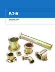Flexmaster Joints Conveying Products Features Flexmaster Joints in Standard and Self-restrained Configurations Standard Features Self-Restrained Features 1.Gasket provides compression seal when tightened against tube or pipe. 1.Gasket provides compression seal when tightened against tube or pipe. 2.Hinged coupling provides for quick, easy assembly. 2.Hinged coupling provides for quick, easy assembly. 3.Bulged sleeve allows for ±4º angular misalignment. 3.Bulged sleeve allows for ±4º angular misalignment. All gasket materials listed on page 4 are available in the standard style, increasing the number of suitable applications. 4.Notched channel ring which grips pipe firmly to restrict movement along pipe or tubing. Flexmaster joints are available in both standard and selfrestrained styles. The self-restrained style has a stainless steel gripping ring inside each gasket. This feature allows the joint to maintain a firm grip on the pipe or tube, preventing movement along the pipe or tube. The bulged, straight-through Flexmaster joints accommodate angular misalignment up to ±4º per end. Tees, elbows, and crosses accommodate angular misalignment up to ±2o per end. See pages 10 thru 17 for the angular misalignment allowed on each specific part. Flexmaster joints are designed for up to 300 psi (2.07 MPa) service, depending on application and size. Refer to pressure ratings on page 4. II Gasket materials available include the C (Buna-N) and D (EPDM) compounds. Flexmaster joints absorb vibration and are ideal for making quick connections and disconnections when repairing or disassembling a system. They can be furnished with several types of gasket compounds and sleeve materials, including stainless steel for marine and corrosive applications. Flexmaster joints are currently in use in thousands of applications throughout the world. For typical Flexmaster joint applications see photos on page 2. EATON Hydraulics Flexmaster Joints Catalog E-MEFL-MR001-E2 January 2008 Features Save Time Make Pipe And Tube Connection Easier Used on Plain End Tube or Pipe No threading, flanging, welding, grooving or other special end preparation of tube or pipe is required. Use pipe after it is cut to appropriate lengths. The Flexmaster joint will accommodate large tolerances in the length of the gap. See Table 1, page 9 for insertion depth tolerances. Absorbs Vibration Pipe vibration and noise can be drastically reduced with Flexmaster joints. The resilient, thick rubber of the Flexmaster joint gasket absorbs vibration and noise. Use of the self-restrained style restricts movement along vibrating pipes and tubes. Even Misaligned Piping is No Problem The Flexmaster joint design eliminates flanged bolt holes and pipe threads that require careful alignment. The Flexmaster bulged joint permits up to a total of ±4º angular installation misalignment at each end while maintaining a leakproof seal. Easy to Install Installation time can be slashed by using Flexmaster joints. Basic assembly tools are all that’s needed. After extensive use, the gaskets can be replaced easily and quickly. See page 8 for complete assembly instructions. EATON Hydraulics Flexmaster Joints Catalog E-MEFL-MR001-E2 January 2008 Applications Flexmaster joint elbows on a large hydraulic power system, which connect pipe from pumps to hydraulic fluid reservoirs. Flexmaster joints join water lines on a huge diesel engine. A number of Flexmaster joints are installed on this compressor to connect water and oil lines, providing quick, easy connection and protection against vibration. A large dry-cleaning plant uses Flexmaster joints to connect piping at elbow junctures. Flexmaster joints are used to join piping on air compressors. EATON Hydraulics Flexmaster Joints Catalog E-MEFL-MR001-E2 January 2008 Specials Made to Order Special Configurations and Seal Materials Can Be Ordered Flexmaster joints can be produced with various configurations and terminal end designs. A few of the special Flexmaster joint configurations which have been manufactured by Eaton are displayed above. Please consult Eaton when ordering specials. Manufacturing Engineering Flexmaster joints are manufactured by highly experienced and trained individuals who are dedicated solely to the production and packaging of Flexmaster joints. The Flexmaster joints manufacturing team is backed by the strong technical support from Eaton’s engineering staff. EATON Hydraulics Flexmaster Joints Catalog E-MEFL-MR001-E2 January 2008 Technical Data Gasket Temperature Ratings†† Pressure Ratings † C BUNA-N water (Standard) oils V Fluorocarbon S Silicone D water and EPDM water/glycol mixture N BUNA-N water and (High temp.) steam oils Size Range Pipe Tube Standard Gasket Self-Restrained Gasket 3/8 300 psi (2.07 MPa) 200 psi (1.38 MPa) 150 psi (1.03 MPa) 300 psi (2.07 MPa) 200 psi (1.38 MPa) 150 psi (1.03 MPa) -25º F. to +180º F. (-32º C. to +82º C.) -25º F. to +212º F. (-32º C. to +100º C.) -25º F. to +450º F. (-32º C. to +232º C.) -65º F. to +350º F. (-54º C. to +177º C.) +20º F. to +275º F. (+29º C. to +137º C.) -25º F. to +225º F. (-32º C. to +107º C.) -25º F. to +250º F. (-32º C. to +121º C.) †† Maximum temperature ratings are meant as a guide only. For extreme temperature conditions, consult factory. - 3/4 1-2 2 1/2 - 6 1/2 - 1 3/8 12.7 - 35.1 1 1/2 - 2 1/2 38.1 - 63.5 3 - 6 76.2 - 152.4 † Warning: The Flexmaster joint is designed to seal pipe and tube connections. The Flexmaster joint is not intended to hold piping systems together. Normal hangers, guides, anchors and other external piping restraints must be used to restrain the piping or tubing system from movement. Pipe and tube materials which can be connected by Flexmaster joints* Pipe or Tube Material Standard Gasket Self-Restrained Gasket** Carbon Steel Stainless Steel Aluminum P.V.C. (Plastic) Copper X X X X X X X Not Recommended Not Recommended Not Recommended * All piping and tubing connected by 