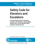 ASME A17.1-2013/CSA B44-13 (Revision of ASME A17.1-2010/CSA B44-10) Safety Code for Elevators and Escalators Includes Requirements for Elevators, Escalators, Dumbwaiters, Moving Walks, Material Lifts, and Dumbwaiters With Automatic Transfer Devices A N A M E R I C A N N AT I O N A L STA N DA R D Copyright c 2013 by the American Society of Mechanical Engineers. No reproduction may be made of this material without written consent of ASME. Copyright c 2013 by the American Society of Mechanical Engineers. No reproduction may be made of this material without written consent of ASME. ASME A17.1-2013/CSA B44-13 (Revision of ASME A17.1-2010/CSA B44-10) Safety Code for Elevators and Escalators Includes Requirements for Elevators, Escalators, Dumbwaiters, Moving Walks, Material Lifts, and Dumbwaiters With Automatic Transfer Devices A N A M E R I C A N N AT I O N A L S TA N D A R D Copyright c 2013 by the American Society of Mechanical Engineers. No reproduction may be made of this material without written consent of ASME. Date of Issuance: October 21, 2013 The next edition of this Code is scheduled for publication in 2016. This Code will become effective 6 months after the Date of Issuance. ASME issues written replies to inquiries concerning interpretations of technical aspects of this Code. Interpretations are published on the ASME Web site under the Committee Pages at http://cstools.asme.org/ as they are issued. Interpretations will also be included with each edition. Errata to codes and standards may be posted on the ASME Web site under the Committee Pages to provide corrections to incorrectly published items, or to correct typographical or grammatical errors in codes and standards. Such errata shall be used on the date posted. The Committee Pages can be found at http://cstools.asme.org/. There is an option available to automatically receive an e-mail notification when errata are posted to a particular code or standard. This option can be found on the appropriate Committee Page after selecting “Errata” in the “Publication Information” section. ASME is the registered trademark of The American Society of Mechanical Engineers. This code or standard was developed under procedures accredited as meeting the criteria for American National Standards. The Standards Committee that approved the code or standard was balanced to assure that individuals from competent and concerned interests have had an opportunity to participate. The proposed code or standard was made available for public review and comment that provides an opportunity for additional public input from industry, academia, regulatory agencies, and the public-at-large. ASME does not “approve,” “rate,” or “endorse” any item, construction, proprietary device, or activity. ASME does not take any position with respect to the validity of any patent rights asserted in connection with any items mentioned in this document, and does not undertake to insure anyone utilizing a standard against liability for infringement of any applicable letters patent, nor assumes any such liability. Users of a code or standard are expressly advised that determination of the validity of any such patent rights, and the risk of infringement of such rights, is entirely their own responsibility. Participation by federal agency representative(s) or person(s) affiliated with industry is not to be interpreted as government or industry endorsement of this code or standard. ASME accepts responsibility for only those interpretations of this document issued in accordance with the established ASME procedures and policies, which precludes the issuance of interpretations by individuals. No part of this document may be reproduced in any form, in an electronic retrieval system or otherwise, without the prior written permission of the publisher. The American Society of Mechanical Engineers Two Park Avenue, New York, NY 10016-5990 Copyright © 2013 by THE AMERICAN SOCIETY OF MECHANICAL ENGINEERS All rights reserved Printed in U.S.A. Copyright c 2013 by the American Society of Mechanical Engineers. No reproduction may be made of this material without written consent of ASME. CONTENTS ASME Foreword . . . . . . . . . . . . . . . . . . . . . . . . . . . . . . . . . . . . . . . . . . . . . . . . . . . . . . . . . . . . . . . . . . . . . . . viii ASME Committee Roster . . . . . . . . . . . . . . . . . . . . . . . . . . . . . . . . . . . . . . . . . . . . . . . . . . . . . . . . . . . . . . xiii CSA Committees . . . . . . . . . . . . . . . . . . . . . . . . . . . . . . . . . . . . . . . . . . . . . . . . . . . . . . . . . . . . . . . . . . . . . . xix ASME Preface . . . . . . . . . . . . . . . . . . . . . . . . . . . . . . . . . . . . . . . . . . . . . . . . . . . . . . . . . . . . . . . . . . . . . . . . . xxi CSA Preface . . . . . . . . . . . . . . . . . . . . . . . . . . . . . . . . . . . . . . . . . . . . . . . . . . . . . . . . . . . . . . . . . . . . . . . . . . . xxiv Summary of Changes . . . . . . . . . . . . . . . . . . . . . . . . . . . . . . . . . . . . . . . . . . . . . . . . . . . . . . . . . . . . . . . . . . xxv Part 1 1.1 1.2 1.3 General . . . . . . . . . . . . . . . . . . . . . . . . . . . . . . . . . . . . . . . . . . . . . . . . . . . . . . . . . . . . . . . . . Scope . . . . . . . . . . . . . . . . . . . . . . . . . . . . . . . . . . . . . . . . . . . . . . . . . . . . . . . . . . . . . . . . . . Purpose and Exceptions . . . . . . . . . . . . . . . . . . . . . . . . . . . . . . . . . . . . . . . . . . . . . . . . Definitions . . . . . . . . . . . . . . . . . . . . . . . . . . . . . . . . . . . . . . . . . . . . . . . . . . . . . . . . . . . . . 1 1 2 2 Part 2 2.1 2.2 2.3 2.4 2.5 2.6 2.7 19 19 21 23 24 26 27 2.24 2.25 2.26 2.27 2.28 2.29 2.30 Electric Elevators . . . . . . . . . . . . . . . . . . . . . . . . . . . . . . . . . . . . . . . . . . . . . . . . . . . . . . . . Construction of Hoistways and Hoistway Enclosures . . . . . . . . . . . . . . . . . . 