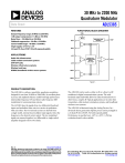 30 MHz to 2200 MHz Quadrature Modulator ADL5385 Data Sheet FEATURES FUNCTIONAL BLOCK DIAGRAM Output frequency range: 30 MHz to 2200 MHz 1 dB output compression: 11 dBm @ 350 MHz Noise floor: –159 dBm/Hz @ 350 MHz Sideband suppression: −50 dBc @ 350 MHz Carrier feedthrough: −46 dBm @ 350 MHz Single supply: 4.75 V to 5.5 V 24-lead, Pb-free LFCSP_VQ with exposed paddle APPLICATIONS ENBL BIAS IBBP TEMPERATURE SENSOR TEMP IBBN LOIP Radio-link infrastructure Cable modem termination systems UHF/VHF radio Wireless infrastructure systems Wireless local loop WiMAX/broadband wireless access systems DIVIDE-BY-2 QUADRATURE PHASE SPLITTER VOUT LOIN 06118-001 QBBP QBBN Figure 1. PRODUCT DESCRIPTION The ADL5385 is a silicon, monolithic, quadrature modulator designed for use from 30 MHz to 2200 MHz. Its excellent phase accuracy and amplitude balance enable both high performance intermediate frequency (IF) and direct radio frequency (RF) modulation for communication systems. The AD5385 takes the signals from two differential baseband inputs and modulates them onto two carriers in quadrature with each other. The two internal carriers are derived from a single-ended, external local oscillator input signal at twice the frequency as the desired carrier output. The two modulated signals are summed together in a differential-to-single-ended amplifier designed to drive 50 Ω loads. Rev. A The ADL5385 can be used as either an IF or a direct-to-RF modulator in digital communication systems. The wide baseband input bandwidth allows for either baseband drive or drive from a complex IF. Typical applications are in radio-link transmitters, cable modem termination systems, and broadband wireless access systems. The ADL5385 is fabricated using the Analog Devices, Inc., advanced silicon germanium bipolar process and is packaged in a 24-lead, Pb-free LFCSP_VQ with exposed paddle. Performance is specified over –40°C to +85°C. A Pb-free evaluation board is also available. Document Feedback Information furnished by Analog Devices is believed to be accurate and reliable. However, no responsibility is assumed by Analog Devices for its use, nor for any infringements of patents or other rights of third parties that may result from its use. Specifications subject to change without notice. No license is granted by implication or otherwise under any patent or patent rights of Analog Devices. Trademarks and registered trademarks are the property of their respective owners. One Technology Way, P.O. Box 9106, Norwood, MA 02062-9106, U.S.A. Tel: 781.329.4700 ©2006–2012 Analog Devices, Inc. All rights reserved. Technical Support www.analog.com ADL5385 Data Sheet TABLE OF CONTENTS Features .............................................................................................. 1 Basic Connections .......................................................................... 15 Applications ....................................................................................... 1 Optimization ............................................................................... 15 Functional Block Diagram .............................................................. 1 Applications..................................................................................... 17 Product Description ......................................................................... 1 DAC Modulator Interfacing ..................................................... 17 Revision History ............................................................................... 2 155 Mbps (STM-1) 128 QAM Transmitter ............................. 18 Specifications..................................................................................... 3 CMTS Transmitter Application ................................................ 18 Absolute Maximum Ratings ............................................................ 7 Spectral Products from Harmonic Mixing ............................. 19 ESD Caution .................................................................................. 7 RF Second-Order Products ....................................................... 19 Pin Configuration and Functional Descriptions .......................... 8 LO Generation Using PLLs ....................................................... 20 Typical Performance Characteristics ............................................. 9 Transmit DAC Options ............................................................. 20 Circuit Description ......................................................................... 14 Modulator/Demodulator Options ........................................... 20 Overview...................................................................................... 14 Evaluation Board ............................................................................ 21 LO Interface................................................................................. 14 Characterization Setup .................................................................. 23 V-to-I Converter ......................................................................... 14 SSB Setup ..................................................................................... 23 Mixers........................................................................................... 14 Outline Dimensions ....................................................................... 24 D-to-S Amplifier......................................................................... 14 Ordering Guide .......................................................................... 24 Bias Circuit .................................................................................. 14 REVISION HISTORY 10/12—Rev. 0 to Rev. A Added 30 MHz Output Frequency (Throughout) ....................... 1 Changes to Applications Section .................................................... 1 Changes to Table 1 ..................................................................