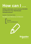 How can I … Utilize telemetry and remote SCADA architecture for distributed infrastructure? System Technical Note PlantStruxure Reference Architecture Design Your architecture Important Information People responsible for the application, implementation and use of this document must make sure that all necessary design considerations have been taken into account and that all laws, safety and performance requirements, regulations, codes, and applicable standards have been obeyed to their full extent. Schneider Electric provides the resources specified in this document. These resources can be used to minimize engineering efforts, but the use, integration, configuration, and validation of the system is the user‟s sole responsibility. Said user must ensure the safety of the system as a whole, including the resources provided by Schneider Electric through procedures that the user deems appropriate. Notice This document is not comprehensive for any systems using the given architecture and does not absolve users of their duty to uphold the safety requirements for the equipment used in their systems, or compliance with both national or international safety laws and regulations. Readers are considered to already know how to use the products described in this document. This document does not replace any specific product documentation. The following special messages may appear throughout this documentation or on the equipment to warn of potential hazards or to call attention to information that clarifies or simplifies a procedure. The addition of this symbol to a Danger or Warning safety label indicates that an electrical hazard exists, which will result in personal injury if the instructions are not followed. This is the safety alert symbol. It is used to alert you to potential personal injury hazards. Obey all safety messages that follow this symbol to avoid possible injury or death. DANGER DANGER indicates an imminently hazardous situation which, if not avoided, will result in death or serious injury. Failure to follow these instructions will result in death or serious injury. 2 © 2012 Schneider Electric All Rights Reserved WARNING WARNING indicates a potentially hazardous situation which, if not avoided, can result in death or serious injury. Failure to follow these instructions can cause death, serious injury or equipment damage. CAUTION CAUTION indicates a potentially hazardous situation which, if not avoided, can result in minor or moderate injury. Failure to follow these instructions can result in injury or equipment damage. NOTICE NOTICE is used to address practices not related to physical injury. Failure to follow these instructions can result in equipment damage. Note: Electrical equipment should be installed, operated, serviced, and maintained only by qualified personnel. No responsibility is assumed by Schneider Electric for any consequences arising out of the use of this material. A qualified person is one who has skills and knowledge related to the construction, operation and installation of electrical equipment, and has received safety training to recognize and avoid the hazards involved. Before You Begin This automation equipment and related software is used to control a variety of industrial processes. The type or model of automation equipment suitable for each application will vary depending on factors such as the control function required, degree of protection required, production methods, unusual conditions and government regulations and so on. In some applications more than one processor may be required when backup redundancy is needed. Only the user can be aware of all the conditions and factors present during setup, operation and maintenance of the solution. Therefore only the user can determine the automation equipment and the related safeties and interlocks which can be properly used. When selecting automation and control equipment and related software for a particular application, the user should refer to 3 © 2012 Schneider Electric All Rights Reserved the applicable local and national standards and regulations. The National Safety Council‟s Accident Prevention Manual also provides much useful information. Ensure that appropriate safeties and mechanical/electrical interlocks protection have been installed and are operational before placing the equipment into service. All mechanical/electrical interlocks and safeties protection must be coordinated with the related automation equipment and software programming. Note: Coordination of safeties and mechanical/electrical interlocks protection is outside the scope of this document. START UP AND TEST Following installation but before using electrical control and automation equipment for regular operation, the system should be given a start up test by qualified personnel to verify the correct operation of the equipment. It is important that arrangements for such a check be made and that enough time is allowed to perform complete and satisfactory testing. WARNING EQUIPMENT OPERATION HAZARD Follow all start up tests as recommended in the equipment documentation. Store all equipment documentation for future reference. Software testing must be done in both simulated and real environments. Failure to follow these instructions can cause death, serious injury or equipment damage. Verify that the completed system is free from all short circuits and grounds, except those grounds installed according to local regulations (according to the National Electrical Code in the USA, for example). If high-potential voltage testing is necessary, follow recommendations in the equipment documentation to prevent accidental equipment damage. Before energizing equipment: Remove tools, meters, and debris from equipment Close the equipment enclosure door Remove ground from incoming power lines Perform all start-up tests recommended by the manufacturer 4 © 2012 Schneider Electric All Rights Reserved OPERATION AND ADJUSTMENTS The following precautions a