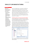 ORACLE DATA SHEET ORACLE FLOW MANUFACTURING KEY FEATURES ORACLE FLOW Oracle Flow Manufacturing is a comprehensive manufacturing MANUFACUTURING PROVIDES THE FOLLOWING software solution that supports demand driven flow and lean CAPABILITIES CRITICAL FOR manufacturing techniques designed to reduce product cycle times, A LEAN, MIXED MODEL MANUFACTURER: • Value stream mapping to identify opportunities for improvement • Line design to create balanced lines that support mixed model production of standard or configured product minimize inventories, simplify production, and improve product quality. These techniques provide manufacturing operations with the ability to quickly respond to changing customer needs in an ebusiness environment. Oracle Flow Manufacturing is part of the Oracle E-Business Suite, an integrated set of applications that are engineered to work together. • Sequencing and scheduling capabilities to produce directly to customer order • Pull-based, kanban replenishment chain to improve inventory turns • Synchronized component replenishment for configured or build to order components • Lean manufacturing execution workstation for operators to enable companies to move toward a paperless shop floor • Lean planning throughout the suite to support your lines during long term planning processes Understand and Improve Your Process with Value Stream Mapping Value Steam Mapping enables you to understand the business process, identify waste and look for opportunities for improvement. The Graphical Line Designer in Oracle Flow Manufacturing can be used to map out your current, as-is value streams, which can then be redesigned in to balanced line operations. The graphical workbench uses drag-and-drop techniques to select and associate processes and line operations with the detailed events required to build your product. This tool enables you to define and associate standard processes or operations with configurable models and product families, link the processes or operations to each other as primary, feeder, and/or rework. It enables you to identify events that are important to your total quality initiatives, and indicate which events are non-value added. You can associate your graphical, text or video work instructions to events. Figure 1: The Graphical Line Designer links operations to each other as primary, feeder, and/or rework processes 1 ORACLE DATA SHEET Reduce Cycle Time and Lower Cost with Line Design and Balancing Oracle Flow Manufacturing helps you reduce your product cycle times through line design and balancing. Reduced cycle time directly translates to reductions in cost by reducing the amount of work in process, the amount of component inventory, and the amount of rework and scrap. Reduced cycle times will also help you achieve ontime delivery of customer orders. You can design production lines to make one or more families of products. Oracle Flow Manufacturing lets you determine daily rates for mixed model production and plan for the optimal resources needed to balance production. In the Mixed Model Map Workbench you can view the line and operation takt and resource requirements based upon the demand chosen. You can view a comparison of the calculated suggested labor and machine resources with the actual assignments of resources to the line operations and across lines in the case of shared resources. You can view the takt time, process capability and effectiveness related to value added tasks based upon the actual assignments. This allows you to identify and resolve potential bottlenecks caused by production demand, line design and resource assignments. This also identifies specific areas where process improvement activities should be directed. It can be used in conjunction with the Graphical Line Designer to reorganize events into balanced line operations. You may use the mixed model map workbench to model what-if scenarios. Add or remove resources, change demands and product mix over time and determine what your future state should be. Figure 2: The Mixed Model Map Workbench calculates takt time and highlights imbalances Build to Demand with Sequencing and Scheduling The Flow Sequencer, the Line Scheduling Workbench and the Mixed Model Map Workbench provide planners and schedulers the ability to plan, simulate, and schedule production lines to meet actual customer demand. This functionality is anchored around the Line Scheduling Workbench from which the scheduler can perform tasks such as scheduling and component availability checking. For a given 2 ORACLE DATA SHEET line, all scheduled orders - WIP discrete jobs, repetitive schedules, and flow schedules - can be viewed in the workbench. The Line Scheduling Workbench provides a variety of rate based scheduling rules. They support a range of strategies, from tightly synchronizing supply to customer demand with no level loading to generating a mixed model schedule that repeats the lowest level recurring pattern that fulfills your customer demand. The rate based scheduling rules also provide sequencing criteria to prioritize the demand to be scheduled. The sequencing attributes include: Order Schedule Date, Order Promise Date, Order Request Date, Order Priority, and Order Entry Date. Figure 3: Flow Schedule Summary - Scheduled Customer Demand by Day Constraint based sequencing is provided by the Flow Sequencer. This functionality allows the user to specify what data attributes of a Sales Order, Planned Order, Item, Item Component or Routing will be used as constraining variables. These variables are then grouped and combined with constraint to from rules. These user defined rules are then used to model the logical and physical constraints of the production lines as demand is schedule to ensure the effective use of resources through the creation of balanced work loads on line operations. Figure 4: Constraint Based Scheduling Rule Reduce Inventory with Flexible Component Replenishment Oracle Flow Manufacturing has 