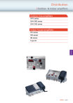 Distribution | Outdoor- & Indoor amplifiers Outdoor line amplifiers HFA series GHV 900 series GHV 500 series Indoor house amplifiers IFA series IFB series IIB series Distribution Type 02 TRIAX | 220 Distribution Amplifiers | HFA House Amplifier Series HFA Series Triax HFA mains powered amplifier - with variable return path. More and more communal aerialsystems are being upgraded tofull service systems which besides TV and radio programmes also can transmit interactiveservices like e.g. quick internet via cable modem, multimedia dialogue services and cabletelephony. Technical data Type: Art. No: HFA 602 amplifier 324602 HFA 603 amplifier 324603 HFA 604 amplifier 324604 Distribution Frequency range - forward Frequency range - return path (depending on modules) Gain Gain adjustable Gain return path Number of inputs MHz MHz 73-862 5-65 73-862 5-65 73-862 5-65 dB dB dB pcs. 22 0 - 20 passive -1.0/active 17.0 1 30 0 - 20 passive -1.0/active 17.0 1 40 0 - 20 passive -1.0/active 17.0 1 Number of outputs pcs. 1 1 1 Noise figure Equalization dB dB < 8.5 (Typ. 7.5) 0-18 < 7.5 (Typ. 6.5) 0-18 < 7.0 (Typ. 6.0) 0-18 Linearity dB ± 1.0 ± 1.0 ± 1.0 Linearity - return dB ± 1.0 ± 1.0 ± 1.0 Return loss input (-1.5 dB/oct.) Return loss output (-1.5 dB/oct.) Return loss output return path Impedance Output level IMD 2, EN 50083-3 dB dB dB Ohm dBµV > 14.0 @ 40 MHz (min. 10) > 14.0 @ 40 MHz (min. 10) > 14.0 @ 5 - 65 MHz 75 > 14.0 @ 40 MHz (min. 10) > 14.0 @ 40 MHz (min. 10) > 14.0 @ 5 - 65 MHz 75 > 14.0 @ 40 MHz (min. 10) > 14.0 @ 40 MHz (min. 10) > 14.0 @ 5 - 65 MHz 75 112.0 112.0 112.0 Output level IMD 3, EN 50083-5 dBµV 118.0 118.0 118.0 Output level CSO @ 60 dB IMD dBµV 101.0 (1) 101.0 (1) 101.0 (1) Output level CTB @ 60 dB IMD dBµV 101.0 (1) 101.0 (1) 101.0 (1) 100.0 90.0 F-con F-con 230 ± 10% 100.0 90.0 F-con F-con 230 ± 10% 100.0 90.0 F-con F-con 230 ± 10% Mains powered Mains powered Mains powered Shielding efficiency VHF Shielding efficiency UHF RF connector - input RF connector - output Power supply dB dB VAC Power supply type Power consumption Operation temperature Housing protection class Dimension accessories (H x D x W) Weight Certification Remarks 221 | TRIAX W degrees IP mm kg 7.5 7.5 7.5 0...+55.0 0...+55.0 0...+55.0 65 65 65 145 x 70 x 170 145 x 70 x 170 145 x 70 x 170 1.325 1.325 1.325 CE CE CE (1) EN 50083 Part 3 CTB (Composite triple beat) @ 60 dB IMD, CENELEC-raster 42 channels Distribution Amplifiers | HFA House Amplifier Series HFA Series Triax HFA mains powered amplifier - with variable return path. More and more communal aerialsystems are being upgraded tofull service systems which besides TV and radio programmes also can transmit interactiveservices like e.g. quick internet via cable modem, multimedia dialogue services and cabletelephony. Technical data Art. No: Frequency range Frequency range - forward Gain Attenuation - adjustable RF connector - output Test point Weight Packing size MHz MHz dB dB dB kg pcs. MA 617 - return path amplifier MP 6587 diplex filter MP 6587T diplex filter MD 3047T diplex filter 324617 324683 324684 324682 5-65 87-862 5-65 87-862 5-30 47-862 0.03 2 F-con -20 0.05 2 F-con -20 0.05 2 5-65 17.0 0-20 1 TRIAX | 222 Distribution Type: Distribution Amplifiers | GLV Power Amplifier series GLV Power amplifier Reliable and flexibel for multi-dwelling systems (NE4 Networks). Mains Power feeding. Developed to comply with German cable operator specification requirements Technical data Type: GLV 865 C1 Power amplifier Art. No: Distribution Frequency range - forward (VHF I “off”, RP “on”) Frequency range - forward (VHF I “on”, RP “off”) Gain forward @ 862 MHz Gain forward - attenuator at input (2 dB step) Gain forward - interstage Gain return @ 60 MHz Gain return - at input Gain return - at output Attenuation forward - 40...862 MHz (VHF I:on) Attenuation forward - line equalizer (2...3 dB steps) Attenuation forward - line equalizer at input Attenuation return - 5...60 MHz Attenuation return - equalizer element interstage Noise figure - forward (VHF I “on”) Noise figure - return (VHF I “off”) Return loss @ 40 MHz (-1.5 dB/octave) Max. output level Output level IMD 2/IMD 3 @ 60 dB Output level CSO @ 60 dB IMD (42 ch) Slope 0/7 dB Output level CTB @ 60 dB IMD (42 ch) Slope0/7 dB Output level return IMD 2/IMD 3 @ 60 dB RF connector - input/output RF connector - Test point input: bi-directional RF connector - Test point output: directional Power supply Power consumption Operation temperature Protection class Housing protection class Dimension accessories (H x D x W) Weight Packing size Reference standards 223 | TRIAX 323124 MHz dB dB dB dB dB dB dB dB dB dB dB dB dB dB dBµV dBµV dBµV dBµV dBµV dB dB V W degrees IP mm kg pcs. Distribution Amplifiers | GHV Amplifier Series GHV High-performance amplifier for small to mid-sized buildings with active/passive return path The GHV 900 amplifier series features a switchable active/passive return path with 26/32 dB without power loss. 16 step rotary switches and jumpers enable the reliable, uninterruptible and reproduceable setting of attenuation, equalization and cable simulation. Measurement ports at input and output also help to level out the forward path. Type: Art. No: Frequency range - forward (VHF I “off”, RP “on”) Frequency range - forward (VHF I “on”, RP “off”) Frequency range - return path Gain (1006MHz) Gain return path Gain return @ 60 MHz Attenuation Attenuation - interstage Attenuation forward - line equalizer at input Attenuation return - 5...60 MHz Attenuation return - equalizer element interstage Slope Slope - interstage Noise figure Noise figure - forward (VHF I “on”) Output level CSO @ 60 dB IMD Output level CTB @ 60 dB IMD Output level return path RF connector - input RF connector - output RF connector - Test point input: bi-directional RF connector - Test point output: directional Power supply (50-60 Hz) MHz MHz MHz dB dB GHV 920 amplifier w/return path GH
