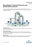 Product Data Sheet PS-00232, Rev T June 2016 Micro Motion® Technical Overview and Specification Summary Emerson’s world-leading Micro Motion® Coriolis flow and density measurement devices have set the standard for superior measurement technology. Micro Motion truly offers the best measurement solutions for any process challenge. Technology Leadership Micro Motion is committed to technology innovations that deliver the highest-performing solutions for your complex measurement challenges. Widest breadth of products Micro Motion has the widest range of flow and density measurement devices for virtually any process, application, or fluid. A wide variety of wetted materials, line sizes, and an extensive range of output options enable optimal system integration. Unparalleled value Benefit from expert field and technical application service and support made possible from more than one million meters installed worldwide and over 30 years of flow and density measurement experience. Technical Overview and Specification Summary June 2016 Micro Motion Coriolis flow and density meters ELITE T-Series Peak performance Coriolis meter Ultimate real world performance Best fit-for-application Superior measurement confidence Straight tube full-bore Coriolis meter Superior flow measurement in a single straight tube flow meter Comprehensive hygienic application coverage Superior reliability F-Series R-Series High performance compact drainable General purpose flow-only Coriolis meter Simple to install and easy to use Coriolis flow measurement Broadest range of application coverage Superior reliability H-Series LF-Series Coriolis meter Best flow and density measurement in a compact, drainable flow meter Broadest range of application coverage Superior reliability and safety Hygienic compact drainable Coriolis meter Best flow and density measurement in a compact hygienic flow meter Comprehensive hygienic application coverage Superior reliability Extreme low-flow Coriolis meter Highest precision miniaturized flow meter Scalable platform for the most demanding low-flow applications Superior reliability CNG-Series Compressed Natural Gas (CNG) Coriolis meter Specifically designed for both light and heavy duty vehicle dispensers Custody transfer approved Compact design with no moving parts, special mounting, or flow conditioning required Contents Micro Motion Coriolis flow and density meters.............. 2 Flow and density meter specifications ...........................3 Micro Motion transmitters and controllers ....................5 Transmitter and controller specifications ......................6 Micro Motion density meters .........................................9 Density meter specifications .......................................10 Performance specifications .........................................14 Reference operating conditions ..................................14 Accuracy and repeatability on liquids and slurries ........14 2 Accuracy and repeatability on gases ........................... 14 Liquid flow rates .......................................................... 15 Gas flow rates ............................................................. 17 Liquid density accuracy and repeatability ................... 19 Gas density/specific gravity accuracy and repeatability 19 Temperature accuracy ................................................ 20 Viscosity accuracy and repeatability ............................ 20 Temperature rating .................................................... 20 Process pressure ratings ............................................. 21 www.micromotion.com Technical Overview and Specification June 2016 Flow and density meter specifications Application type ELITE® CNG-Series F-Series H-Series LF-Series R-Series T-Series ● ● ● ● ● ● ● ● ◐ ● ● ◐ ● ● ● ● ● ● R-Series T-Series Continuous control Batching / loading / blending Custody transfer ● Supported on all models ◐ Supported on some models Measurement accuracy ELITE® Liquid Mass Flow F-Series ±0.05% Liquid Volume Flow H-Series ±0.10% 3 Liquid Density Gas Mass Flow CNG-Series LF-Series ±0.10% 3 ±0.50% 3 ±0.0002 g/cm (±0.2 kg/m3) ±0.0005 g/cm (±0.5 kg/m3) ±0.0005 g/cm (±0.5 kg/m3) ±0.05% ±0.10% ±0.10% ±0.50% ±0.50% ±0.25%*/±0.35% ±0.50% ±0.40% 3 ±0.15% ±0.003 g/cm (±3.0 kg/m3) ±0.002 g/cm3 (±2.0 kg/m3) ±0.40% ±0.25% ±0.50% ±0.75% ±0.50% LF-Series R-Series T-Series ● ● ● ±0.005 g/cm (±5.0 kg/m3) 3 Capabilities ELITE® CNG-Series F-Series H-Series ● ● Sanitary / hygienic ◐ ◐ ● ● Two-phase flow / Entrained gas ● ◐ ◐ Smart Meter Verification ● ◐ ◐ ◐ ● ◐ ◐ ◐ ● Self-draining High temperature High pressure Cryogenic ● Supported on all models ◐ ● ◐ Supported on some models Wetted materials 300-series stainless steel Super Duplex Nickel Alloy C22 ELITE® CNG-Series F-Series H-Series LF-Series R-Series ● ◐ ● ● ● ● ● ● Supported on all models www.micromotion.com ● ● Titanium ● T-Series ◐ Supported on some models 3 Technical Overview and Specification Summary June 2016 Fits nominal line sizes ELITE® CNG-Series Inches 1 /14–14 1 Millimeters 1–350 15–20 4 /2– /4 3 F-Series /4–4 1 8–100 H-Series /4–3 LF-Series R-Series /32– /4 1 0.8–8 8–50 8–50 1 8–80 1 /4–2 T-Series 1 1 /4–2 www.micromotion.com Technical Overview and Specification June 2016 Micro Motion transmitters and controllers 1500/2500 2200S 1700/2700 2400S FMT EtherNet I/P Module Compact control-room transmitter DIN rail mount with flexible installation options Wide variety of I/O and application capabilities to fit your needs Versatile field-mount transmitter Integral and remote mount options Wide variety of I/O and application capabilities to fit your needs Available with a full stainless steel housing for harsh environments Compact filling and dosing transmitter Easy-to-clean, hygienic design that enables SIP/CIP Hig