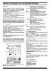 INSTRUCTION MANUAL FOR ARC WELDING MACHINE IMPORTANT!!! READ THIS MANUAL CAREFULLY BEFORE INSTALLING, USING, OR SERVICING THE WELDING MACHINE, PAYING SPECIAL ATTENTION TO SAFETY RULES. CONTACT YOUR DISTRIBUTOR IF YOU DO NOT FULLY UNDERSTAND THESE INSTRUCTIONS. 1 INSTALLATION This machine must be used for welding only. In any case, it is essential to pay special attention to the chapter on SAFETY PRECAUTIONS. The symbols next to certain paragraphs indicate points requiring extra attention, practical advice or simple information. This manual must be kept carefully in a place familiar to everyone involved in using the machine. It must be consulted whenever doubts arise and be kept for the entire life-span of the machine; it will also be used for ordering spare parts. 1.1 PLACEMENT Unpack the machine and place it in an adequately ventilated area, dust-free if possible, taking care not to block the air intake and outlet from the cooling slots. CAUTION: REDUCED AIR CIRCULATION causes overheating and could damage internal parts. Keep at least 500 mm of free space around the device. Never place any filtering device over the air intake points of this welding machine. The warranty shall become void if any type of filtering device is used. 2 GENERAL DESCRIPTIONS 2.1 SPECIFICATIONS This welding machine is a constant direct current power source, created by the INVERTER technology, designed for welding with coated electrodes and with the TIG procedure. 2.2 EXPLANATION OF TECHNICAL SPECIFICATIONS N°. .......... Serial number which must be stated for any demands relating to the welding machine. 1~ f Single-phase static frequency converter-tranf sformer-rectifier. Drooping characteristic. SMAW. ... Suitable for welding with coated electrodes. U0. ........... Secondary no-load voltage (Peak value) X. ............ Duty cycle percentage The duty cycle expresses the percentage of 10 minutes in which the welding machine can operate at a determined current,without over heating. I2. ............ Welding current U2. ........... Secondary voltage with welding current I2 U1. ........... Rated supply voltage 1~50/60Hz Single-phase supply 50 or 60 Hz I1. ............ Input current at the corresponding welding current I2. IP23. ....... Grade of protection of frame Grade 3 as a second digit means that this unit is fit to work outside under the rain. S. ........... Fit to work in high-risk areas. 1 2 NOTES:. ... In addition, the welding machine has been designed to work in areas with grade 3 of pollution. (see IEC 664) 2.3 DESCRIPTION OF PROTECTIONS 2.3.1 Thermic protection This unit is protected by a usually closed thermostat (25) placed on the dissipator. When the thermostat intervenes, the machine stops supplying current, but the ventilator continues to work. The intervention of the thermostat is indicated by the led turning on (B) fig.2. Do not switch the machine off before the led has turned off. 2.3.2 Blocking protection This protection is located on the transformer primary and turns on in the event of anomalies in the electronic power section. The intervention of this protection is indicated by the led lighting up (C) fig.2. If the light should turn on, turn welding machine off and try turning it on again. If led should light up again, take it to the nearest service center. When you turn the machine off, the led (C) flashes for a few seconds. Wait at least 10 seconds before opening the machine or turning it on again. 3 INSTALLATION 3.1 STARTUP This unit must be installed by skilled personnel. All fittings must be in conformity with the existing rules and in full compliance with safety regulations. (CENELEC HD 427). 3.2 UNIT DESCRIPTION IEC 974.I. The welder is manufactured according to this EN 60947.I international standard. A) Current regulating knob B) Led thermostat intervention C) Led block D) Negative output terminal E) Positive output terminal F) Switch G) Mains cable 7 Fig. 2 green wire of the mains cable is connected to the earth plug pin. • The capacity of magnetothermic switch or fuses in series with mains supply should be equal to current I1 absorbed by the unit. • Input current I1 is determined by reading the techinical specifications on unit i.e. power supply voltage U1 available. • Any extensions should have adequate sections for input current I1. • Turn machine on with switch (8) fig.2. WARNING: ELECTRIC SHOCK CAN KILL. • Do not touch live electric parts. • Do not touch weld output terminals when unit is energized. • Do not touch torch or electrode holder and earth clamp at the same time. • Regulate current based on the diameter of the electrode, welding position and type of joint to be carried out. When finished welding, always remember to turn unit off, and to remove electrode from electrode holder. 3.5 TIG WELDING 3.3 GENERAL NOTES Before using this welding machine, carefully read the CENELEC standards HD 407 and HD 433 also check insulation of cables, electrode holder clamp, sockets and plugs and that the section and length of welding cables are compatible with current used. Up to 5 mt. use 16 mm2 From 5 to 20 mt, use 25 mm2 From 20 to 30 mt. use 35 mm2 3.4 COATED ELECTRODE WELDING • This welding machine is fit to weld all types of electrodes except the cellulose type (AWS 6010) • Use electrode holder clamps in compliance with the safety standards and without projecting tightening screws. • Make sure that switch (F) fig. 2 is in 0 position or not inserted in supply socket then connect welding cables in accordance with polarity demanded by the electrode manufacturer which you will be using. Connect the earth cable clamp to the workpiece. VERY IMPORTANT: To secure a proper working of this machine and to avoid current drops make sure that the clamp seals with the workpiece. • Welding circuit should not be deliberately placed in direct or indirect contact with protection wire if not in the workpiece. • If earthing is deliberately made on the workpiece by means of protect