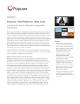 DATA SHEET Polycom® RealPresence® Web Suite The advanced way to collaborate­—simply with a web browser Where we work and how we collaborate are rapidly changing. People work wherever their creativity and ideas come together. A future without boundaries has arrived, making it possible to defy distance and collaborate regardless of location or whether inside or outside the organization. Flexible workspaces have become the norm. Teams want to innovate and collaborate naturally with rich content sharing capabilities that bring new ideas to life, and integrate with their everyday workflows. Until now, secure enterprise-grade collaboration has been available only within the company firewall. But with Polycom RealPresence Web Suite, a new level of collaboration is here–bringing with it an exceptional voice, video, and content sharing experience all through your web browser–easily and naturally. Polycom RealPresence Web Suite is an innovative and powerful web collaboration solution providing universal access for distributed workforces, enterprise-grade B2B video collaboration, and B2C video conferencing. Making collaboration powerful and easy RealPresence Web Suite lets you arrange impromptu or scheduled meetings by automatically sending invitations including attached documents and a web link for simple click-to-connect convenience. Once in the meeting, RealPresence Web Suite opens a world of collaboration. Advanced features include high resolution multi-stream document share, whiteboard, blackboard, and annotation. Anyone can present and annotate making meetings more interactive and productive. Since multiple documents can be viewed simultaneously, collaborating is more natural in typical workflows. Content-only mode gives participants the ability to join with audio/ video on a room system while also viewing content and roster on their personal desktop/tablet. For smaller meetings, a WebRTC mesh call provides a cost effective solution that will auto escalate to a bridge if a non-WebRTC endpoint joins the call. With a browser and web camera, RealPresence Web Suite makes it easy to extend video collaboration to anyone, anywhere on a PC, tablet, or smartphone. It includes integration with Microsoft Active Directory, so you can quickly and easily invite contacts into a Polycom-powered, secure video collaboration meeting. And with Polycom RealPresence Media Suite, you can record the meeting with just a click. Benefits • Invite anyone, anywhere to join using a browser with high quality voice, video, and content sharing • Attach multiple documents when organizing meetings or simply upload during the meeting • Anyone can share, compare, and annotate documents simultaneously or can use desktop and application sharing • Small meetings are optimized with a WebRTC mesh call, and auto escalate to bridge when needed • Ideal for both internal and external meetings with access to all your B2B and B2C contacts • Collaborate seamlessly with others using Polycom mobile, desktop, and room systems while recording the meeting DATA SHEET Polycom® RealPresence® Web Suite Collaborate without boundaries Bringing people together face-to-face over distances to collaborate improves communication, builds relationships, increases productivity, and reduces cost. RealPresence Web Suite can facilitate faster decision making, help integrate diverse teams, and cost effectively extend collaboration, along with voice and video communication to partners and customers—confidently, and with the same enterprise-grade quality and experience that all Polycom mobile, desktop, and room system solutions provide. WebRTC (Pro version only) • Video VP8 • Audio Opus • VGA Resolution (640X480) • Bridged Mode–hosted on Polycom® RealPresence Collaboration Server Virtual Edition • Bridged Mode–AVC Layout • RealPresence Collaboration Server VE can support max 30 concurrent connections Video • H.264 high profile AVC/SVC • Transmit/receive video -- Up to 720p/30 fps • Displayed up to full screen Audio • G.711U • G.711A • G.722.1C • Opus (Pro only) • Polycom® Siren® LPR • Acoustic Echo Cancelling (AEC) • Automatic Gain Control (AGC) Host and Participant controls • Scheduled and ad-hoc meetings with system generated VMR or personal VMR • Group chat • Video mute • Audio mute • Roster Control–Mute All, Mute a Participant, Delete a Participant, Promote a user from Guest to Participant or Chairperson, Participant to Chairperson RealPresence Web Suite is available in two versions. RealPresence Web Suite Pro provides enhanced features including WebRTC and HTML5 multiple-document content sharing with annotation in addition to the standard feature set. RealPresence Web Suite is a part of holistic solution that leverages core capabilities of the Polycom® RealPresence® Platform providing the highest interoperability, scalability, and reliability. Content Sharing • HTML5 (Pro version only) -- Attach documents Pre-Meeting or In Meeting -- Supported document types for attach: ȇȇ Adobe PDF files (.pdf) ȇȇ Microsoft PowerPoint files (.ppt and .pptx) ȇȇ Microsoft Word files (.doc and .docx) ȇȇ Common image files (.jpg, .png, .gif, .bmp, and .svg) ȇȇ Only files with English text supported -- Whiteboard and Blackboard -- Annotating • BFCP -- Up to HD/720p/5 fps • Share desktop or application • Dual monitor display -- Experiences Portal–2 virtual cores, 8 GB RAM, 100 GB Storage • RealPresence Web Suite Pro License -- Services Portal–8 virtual cores, 8 GB RAM, 100 GB Storage -- Experiences Portal–8 virtual core, 16 GB RAM, 100 GB Storage -- Standards Connector–4 virtual cores, 8 GB RAM, 100 GB Storage -- vSphere 5.5, 5.0 or 5.1 -- Windows Hyper–V Server 2012 & Hyper–V 2012 R2 Minimum Windows PC requirements • Intel Core 2 Duo 2.5 GHz, or AMD equivalent • 2 GB RAM • Windows 8 or Windows 7 Minimum Mac Requirements • SIP security TLS+SRTP • Intel Core 2 Duo,