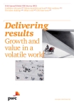 15th Annual Global CEO Survey 2012 &oQğGeQceGLsrupWeGp5/%DODQcLQJJOoEDODQGOocDOp9/5LsNresLOLeQcep16/ 7KeWDOeQWcKDOOeQJep20/:KDWłsQe[Wp27/&(2LQWervLewsp30 Delivering results Growth and value in a volatile world www.pwc.com/ceosurvey Most multinational companies have been adjusting, without fanfare, to the new global economic reality for some time. This year, CEOs have made clear that they are not backing away from global growth programmes but in fact are deepening their commitments to their most important markets. Among the CEOs we interviewed, whether based in Italy, Malaysia, the US or South Africa, the goal of delivering results by growing whole operations – not just sales – outside of their home base is the same. Preface We all know these are uncertain times. Stories of strengthening economies, employment improvements and breakthrough products from some parts of the world are offset by reports on natural disasters, government debt, regulatory changes and political turmoil in others. It’s hard to know for sure which way the wind is blowing. While change presents opportunity for some, most business thrives on stability – and the fact that this is elusive makes forward plans increasingly hard to develop. No wonder that conğdence is down from what we saw last year. Yet it’s still at a reasonably high level. Why? Because despite the uncertainties, the long-term trends that have encouraged corporations to invest in the emerging world, create innovation and develop talent remain ğrmly in place. These are ambitious agendas, which is somewhat surprising given economic uncertainties. How are CEOs going to make it happen? This year, we asked CEOs how they think their time is best spent, and two-thirds said they want to devote more attention to developing talent pipelines and meeting with customers (see Figure 1). Four years into the ğnancial crisis, we ğnd CEOs more grounded about the risks and changing conditions for growth. The focus on talent and customers today is a natural ‘next step’ towards establishing their organisations in the markets where they operate and building the trust needed for the business of tomorrow. That’s why so many CEOs are changing talent strategies to improve their ability to attract and retain the right people. Skills shortages are very real – just 12 of CEOs say they’re ğnding it easier to hire people in their industries – and the constraints are having Tuantiğable impacts on corporate growth. Just as our customers are changing rapidly, so are our workforces – and our talent needs are changing, too. I want to thank the more than 1,250 company leaders from 60 countries who shared their thinking with us. The success of the PwC Annual Global CEO Survey – now in its 15th year – is directly attributable to the candid participation of leaders around the world. The demands on their time are many and varied; we greatly appreciate their involvement. And I am particularly grateful to the 38 CEOs who sat down with us near the end of 2011 for more extensive conversations. Their thoughts added invaluable context to our Tuantitative ğndings. Dennis M. Nally Chairman, PricewaterhouseCoopers International 2 15th Annual Global CEO Survey 2012 Figure 1: CEOs’ personal priorities include spending more time with customers and developing leaders Q: Do you wish that you personally could spend more time, less time or the same amount of time on each of the following activities? Develop leadership and talent pipeline 66 Meet with customers 66 Improve organisational efficiency 57 Set strategy and manage risks 51 Develop operations outside of my home market 40 Personal time or community service 34 People Meet with regulators and policy makers Operations 5 Meet with lenders and providers of capital -4 Meet with the board and shareholders -5 Governance % Net priority (% of respondents reporting ‘More time’ minus % of respondents reporting ‘Less time’) Base: All respondents (1,258) Source: PwC 15th Annual Global CEO Survey 2012 I want to thank the more than 1,250 company leaders from 60 countries who shared their thinking with us. The success of the PwC Global CEO Survey – now in its 15th year – is directly attributable to the candid participation of leaders around the world. 15th Annual Global CEO Survey 2012 3 Contents Conğdence disrupted ........................................................ 5 Balancing global capabilities and local opportunities ..................................................... 9 Resilience to global disruptions and regional risks ............................................................ 16 The talent challenge ....................................................... 20 What’s next ..................................................................... 27 Final thoughts from our CEO interviews ......................... 30 Research methodology and key contacts ......................... 36 Acknowledgements ......................................................... 37 Related reading ............................................................... 38 4 15th Annual Global CEO Survey 2012 Confidence disrupted The year 2012 unfolds with wide disparities in potential outcomes in many economies, and little prospect of a coordinated turnaround. Just 15% of CEOs believe that the global economy will improve this year (see Figure 2). Incremental improvements in business optimism seen in the PwC 15th Annual Global CEO Survey over the past two years are reversing. In a sign of converging economic fortunes, conğdence declined in parallel among CEOs across all regions, except for the Middle East and Africa. Yet businesses are not on the defensive. CEOs are taking deliberate steps to improve their businesses’ resilience against further disruptions and to grow in the markets they believe are most important for their future. As a result, 0% are ‘very conğdent’ in prospects for revenue growth in their own companies in the next 12