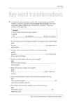 Fast Class Key word transformations Complete the second sentence so that it has a similar meaning to the first sentence, using the word given. Do not change the word given. You must use between two and five words, including the word given. There is an example at the beginning. Example: It hasn’t taken Sam long to learn Spanish. picked Sam ……...........................…………...........................… Spanish very quickly. has picked up 1 We must take as much advantage as possible of any opportunity to speak English. most We have ……...........................…………...........................…… any opportunity to speak English. 2 Honestly, I don’t mind where we go for our summer holidays. matter Honestly, ……...........................………...........................……… me where we go for our summer holidays. 3 Could you speak English when you were younger? able When you were younger, ……..……...........................…….........................…… speak English? 4 What’s the answer to sixteen minus eight? away If you ……..............……...........................…….............…… sixteen, what’s the answer? 5 Three hundred students entered the swimming competition last year. part Three hundred students ……...........................…………...........................…… the swimming competition last year. 6 The students will finish their English course at the end of June. have The English course ……...........................…………...........................…… the beginning of July. Key word transformations © Oxford University Press 1 Fast Class 7 There will be no more oil available in this area in 2030. run Oil supplies in this area ……...........................…………...........................…… by the year 2031. 8 My sister doesn’t like computer games very much. keen My sister ……...........................…………...........................…… computer games. 9 ‘Did you eat the chocolates?’ Maria said to Peter. asked Maria ……...........................…………...........................…… eaten the chocolates. 10 Bob hadn’t seen his uncle for several years. gone After several years ……...........................…………...........................…… , Bob saw his uncle again. 11 I needed a cup of coffee this morning but I didn’t have time for one. done I ……...........................…………...........................…… a cup of coffee this morning but I didn’t have time for one. 12 I’m not going to tolerate this untidiness any longer. up I have no intention ……...........................…………...........................…… this untidiness any longer. 13 We went for a walk although it was raining yesterday. spite We went for a walk ……...........................…………...........................…… yesterday. 14 I’m sure it will be raining tomorrow. bound It ……...........................…………...........................…… raining tomorrow. 15 Could I borrow some change for the telephone? lend Could ……...........................…………...........................…… some change for the telephone? 16 It’s ages since my sister and I had an argument. out My sister and I ……...........................…………...........................…… ages. Key word transformations © Oxford University Press 2 Fast Class 17 We are friends although we have disagreements about some things. despite We are friends ……...........................…………...........................…… disagree about some things. 18 Has John caught a cold? down Can you tell me if ……...........................…………...........................…… with a cold? 19 I was really bored by the film last night. found I ……...........................…………...........................…… last night. 20 I think it’s time the children went to bed now. had I think the children ……...........................…………...........................…… to bed now. 21 The problem we were faced with was a serious one. came The problem we ……...........................…………...........................…… was a serious one. 22 It was a mistake not to apply for the job. wish I ……...........................…………...........................…… for the job. 23 Being rich has no connection with being happy. nothing Being rich ……...........................…………...........................…… being happy. 24 I can’t wait to see the sights in London. forward I am ……...........................…………...........................…… the sights in London. 25 The tourist trade is much better now than it was last month. picked The tourist trade ……...........................…………...........................…… noticeably since last month. 26 Governments should preserve all the world’s languages. ought All the world’s languages ……...........................…………...........................…… governments. Key word transformations © Oxford University Press 3 Fast Class 27 The tennis players’ match is still going on. finished The tennis players ……...........................…………...........................…… yet. 28 What time does your plane land tomorrow? when Can you tell ……...........................…………...........................…… tomorrow? 29 The family always spent their holidays climbing in the mountains. used The family’s holidays ……...........................…………...........................…… climbing in the mountains. 30 Physical exercise won’t hurt you if you are careful. do Physical exercise won’t ……...........................…………...........................…… if you are careful. 31 How does a rock climber differ from a mountaineer? b