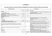 APPENDIX A TYPE AND DURATION OF PRECAUTIONS RECOMMENDED FOR SELECTED INFECTIONS AND CONDITIONS Infection/Condition Precautions Type * Duration † Abscess Draining, major Draining, minor or limited Acquired human immunodeficiency syndrome (HIV) Actinomycosis Adenovirus infection, in infants and young children (also, see gastroenteritis, adenovirus) Amebiasis C DI S S S D, C Pulmonary Aerosolizable spore-containing powder Antibiotic-associated colitis (see Clostridium difficile) S Postexposure chemoprophylaxis; consider post-exposure vaccine(407, 644, 645) Contact Precautions if large amount of drainage that cannot be contained S S AII,C Arthropod-borne viral encephalitides (eastern, western, Venezuelan equine encephalomyelitis; St Louis, California encephalitis; West Nile Virus) S Arthropod-borne viral fevers (dengue, yellow fever, Colorado tick fever) S Ascariasis S Aspergillosis S Avian influenza AII, D, C No dressing or containment of drainage; until drainage stops or can be contained by dressing Dressing covers and contains drainage DI Anthrax Cutaneous Comments DE 14 days after onset of 115 Until decontamination of environment complete (644) Not transmitted from person to person except rarely by transfusion, and for West Nile virus by organ transplant, by breastmilk or transplacentally (646);Install screens in windows and doors in endemic areas Use DEET-containing mosquito repellants and clothing to cover extremities Not transmitted from person to person except by transfusion, rarely Install screens in windows and doors in endemic areas Use DEET-containing mosquito repellants and clothing to cover extremities Not transmitted from person to person Contact Precautions and AII if massive soft tissue infection with copious drainage and repeated irrigations required (51) AII preferred (D if AII rooms unavailable); N95 respiratory protection (surgical mask if N95 unavailable); eye protection (goggles, face shield APPENDIX A TYPE AND DURATION OF PRECAUTIONS RECOMMENDED FOR SELECTED INFECTIONS AND CONDITIONS Infection/Condition Precautions Type * Duration † symptoms Comments Babesiosis Blastomycosis, North American, cutaneous or pulmonary Botulism S S S Bronchiolitis (see respiratory infections in infants and young children) C Brucellosis (undulant, Malta, Mediterranean fever) Campylobacter gastroenteritis (see gastroenteritis) Candidiasis, all forms including mucocutaneous Cat-scratch fever (benign inoculation lymphoreticulosis) S within 3 feet of patient); 14 days after onset of symptoms or until an alternative diagnosis is established or until diagnostic test results indicate that the patient is not infected with influenza A H5N1virus. Human-to-human transmission inefficient and rare, but risk of reassortment with human influenza strains and emergence of pandemic strain serious concern. Not transmitted from person to person except by transfusion, rarely. Not transmitted from person to person Not transmitted from person to person Use mask according to Standard Precautions and until influenza and adenovirus have been ruled out as etiologic agents Not transmitted from person to person S S Not transmitted from person to person Cellulitis S Chancroid (soft chancre) Chickenpox (see varicella) Chlamydia trachomatis Conjunctivitis Genital Respiratory Cholera (see gastroenteritis) Closed-cavity infection Open drain in place; limited or minor drainage No drain or closed drainage system in place Clostridium C. botulinum S C. difficile (also see gastroenteritis, C. difficile) DI S S S S S Contact Precautions if there is copious uncontained drainage S Not transmitted from person to person Assess need to discontinue antibiotics Avoid the use of shared electronic thermometers (519, 647). C DI 116 APPENDIX A TYPE AND DURATION OF PRECAUTIONS RECOMMENDED FOR SELECTED INFECTIONS AND CONDITIONS Infection/Condition Precautions Type * Duration † Comments Ensure consistent environmental cleaning and disinfection. C. perfringens Food poisoning Gas gangrene Coccidioidomycosis (valley fever) Draining lesions Pneumonia Colorado tick fever S S S Congenital rubella C Conjunctivitis Acute bacterial Chlamydia Gonococcal Acute viral (acute hemorrhagic) Corona virus associated with SARS (SARS-CoV) (see severe acute respiratory syndrome) Coxsackie virus disease (see enteroviral infection) Creutzfeldt-Jakob disease CJD, vCJD Croup (see respiratory infections in infants and young children) Cryptococcosis Cryptosporidiosis (see gastroenteritis) Cysticercosis Cytomegalovirus infection, neonatal or immunosuppressed Decubitus ulcer (pressure sore) infected S S Not transmitted from person to person Not transmitted from person to person Not transmitted from person to person Not transmitted from person to person Not transmitted from person to person Standard Precautions if nasopharyngeal and urine cultures neg. after Until 1 yr.of age 3 mos. of age S S S C DI S Use disposable instruments or special sterilization/disinfection for surfaces, objects contaminated with neural tissue if CJD or vCJD suspected and has not been R/O; No special burial procedures(4, 7, 103) S Not transmitted from person to person S S Not transmitted from person to person No additional precautions for pregnant HCWs Major C Minor or limited S DI 117 If no dressing or containment of drainage; until drainage stops or can be contained by dressing If dressing covers and contains drainage APPENDIX A TYPE AND DURATION OF PRECAUTIONS RECOMMENDED FOR SELECTED INFECTIONS AND CONDITIONS Infection/Condition Precautions Type Dengue fever Diarrhea, acute-infective etiology suspected (see gastroenteritis) Diphtheria Cutaneous Pharyngeal Ebola viral hemorrhagic fever (see viral hemorrhagic fevers) Echinococcosis (hydatidosis) Echovirus (see enteroviral infection) Encephalitis or encephalomyelitis (see specific etiologic agents) Endometritis Enterobiasis (pinworm disease, oxyuriasis) Enterococcus species (see multidrug-resistant organisms if epidemiologically significant