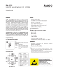 MGA-16216 Dual LNA for Balanced Application 1440 – 2350 MHz Data Sheet Description Features Avago Technologies’ MGA-16216 is an ultra low-noise high linearity amplifier pair with built-in active bias and shutdown features for balanced applications in the 1950 MHz band. Shutdown functionality is achieved using a single DC voltage input pin. High linearity is achieved through the use of Avago Technologies’ proprietary GaAs Enhancement-mode pHEMT process [1]. It is housed in a miniature 4.0 x 4.0 x 0.85 mm3 16-pin Quad Flat No-lead (QFN). The compact footprint coupled with ultra low noise and high linearity makes MGA-16216 an ideal choice for basestation transmitters and receivers. • Ultra Low Noise Figure For applications > 1950 MHz, it is recommended to use MGA-16316 1950-4000 MHz. For applications < 1450 MHz, it is recommended to use MGA-16116 450-1450 MHz. All 3 products share the same package and pin out configuration. • Gain: 18.4 dB Component Image • Shutdown voltage Vsd range > 1.5 V 4.0 x 4.0 x 0.85 mm3 16-Lead QFN Pin 13 Pin 14 Pin 15 Pin 16 Pin Configuration Pin Use Pin 1 Pin 12 Pin 2 Pin 11 Pin 17 Pin 3 Pin 10 Pin 9 Pin 8 Pin 7 Pin 6 Pin 5 Pin 4 VIEW FROM THE TOP • High IIP3: +17 dBm typ. • GaAs E-pHEMT Technology [1] • Small package size: 4.0 x 4.0 x 0.85 mm3 • RoHS and MSL1 compliant. Typical Performances 1950 MHz @ 4.8 V, 52.5 mA (typ per amplifier) • NF: 0.32 dB [2] • IIP3: 17.1 dBm • P1dB: 19.5 dBm • Total shutdown current (Vsd1, Vsd2 = 3 V): 4.8 mA Note: Package marking provides orientation and identification “16216 “ = Device Code “YYWW” = Date Code identifies year and work week of manufacturing “XXXX” =Last 4 digit of assembly lot number AVAGO 16216 YYWW XXXX • Variable Bias and Shutdown functionality •Basestation Transmitter and Receivers requiring balanced configuration • Ultra low-noise RF amplifiers. Notes: 1. Enhancement mode technology employs positive Vgs, thereby eliminating the need of negative gate voltage associated with conventional depletion mode devices. 2. Measured at RFin pin of packaged part, other losses deembedded. 3. Good RF practice requires all unused pins to be grounded. Pin Use 1 RFIN1 10 GND 2 GND 11 GND 3 GND 12 RFOUT1 4 RFIN2 13 Not used 5 Bias_out2 14 Bias_in1 6 Vsd2 15 Vsd1 7 Bias_in2 16 Bias_out1 8 Not used 17 GND 9 RFOUT2 Applications – – Attention: Observe precautions for handling electrostatic sensitive devices. ESD Machine Model = 60 V ESD Human Body Model = 300 V Refer to Avago Application Note A004R: Electrostatic Discharge, Damage and Control. Absolute Maximum Rating [1] TA = 25° C Thermal Resistance [3] Symbol Parameter Units Absolute Maximum Vdd Drain Voltage, RF output to ground V 5.5 Idd Drain Current mA 100 Vsd Shutdown Voltage V 5.5 Pin CW RF Input Power with LNA On dBm 27 Pin CW RF Input Power with LNA Off dBm 27 Pd Power Dissipation mW 550 Tj Junction Temperature °C 150 Tstg Storage Temperature °C -65 to 150 (Vd = 4.8 V, Idd = 52.5 mA, Tc =100° C) qjc = 43.1°C/W Notes: 1. Operation of this device is excess of any of these limits may cause permanent damage. 2. Source lead temperature is 25° C. Derate 23 mW/°C for Tc > 126° C. 3. Thermal resistance measured using 150° C Infra-Red Microscopy Technique. Electrical Specifications TA = 25° C, Vdd1 = Vdd2 = 4.8 V, Vsd1 = Vsd2 = 0 V at Rbias = 1 Kohm, RF performance at 1950 MHz, CW operation unless otherwise stated. Symbol Parameter and Test Condition Units Vdd Supply Voltage V Idd Total Supply Current per amplifier (Idq+Ibias) mA 44 52.5 65 Gain Gain dB 17.2 18.4 19.4 NF [1] Noise Figure dB 0.32 0.55 OP1dB Output Power at 1dB Gain Compression dBm IIP3 [2] Input Third Order Intercept Point dBm S11 Input Return Loss, 50 Ω source dB -9.0 S22 Output Return Loss, 50 Ω load dB -4.4 S12 Reverse Isolation dB -30 S31 Isolation between RFin1 and RFin2 dB -41.6 Vsd1,2 [3] Maximum Shutdown voltage required to turn ON LNA V 0.5 Vsd1,2 [3] Minimum Shutdown voltage required to turn OFF LNA V 2.0 Idq [4] Current at Vdd with Vsd = 0 V mA 48.5 Current at Vdd with Vsd = 3 V mA 0.378 Current at Vsd with Vsd = 0 V mA 4 Current at Vsd with Vsd = 3 V mA 0.176 Current at Vbias with Vsd = 0 V mA 3.0 Current at Vbias with Vsd = 3 V mA 4.542 Isd [4] Ibias [4] Notes: 1. Noise figure at the DUT RF Input pin, board losses are deembedded. 2. IIP3 test condition: FRF1-FRF2 = 1 MHz with input power of -20 dBm per tone. 3. Vsd1 and Vsd2 are active LOW. 4. Refer to Figure 6 for more details. 2 Min. Typ. Max. 4.8 19.5 14 17.1 Product Consistency Distribution Charts LSL 40 USL USL 45 50 55 60 65 Figure 1. Idd, LSL = 44 mA , nominal = 52.5 mA, USL = 65 mA 0.1 0.2 0.4 0.5 Figure 2. NF, nominal = 0.32 dB, USL = 0.55 dB LSL 14 0.3 LSL 15 16 17 Figure 3. IIP3, LSL = 14 dBm, nominal = 17.1 dBm 18 19 17 USL 17.5 18 18.5 19 19.5 Figure 4. Gain, LSL = 17.2 dB, nominal = 18.4 dB, USL = 19.4 dB Notes: 1. Distribution data sample size is 3000 samples taken from 6 different wafer lots. Future wafers allocated to this product may have nominal values anywhere between the upper and lower limits. 2. Circuit trace losses for NF have been de-embedded from measurements above. 3 Vdd1 Vdd2 Demo Board Schematic Vsd1 Vsd2 Demo Board Layout APRIL 2011 R9 C20 RFIN C3 C6 R3 C7 L3 C16 L2 C12 R6 C13 C24 C25 C8 R4 C23 C2 R1 C1 L1 R10 L4 C21 R8 MGA-16X16 Demoboard (4-Port) Rev 1 C9 C19 RFOUT R7 C22 C26 RO4350 DK 3.48 H 10mil W 0.58mm G 0.45mm Figure 6. Demo Board Schematic Diagram Figure 5. Demo Board Layout Diagram Notes: 1. Recommended PCB material is 10 mils Rogers RO4350. 2. Suggested component values may vary according to layout and PCB material. 3. Input board loss at 1950 MHz is 0.11dB 4. The schematic is shown with the assumption that similar PCB is used for all MGA-16116, MGA-16216 and MGA-16316. 5. Detail of the components needed for this product is shown in Table 1. 6. R1 and R6 are for low frequency stability. 7. Bias to each LNA is adjustable using R3 and R8 (see Figure 6). In