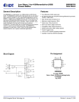 8S89832I Low Skew, 1-to-4 Differential-to-LVDS Fanout Buffer Data Sheet General Description Features The 8S89832I is a high speed 1-to-4 Differential-to-LVDS Fanout Buffer. The 8S89832I is optimized for high speed and very low output skew, making it suitable for use in demanding applications such as SONET, 1 Gigabit and 10 Gigabit Ethernet, and Fibre Channel. The internally terminated differential input and VREF_AC pin allow other differential signal families such as LVPECL, LVDS, and SSTL to be easily interfaced to the input with minimal use of external components. The device also has an output enable pin which may be useful for system test and debug purposes. The 8S89832I is packaged in a small 3mm x 3mm 16-pin VFQFN package which makes it ideal for use in space-constrained applications. • • Four differential LVDS output pairs • • • • • • • • • 50 internal input termination to VT IN, nIN input pairs can accept the following differential input levels: LVPECL, LVDS, SSTL Maximum output frequency: 2GHz Output skew: 25ps (maximum) Part-to-part skew: 200ps (maximum) Propagation delay: 550ps (maximum) Additive phase jitter, RMS: 0.09ps (typical) Full 2.5V supply mode -40°C to 85°C ambient operating temperature Available in lead-free (RoHS 6) package nQ0 16 15 14 13 12 IN 2 11 VT Q2 3 Q1 50Ω EN Q CLK 16-Lead VFQFN 3mm x 3mm x 0.925mm package body K Package Top View Q3 nQ3 ©2016 Integrated Device Technology, Inc 8 8S89832I nQ2 D 7 EN Q2 6 VDD 50Ω nIN 9 nIN 5 Q3 nQ1 VREF_AC 10 VREF_AC nQ2 4 nQ3 VT GND Q1 1 nQ1 IN Q0 nQ0 Q0 VDD Pin Assignment Block Diagram 1 Revision A January 27, 2016 8S89832I Data Sheet Table 1. Pin Descriptions Number Name 1, 2 Q1, nQ1 Output Type Differential output pair. LVDS interface levels. Description 3, 4 Q2, nQ2 Output Differential output pair. LVDS interface levels. 5, 6 Q3, nQ3 Output Differential output pair. LVDS interface levels. 7, 14 VDD Power Positive supply pins. Synchronizing clock enable. When LOW, Qx outputs will go LOW and nQx outputs will go HIGH on the next LOW transition at IN inputs. Input threshold is VDD/2V. Includes a 37k pullup resistor. Default state is HIGH when left floating. The internal latch is clocked on the falling edge of the input signal IN. See Table 3A LVTTL / LVCMOS interface levels. 8 EN Input Pullup 9 nIN Input 10 VREF_AC Output 11 VT Input Termination input. 12 IN Input Non-inverting differential clock input. 50 internal input termination to VT. 13 GND Power Power supply ground. 15, 16 Q0, nQ0 Output Differential output pair. LVDS interface levels. Inverting differential clock input. 50 internal input termination to VT. Reference voltage for AC-coupled applications. NOTE: Pullup refers to internal input resistors. See Table 2, Pin Characteristics, for typical values. Table 2. Pin Characteristics Symbol Parameter CIN Input Capacitance 2 pF RPULLUP Input Pullup Resistor 37 k ©2016 Integrated Device Technology, Inc Test Conditions 2 Minimum Typical Maximum Units Revision A January 27, 2016 8S89832I Data Sheet Function Tables Table 3A. Control Input Function Table Input Outputs EN Q[0:3] nQ[0:3] 0 Disabled; LOW Disabled; HIGH 1 Enabled Enabled NOTE: EN switches, the clock outputs are disabled or enabled following a falling input clock edge as shown in Figure 1. Figure 1. EN Timing Diagram EN VDD/2 VDD/2 tS tH nIN IN VIN → nQx tPD ← VOD Qx Table 3B. Truth Table Inputs Outputs IN nIN EN Q[0:3] nQ[0:3] 0 1 1 0 1 1 0 1 X X 0 1 0 (NOTE 1) 0 1 (NOTE 1) NOTE 1: On next negative transition of the input signal (IN). ©2016 Integrated Device Technology, Inc 3 Revision A January 27, 2016 8S89832I Data Sheet Absolute Maximum Ratings NOTE: Stresses beyond those listed under Absolute Maximum Ratings may cause permanent damage to the device. These ratings are stress specifications only. Functional operation of product at these conditions or any conditions beyond those listed in the DC Characteristics or AC Characteristics is not implied. Exposure to absolute maximum rating conditions for extended periods may affect product reliability. Item Rating Supply Voltage, VDD 4.6V Inputs, VI -0.5V to VDD + 0.5V Outputs, IO Continuous Current Surge Current 10mA 15mA Input Current, IN, nIN ±50mA VT Current, IVT ±100mA Input Sink/Source, IREF_AC ± 0.5mA Operating Temperature Range, TA -40°C to +85°C Package Thermal Impedance, JA, (Junction-to-Ambient) 74.7C/W (0 mps) Storage Temperature, TSTG -65C to 150C DC Electrical Characteristics Table 4A. Power Supply DC Characteristics, VDD = 2.5V ± 5%, TA = -40°C to 85°C Symbol Parameter VDD Positive Supply Voltage IDD Power Supply Current Test Conditions Minimum Typical Maximum Units 2.375 2.5 2.625 V 95 mA Table 4B. LVCMOS/LVTTL DC Characteristics, VDD = 2.5V ± 5%, TA = -40°C to 85°C Symbol Parameter VIH Input High Voltage VIL Input Low Voltage IIH Input High Current VDD = VIN = 2.625V IIL Input Low Current VDD = 2.625V, VIN = 0V ©2016 Integrated Device Technology, Inc Test Conditions 4 Minimum Maximum Units 1.7 VDD + 0.3 V -0.3 0.7 V 10 µA -150 Typical µA Revision A January 27, 2016 8S89832I Data Sheet Table 4C. Differential DC Characteristics, VDD = 2.5V ± 5%, TA = -40°C to 85°C Symbol Parameter Test Conditions Minimum Typical Maximum Units RIN Differential Input Resistance IN, nIN IN to VT, nIN to VT 40 50 60 VIH Input High Voltage IN, nIN 1.2 VDD V VIL Input Low Voltage IN, nIN 0 VIH – 0.15 V VIN Input Voltage Swing; NOTE 1 0.15 1.2 V VDIFF_IN Differential Input Voltage Swing 0.3 IIN Input Current; NOTE 2 VREF_AC Reference Voltage V IN, nIN VDD – 1.40 VDD – 1.35 35 mA VDD – 1.30 V NOTE 1: VIL should not be less than -0.3V. NOTE 2: Guaranteed by design. Table 4D. LVDS DC Characteristics, VDD = 2.5V ± 5%, TA = -40°C to 85°C Symbol Parameter VOD Differential Output Voltage VOD VOD Magnitude Change VOS Offset Voltage VOS VOS Magnitude Change Test Conditions Minimum Typical 247 1.125 Maximum Units 454 mV 50 mV 1.375 V 50 mV . AC Electrical Characteristics Table