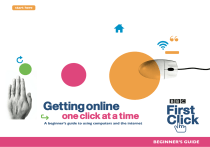 start here A beginner’s guide to using computers and the internet Beginner’s Guide click each section below Contents Introduction • Welcome 1. Using a computer 1.1 Switching on your computer 3 1.2 Using a mouse 5 1.3 Desktop and icons 10 1.4 Using a keyboard 16 2. Using the internet 2.1 What the internet is 21 2.2 Searching the internet 27 2.3 Staying safe online 32 3. Using email 3.1 Sending and receiving email 37 4. Further help for beginners 4.1 Jargon Buster – a glossary of useful terms 1 45 4.2 Know the basics? Want to learn more? 49 4.3 More places to get help 50 previous content page next Welcome If you think computers and the internet are not for you, you’re not alone. If you think you’re too old or too stupid to use it, you’re not alone. There are millions of people who feel the same way. Computers and the internet have become a part of everyday life – from staying in touch with friends and family and sharing photographs to booking holidays and doing your shopping online. It takes you step-by-step through the very basics like using a mouse and a keyboard, through to searching the internet and sending emails. To help you practise these new skills, a number of the topics include links to interactive activities on the BBC WebWise website. As your confidence grows, you will be able to download more topics from the First Click website to include in your guide. It really is easier than you think… so get ready to take your first click. It’s all really useful… if you know how! That is why the BBC has created this guide to help those people who have never used a computer or the internet to understand and enjoy the benefits they offer. Disclaimer: T he BBC has created First Click materials to help support local partners to run beginners’ courses to using computers and the internet. The courses where these materials will be used will not be run or delivered by the BBC. 1 previous content page next 1: Using a computer 1.1 Switching on your computer 1.2 Using a mouse 1.3 Desktop and icons 1.4 Using a keyboard “I really want to use the internet, but I need to get to grips with some computer basics 1: Using a computer previous content page next 1.1: Switching on your computer This is a basic introduction to different types of computers and how to switch them on. This section covers: •Switching on a computer •The difference between a desktop computer and a laptop 1. Using a computer To switch your computer on, you need to press the power button. 3 previous content page next 1.1: Switching on your computer The main difference between a desktop and a laptop is that a laptop is smaller and portable. Laptops also have a touchpad which can be used instead of a mouse but you can connect a mouse to a laptop if you prefer. Monitor Desktop computer Laptop Mouse Keyboard Touchpad 1. Using a computer 4 previous content page next 1.2: Using a mouse This section is all about the mouse and how you use it to control your computer. This section covers: •What a mouse is for •How to hold a mouse •How to use a mouse to select, open and move items on your computer What you need to have covered already: •Switching on your computer 1. Using a computer 5 previous content page next 1.2: Using a mouse What a mouse is for A mouse is one of the main ways to control your computer. Most mouse designs have two buttons – a left button and a right button. A mouse needs to be flat on a surface with the end with the buttons pointing towards the computer. Most people find it easier to position the mouse to the side of the keyboard. To hold the mouse you rest your hand over it and put your index finger on the left button and rest your thumb on the side. If you are left-handed you may find it easier to put the mouse on the left-hand side of your keyboard and use your middle finger for the left button. 1. Using a computer 6 previous content page next 1.2: Using a mouse What a mouse is for You only need to use the left button for this section. If you click on the right button – don’t worry. Just click on the left button again. 1. Using a computer When you move the mouse it moves a pointer or ‘cursor’ on the screen. The cursor will change shape depending on what you are doing. 7 previous content page next 1.2: Using a mouse Getting to know your mouse An arrow lets you select things and move them around. 1. Using a computer A hand lets you open a link on the internet. An hourglass (if using Windows Vista this will appear as a revolving circle) is asking you to wait while the computer does a task. 8 previous content page next 1.2: Using a mouse Using the mouse to do tasks You can use your mouse to do a variety of tasks – select things, open things and move things. To open things click twice on the left button – think ‘knock, knock’ on a door. To move things, you need to ‘drag and drop’. Hold down the left button as you ‘drag’ the mouse along. Let go of the button once you have positioned the item where you want it. You can practise your mouse skills with the BBC WebWise game, Clicky Mouse. Your course leader can help you find it and get started with the game. www.bbc.co.uk/firstclick To select things, move your cursor over the item, click once with the left button and let go. 1. Using a computer 9 previous content page next 1.3: Desktop and icons Getting to know your desktop and icons This section is all about explaining what you see when you turn your computer on. This section covers: •What you will find on your desktop •Where to find your start button, taskbar, menu bar and toolbar A desktop is what you see when the computer is turned on. When you open programs or files they appear on your desktop. From your desktop, you can use shortcuts to find files and programs on your computer. An icon represents a file, folder or program. Icons look different for each type of file or program. •How to move between windows •How to hide a window, make a window bigger and close